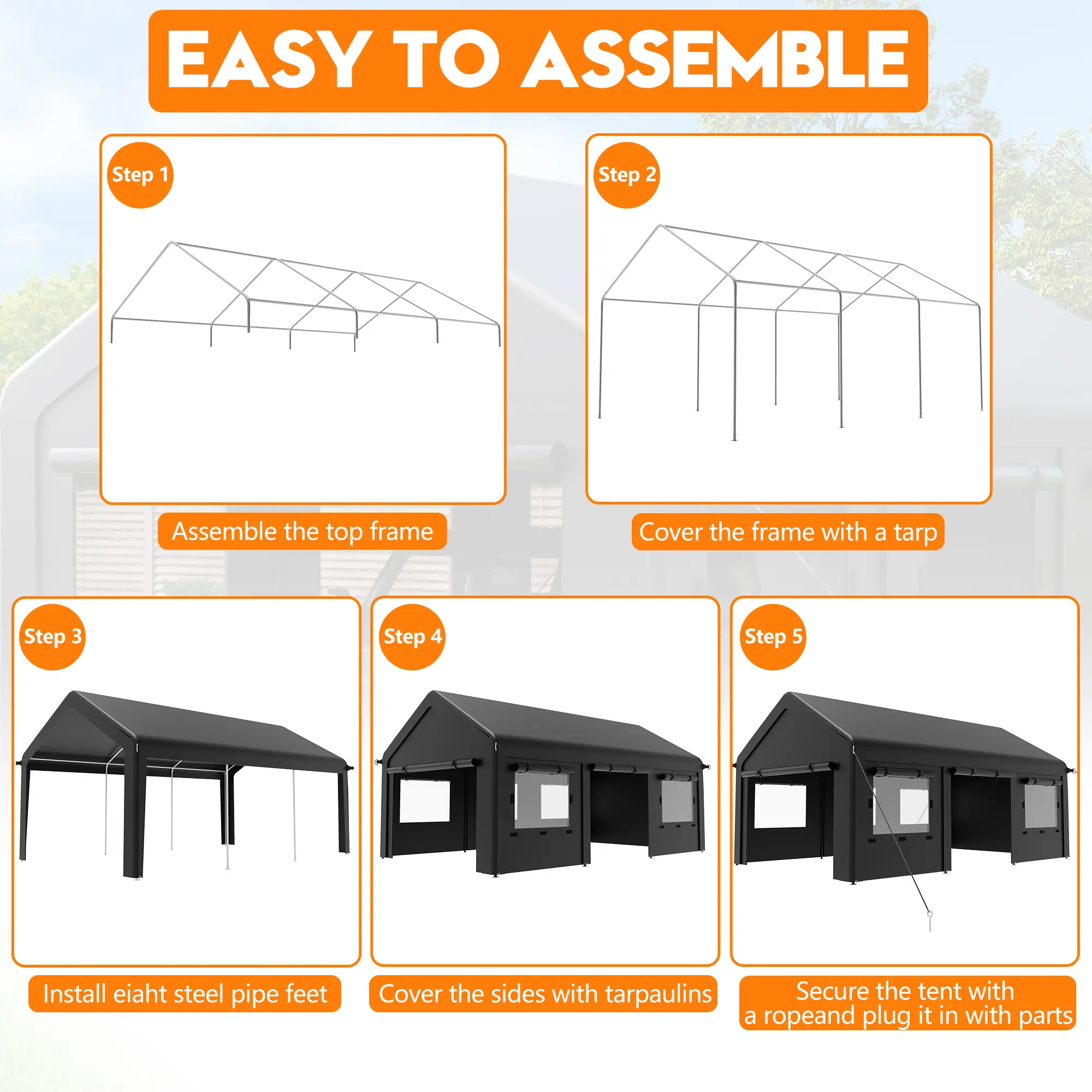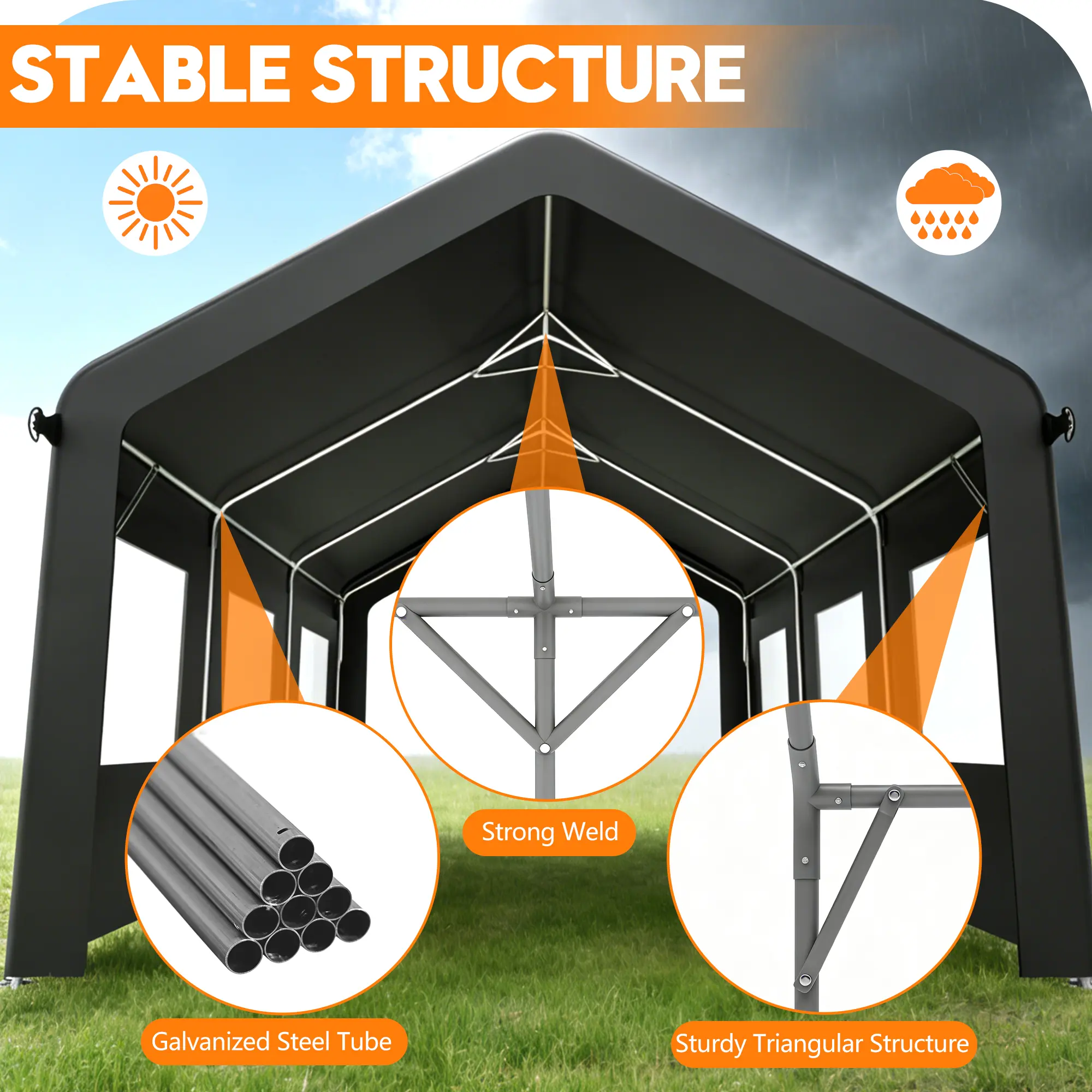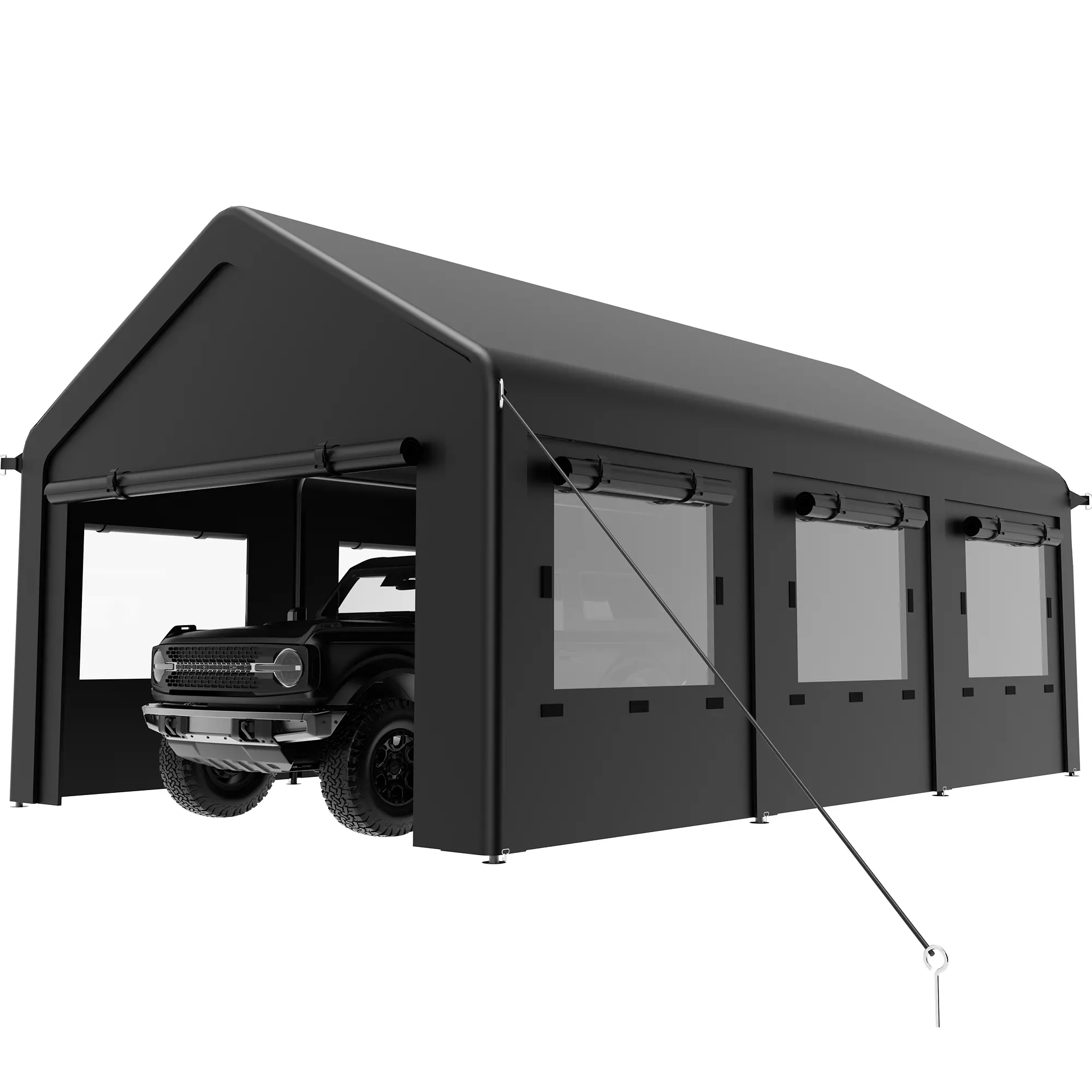 Made with PE fabric to help cover vehicles and outdoor items from sun, rain, and daily outdoor exposure. Suitable for driveways, backyards, farms, and other open outdoor spaces.