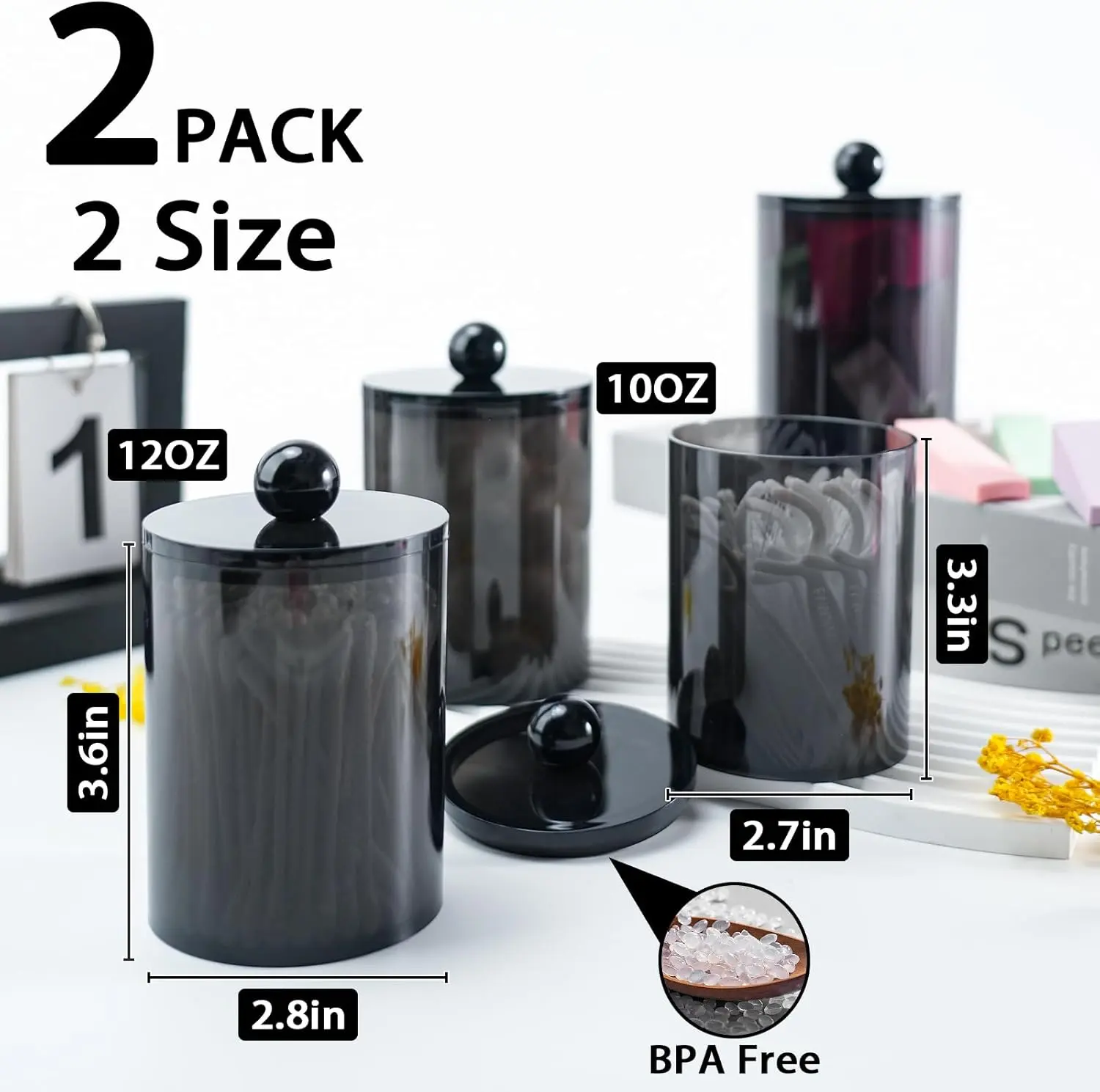 ·1 x 10 oz and 1 x 12 oz cotton swab jars with lids.