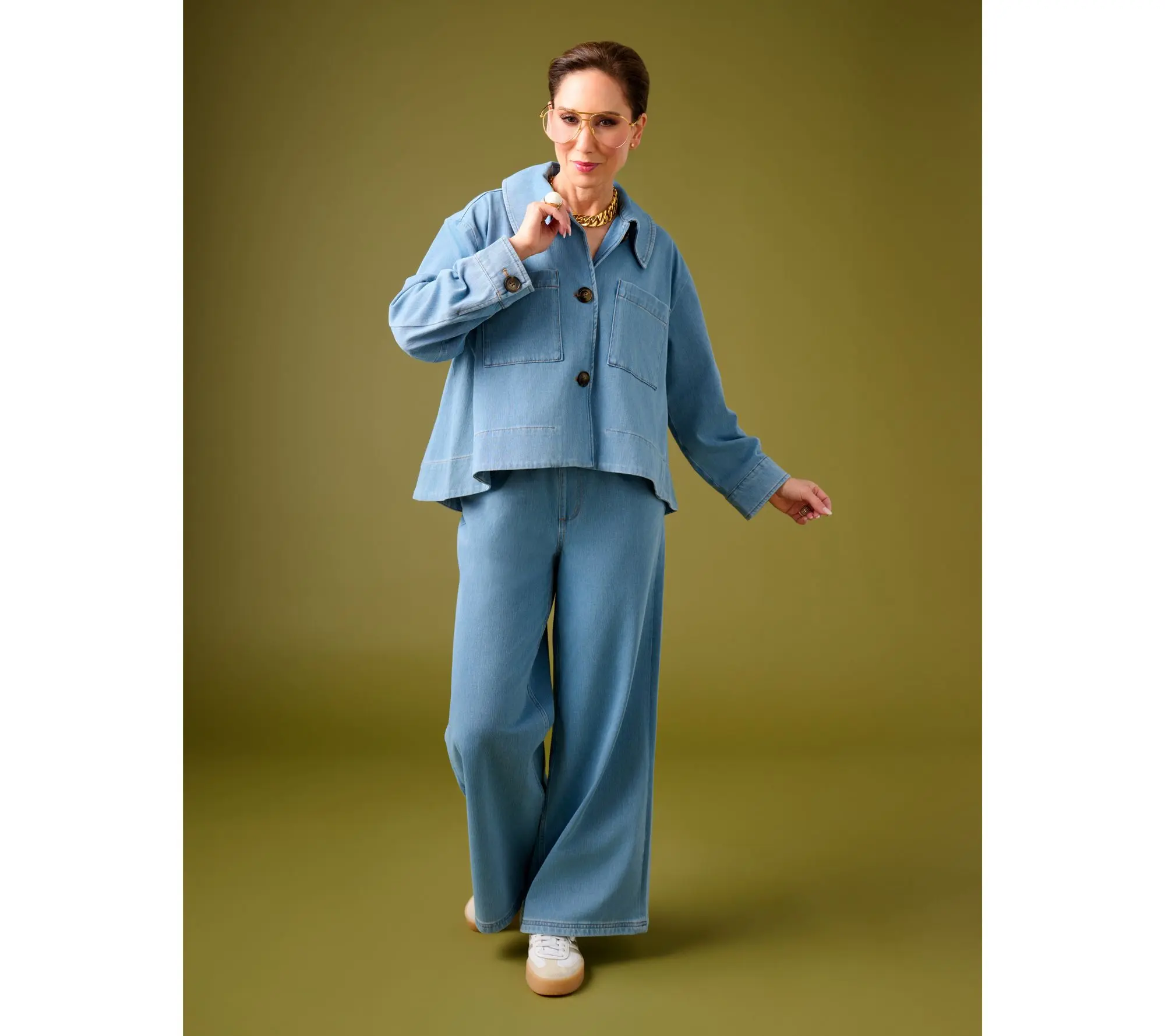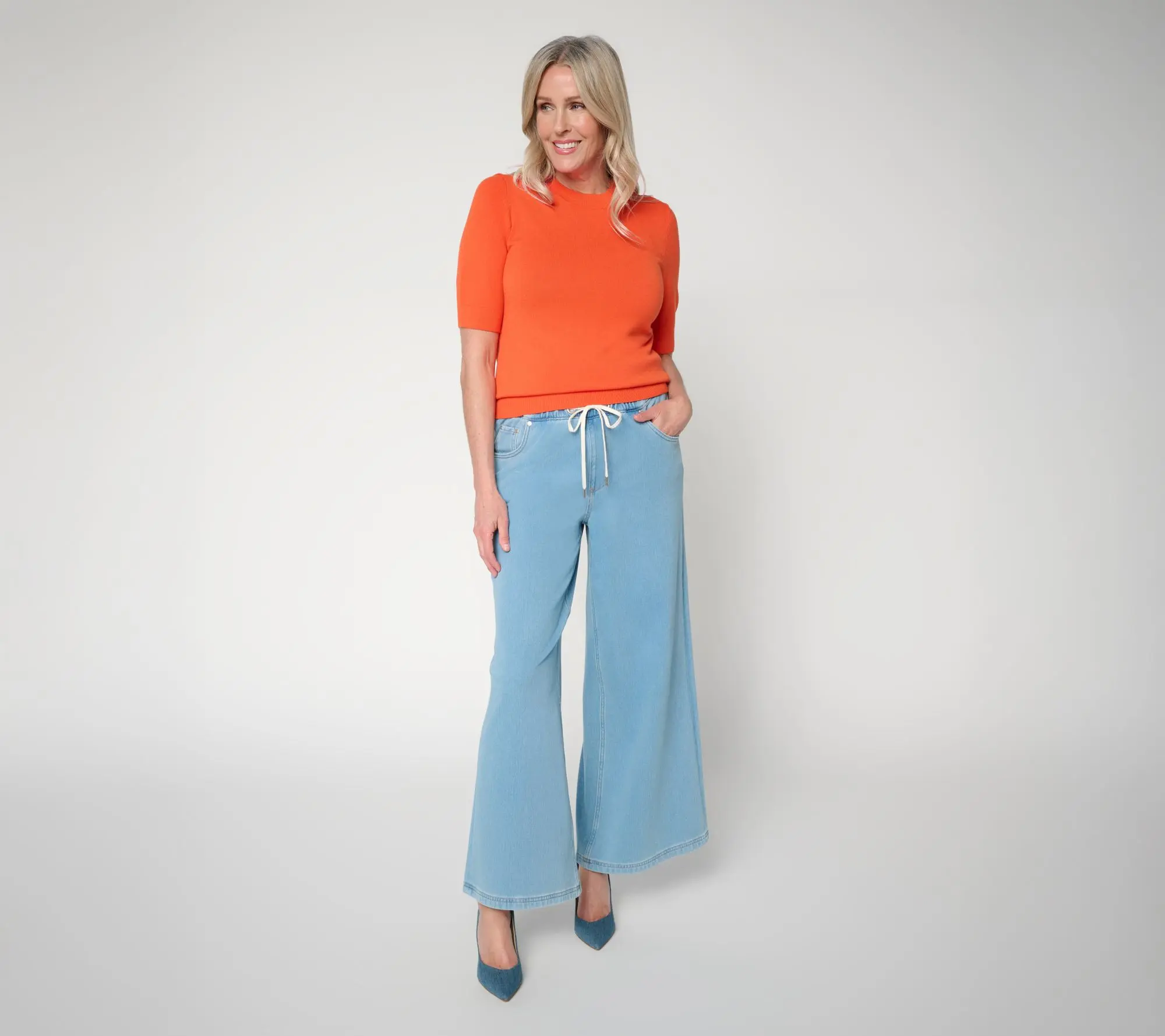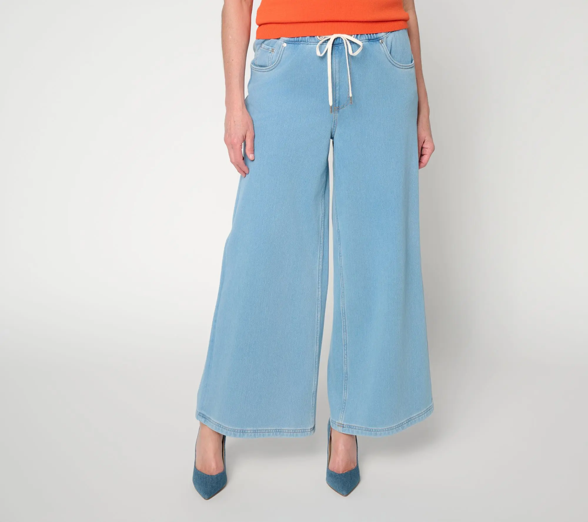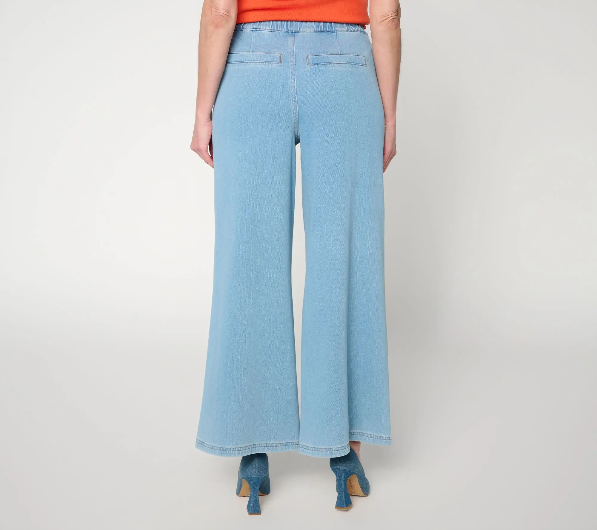 If gallery strolls or girls' getaways are on the agenda, how happy you'll be when you've got Carla Rockmore's pull-on jeans waiting in the wings. Soft stretch fabric, a polished wide-leg cut, and the subtle edge of grommet details make these pants a comfortable choice for relaxed weekends or on-the-go afternoons. (And only you'll know they're actually a comfy knit). From the Carla Rockmore Collection.