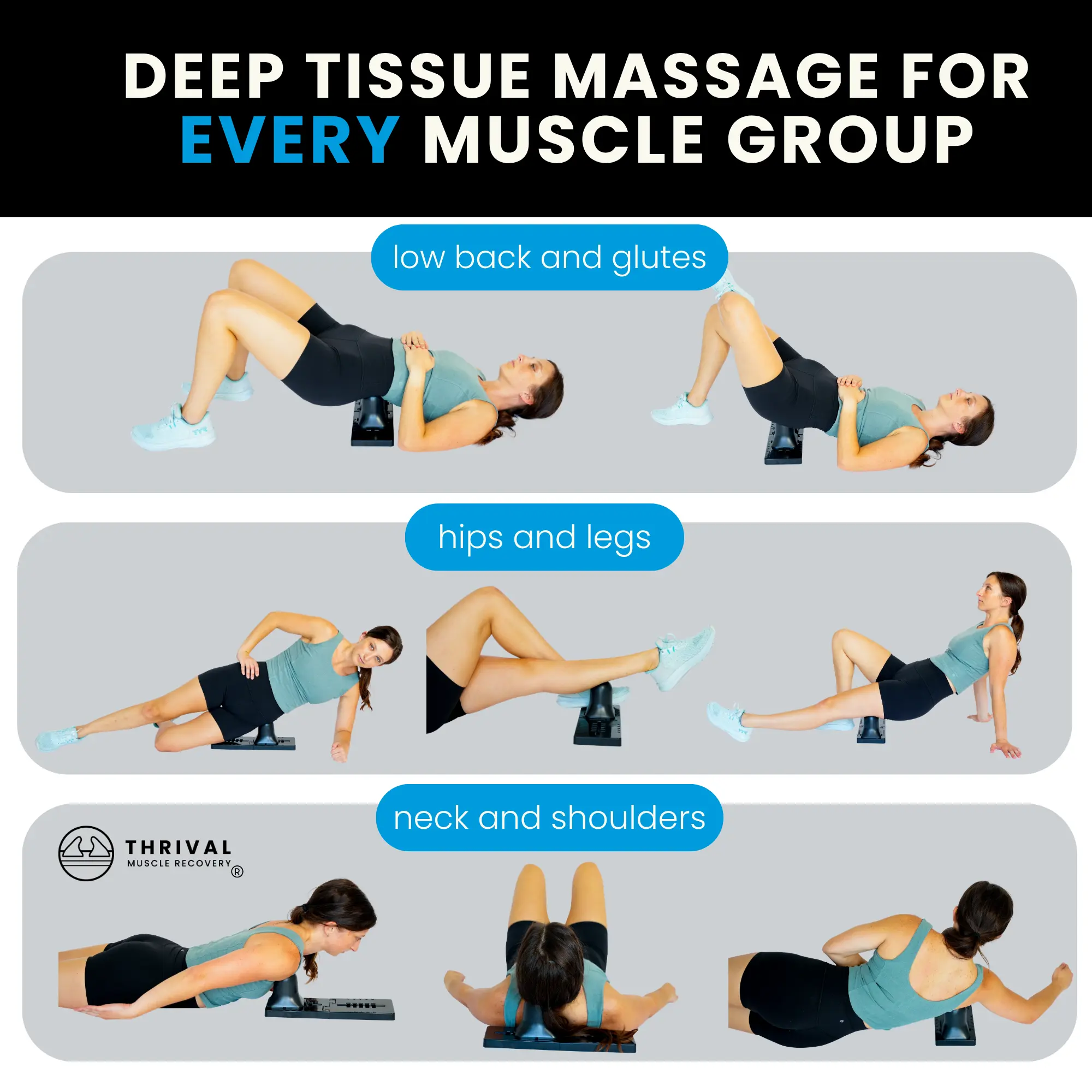 The Thrival Deep Tissue Pro is a fully adjustable muscle release board designed to replicate professional myofascial release at home. Multiple attachment heads mimic a therapist's hand, elbow, or thumb — and each locks into one of five positions per side so you can target your exact anatomy, not an approximation of it.