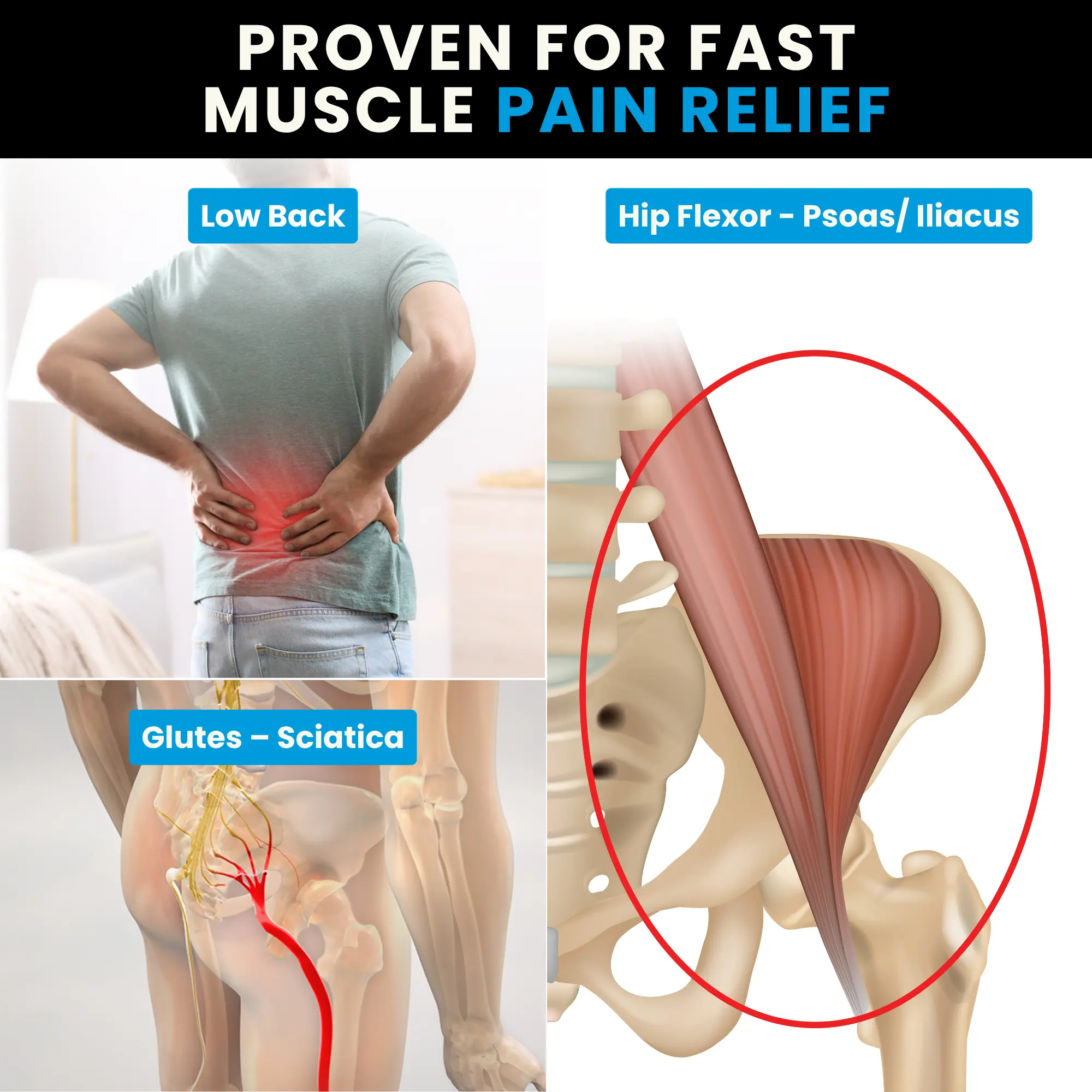 Professional-grade relief at home — psoas, QL, hip flexors, glutes, low back & neck. No appointment. No frustration. Just results.