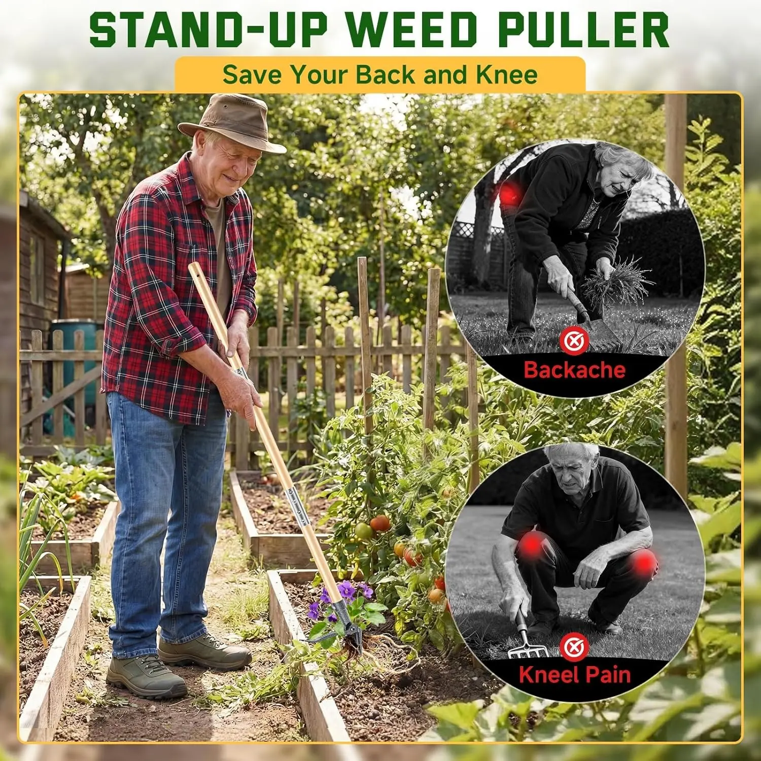 ·ERGONOMIC STAND-UP WEEDING DESIGN:Experience effortless gardening with our 45-inch stand-up weeder that eliminates bending and kneeling. Specially designed for seniors and those with back pain, this tool removes dandelions, thistles, clover, plantains, and invasive weeds while standing upright. The comfortable bamboo handle and strategic foot platform make weed extraction accessible for all gardening enthusiasts.