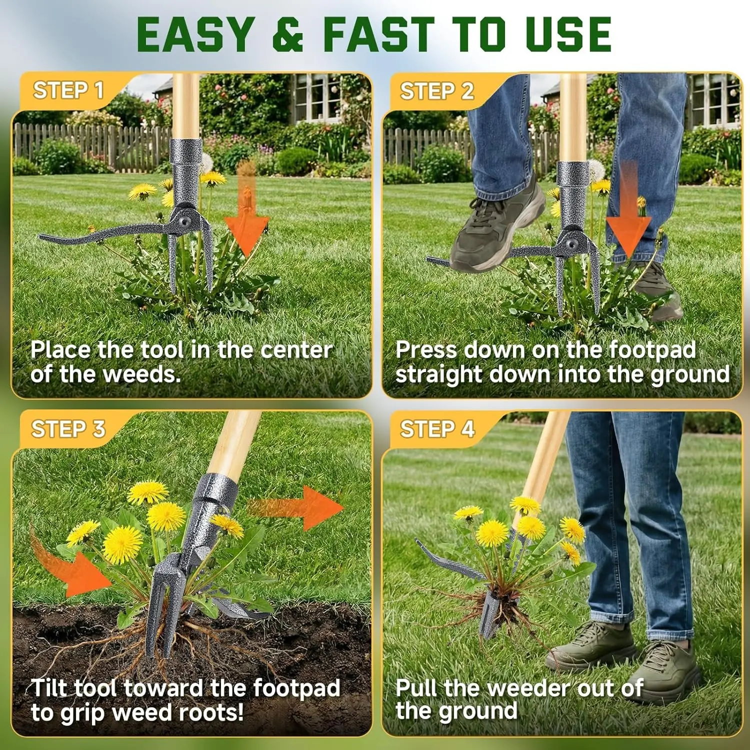 ·INNOVATIVE FOOT PLATFORM TECHNOLOGY:Our upgraded foot pedal design delivers enhanced leverage for complete root extraction. Simply center the tool over weeds like quack grass, apply foot pressure to engage the claws, and lean gently to activate the removal mechanism. This scientific design prevents weed regrowth by ensuring full root system extraction from lawns and garden beds.