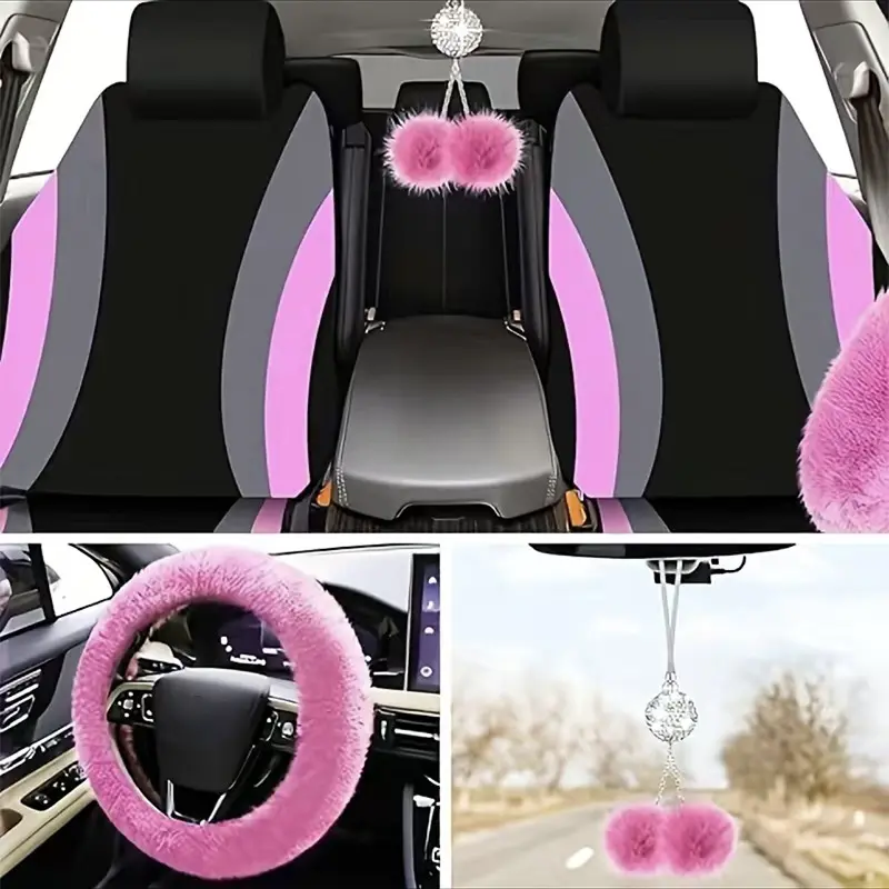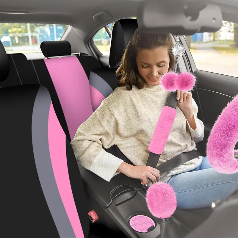 【45pcs/Set】: A complete set of accessories to decorate your car interior with variety. The car seat covers are a thin spring/summer style, while the steering wheel cover, shoulder pads, and gear shift cover are plush. This combination effectively complements each other and meets better needs.