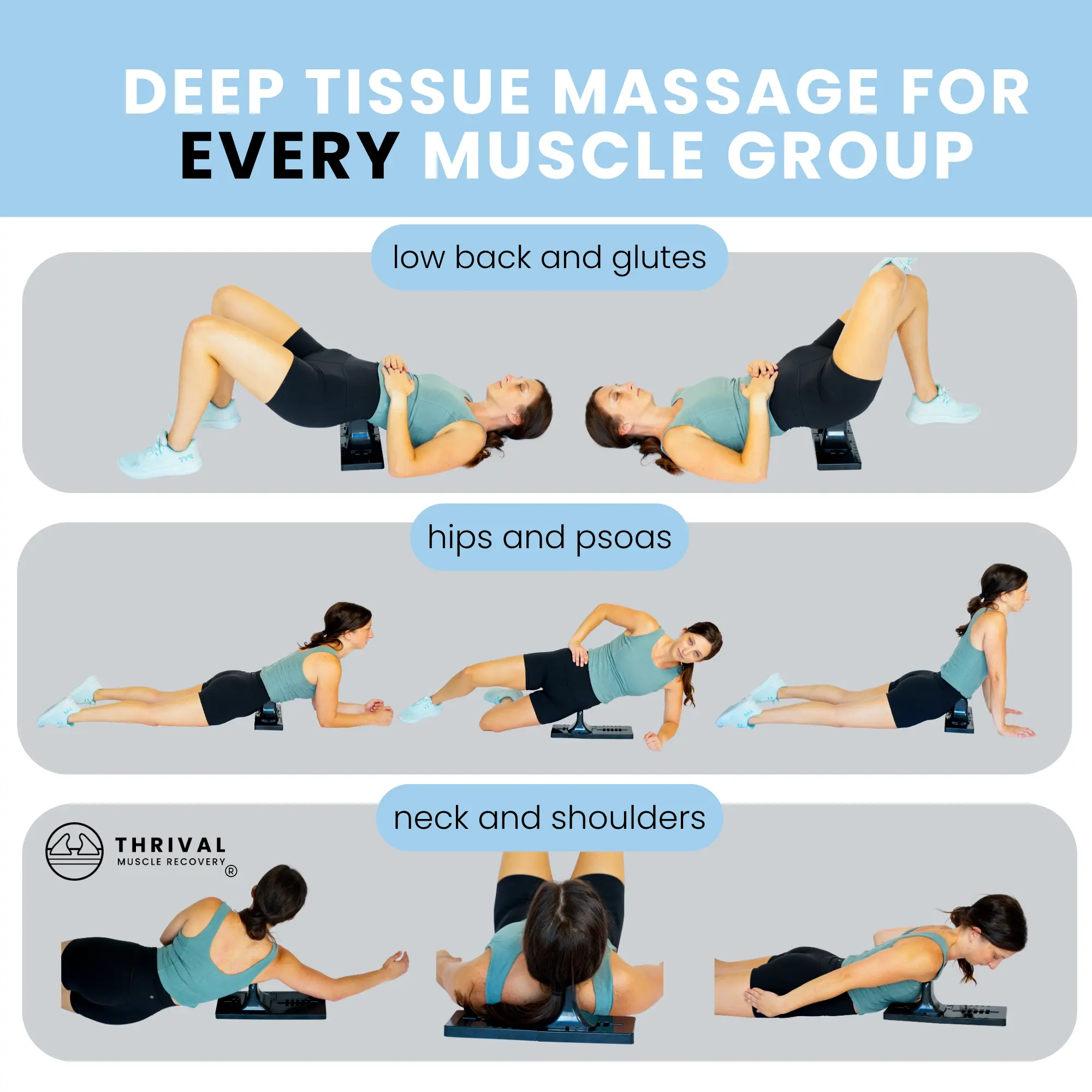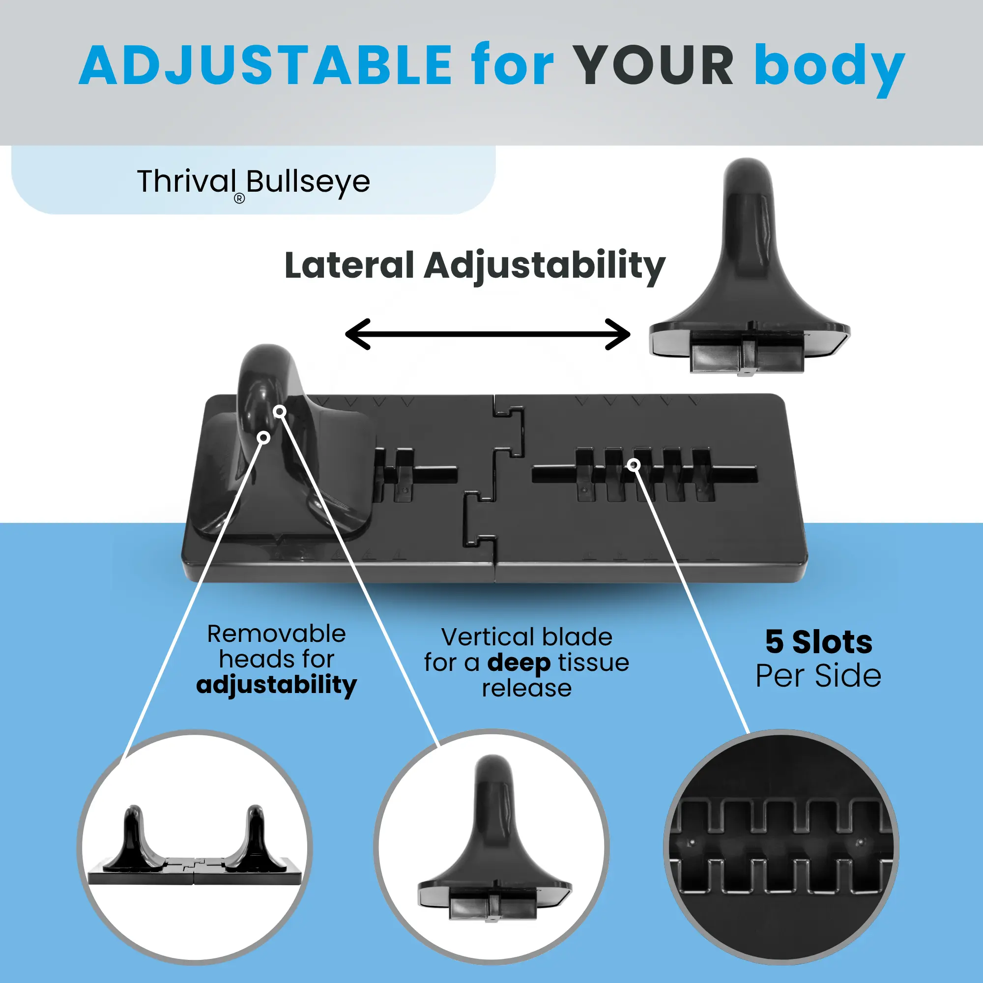 The Thrival Deep Tissue Pro is a fully adjustable muscle release board designed to replicate professional myofascial release at home. Multiple attachment heads mimic a therapist's hand, elbow, or thumb — and each locks into one of five positions per side so you can target your exact anatomy, not an approximation of it.