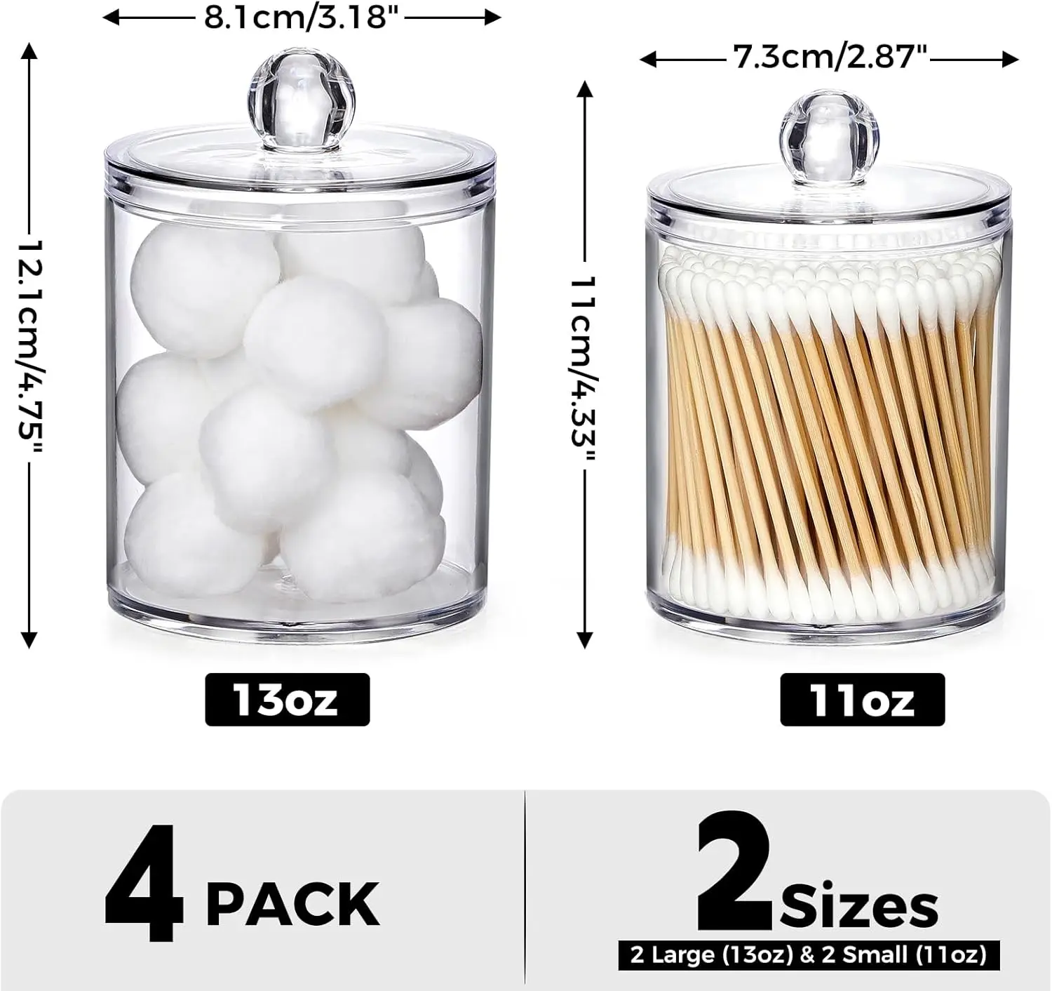 ·Item Includes: 12 pcs - 4 pack clear acrylic qtip holder dispenser with lids (2 packs 13oz & 2 packs 11oz) + 4 clear labels with black pre-printed words (Cotton Balls, Cotton Swabs, Cotton Pads, Floss Picks) + 4 white labels.