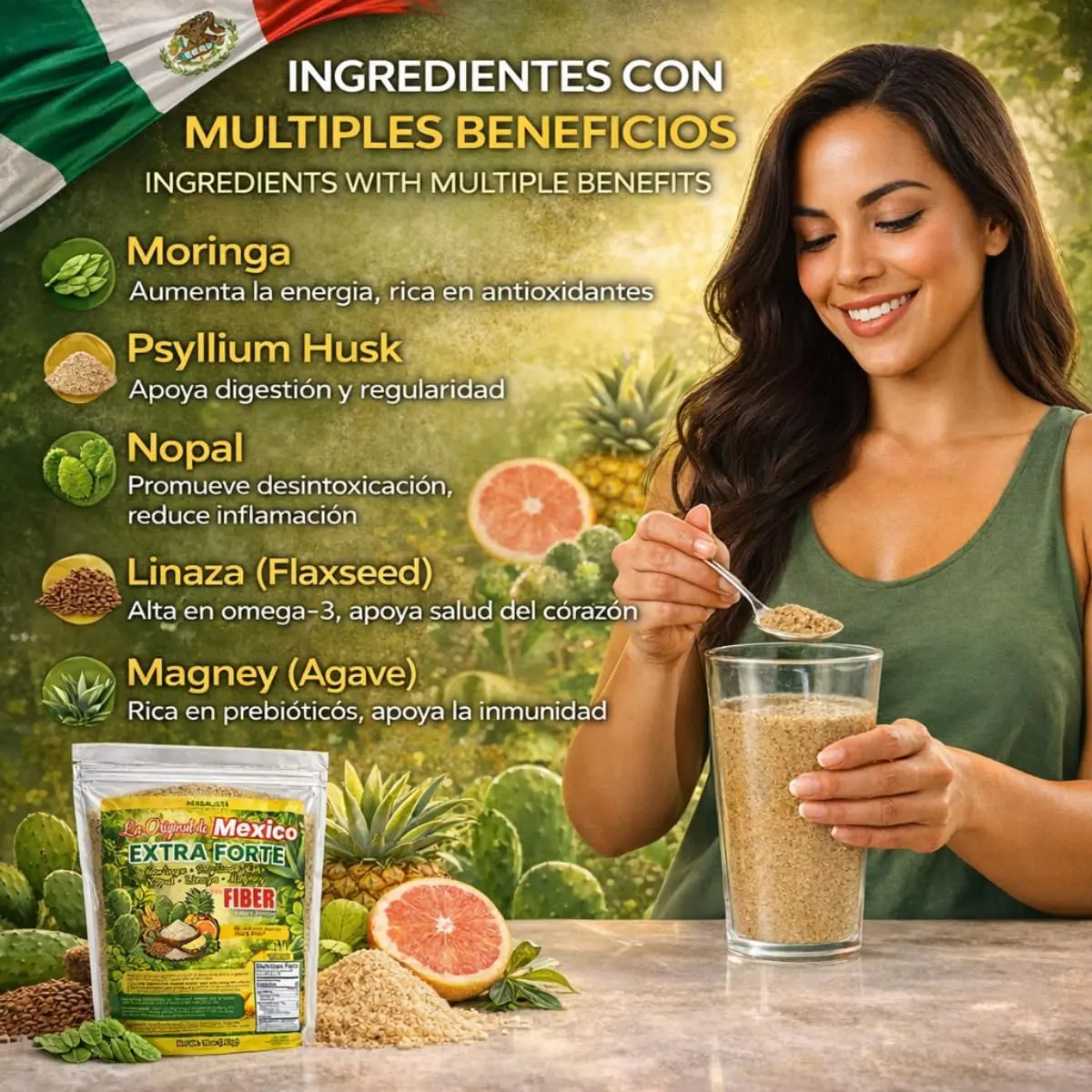La Original de Mexico Extra Forte Daily Fiber 16oz (454g), Moringa, Psyllium Husk, Nopal, Flaxseed (Linaza) & Agave Blend, Plant-Based Fiber Powder, Easy to Mix