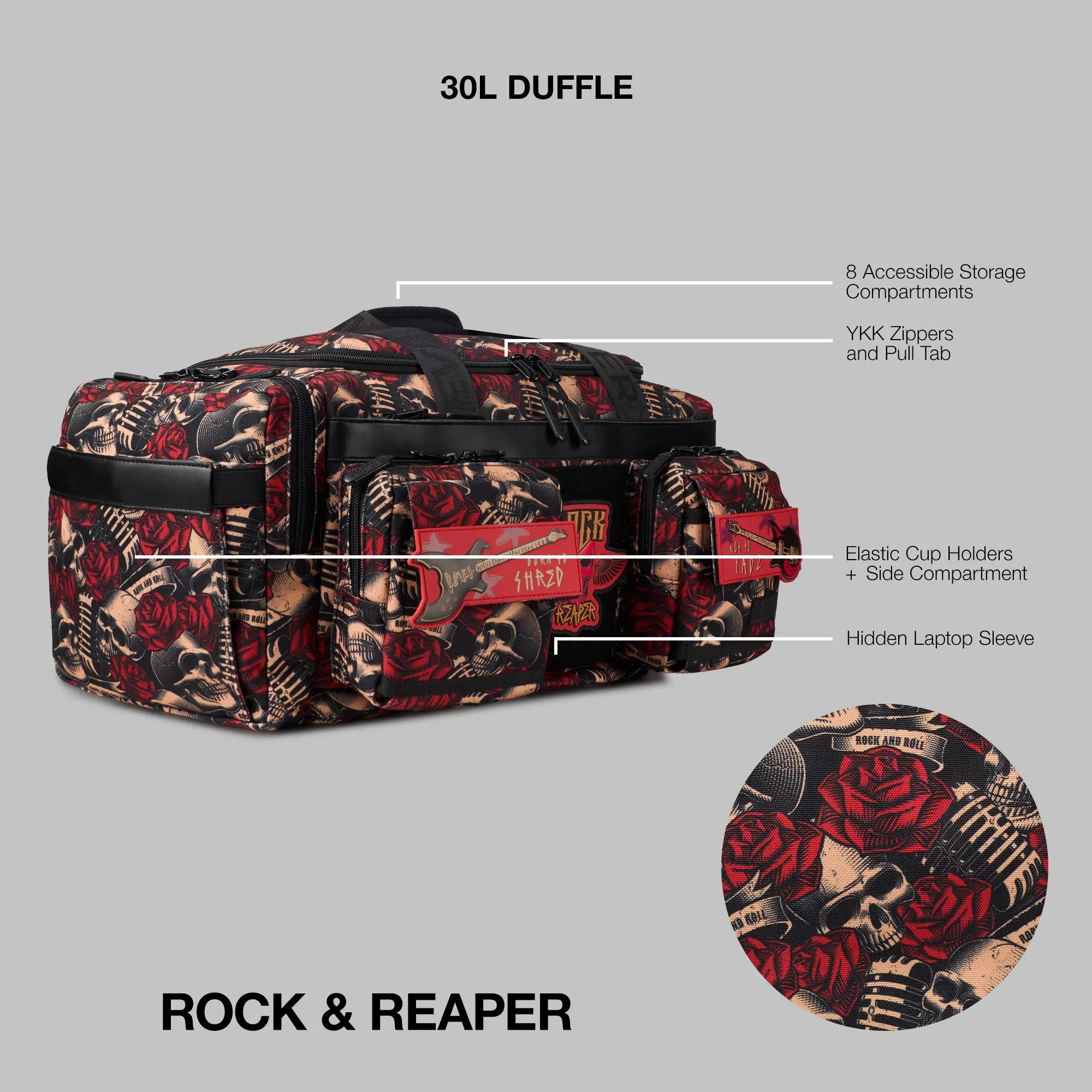 Enhanced Features: The Ultimate 30L Duffle Bag goes beyond the ordinary with added dual cup holders, ensuring you're hydrated and hands-free on your adventures. Additionally, the inclusion of hook and loop patches provides a customizable space for you to showcase your unique style. Along with molle straps for added attachments like your lifting belt, foam roller or gym mat.