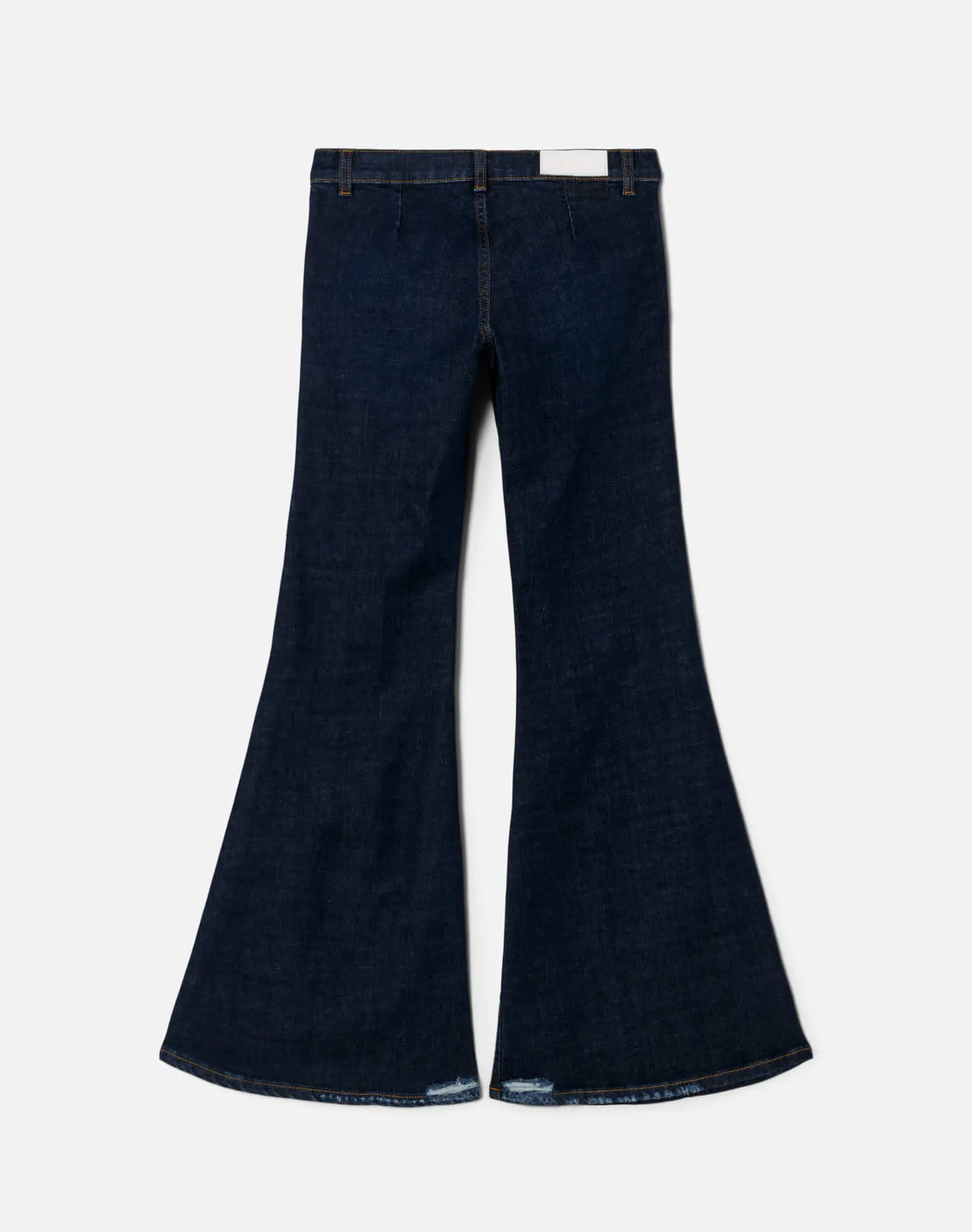 Fit: Low-rise fit sitting over the hip bones with a fitted thigh and a dramatic mega flare. Full-length inseam with a finished hem.