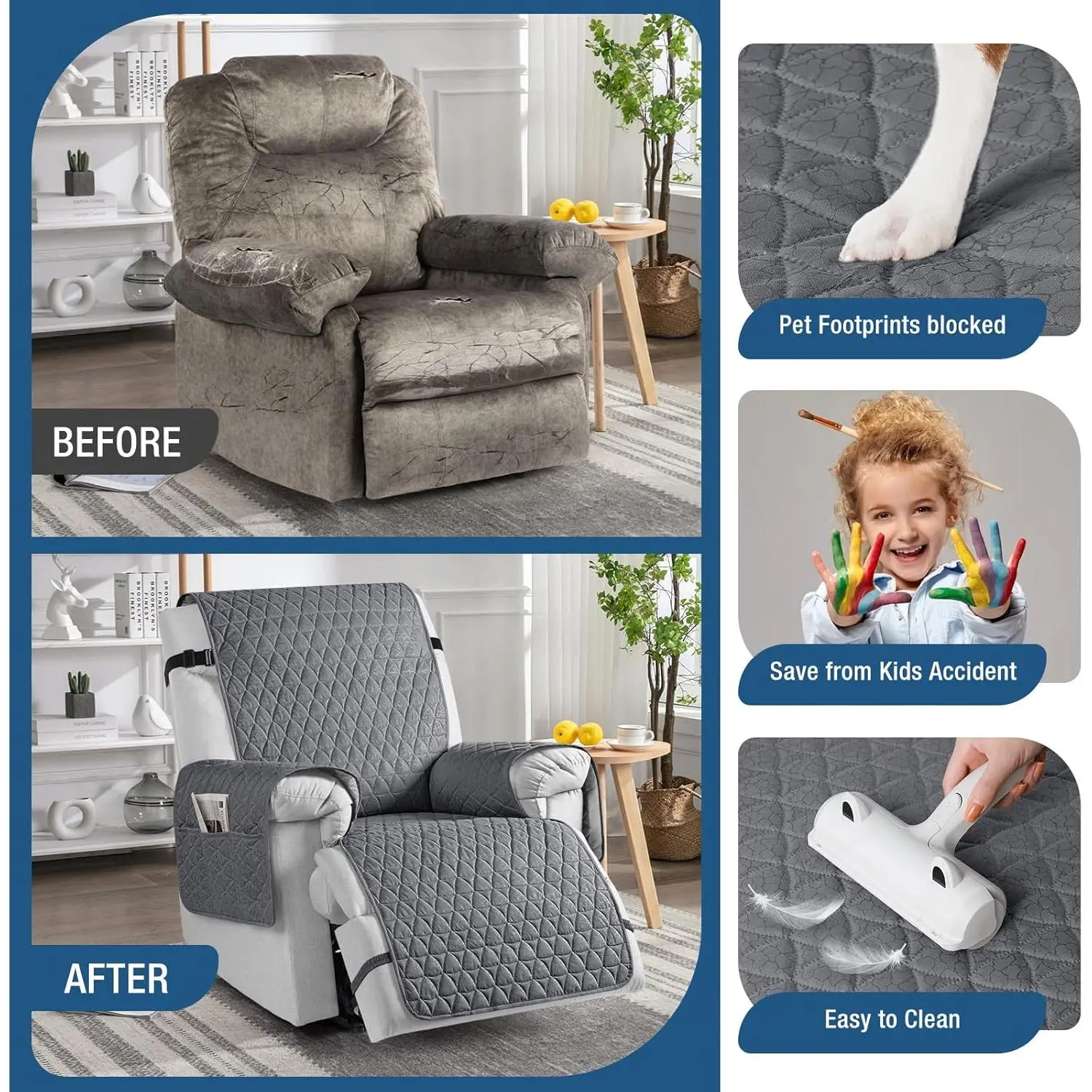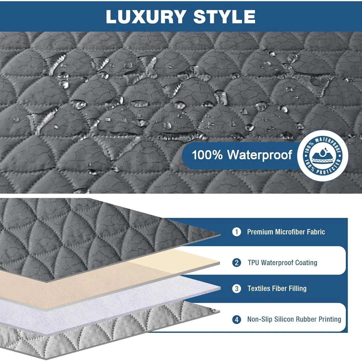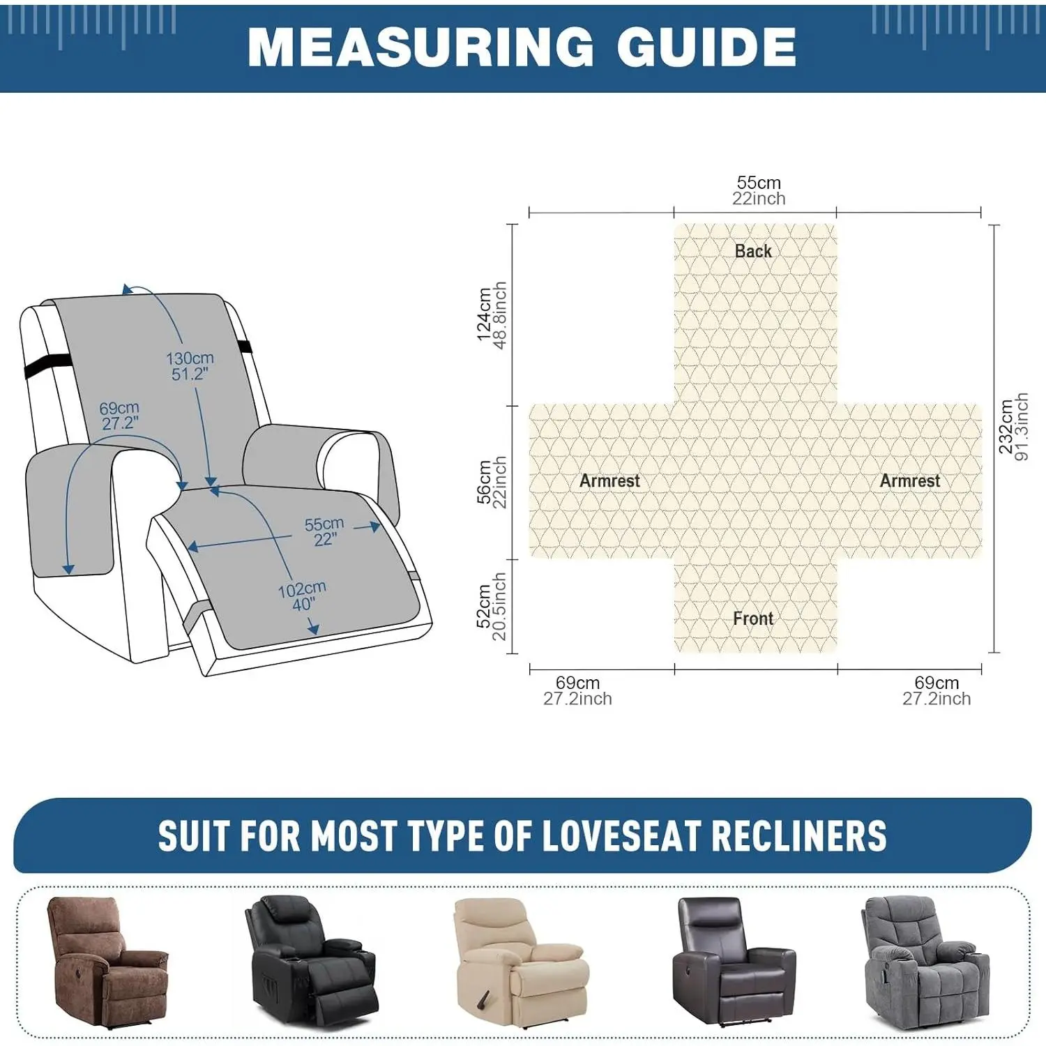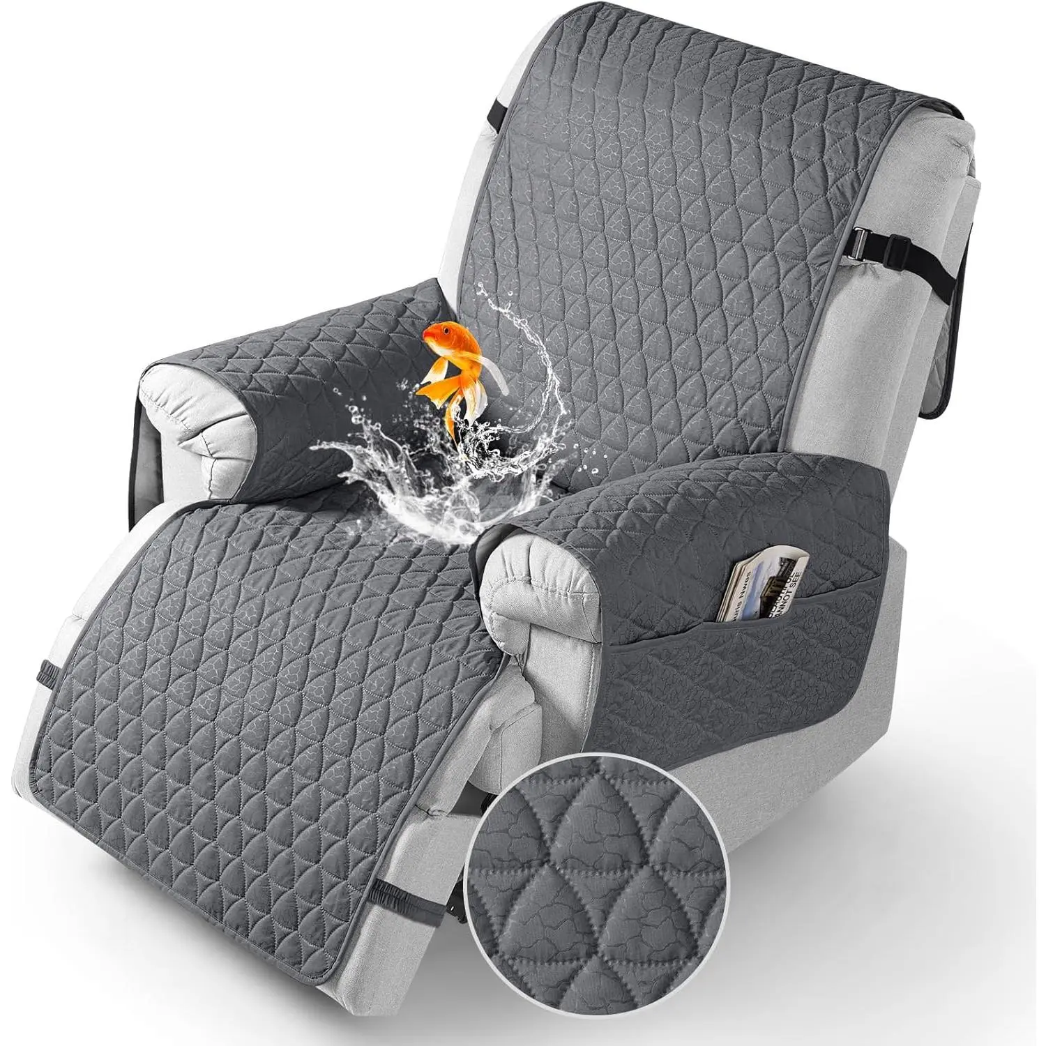 Microfiber[Unique High-Tech Craftsmanship]TAOCOCO recliner cover showcases a distinctive high-tech pattern that seamlessly blends elegance and modernity, adding a touch of luxury to your recliner.Microfiber, Water Resistant Fabric(Had obtained patent from USPTO)VA 2-353-862[100% Dual Waterproof Protection] waterproof chair covers feature premium waterproof fabric and dual waterproof layer technology for unrivaled protection against spills, accidents, and moisture.Keep your recliner dry and stylish, with the ultimate in durability.[Four-Tier Anti-Slip Promise]Tired of your recliner covers slipping all over?Discover our Fourfold Anti-Slip Innovation!1.Backed by anti-slip silicone particles2.Three elastic straps for the headrest, lumbar, and footrest of the recliner - no more worries about your large recliner cover taking a stroll![Dual-Side Storage Pouches]recliner chair covers feature handy pockets on each side, providing storage for your essentials.Keep remotes, phones, and more easily accessible as you unwind.These side pockets offer a convenient way to have everything you need right by your side[Care Instructions]Hand or machine wash with cold water (around 30 ° C) using a gentle detergent. Do not bleach, iron, or high-temperature dry (