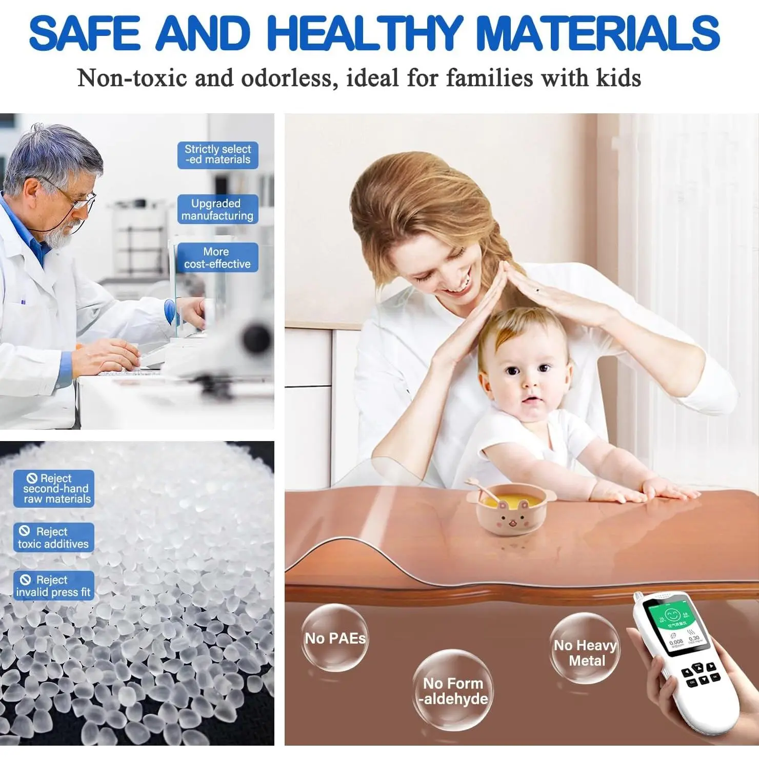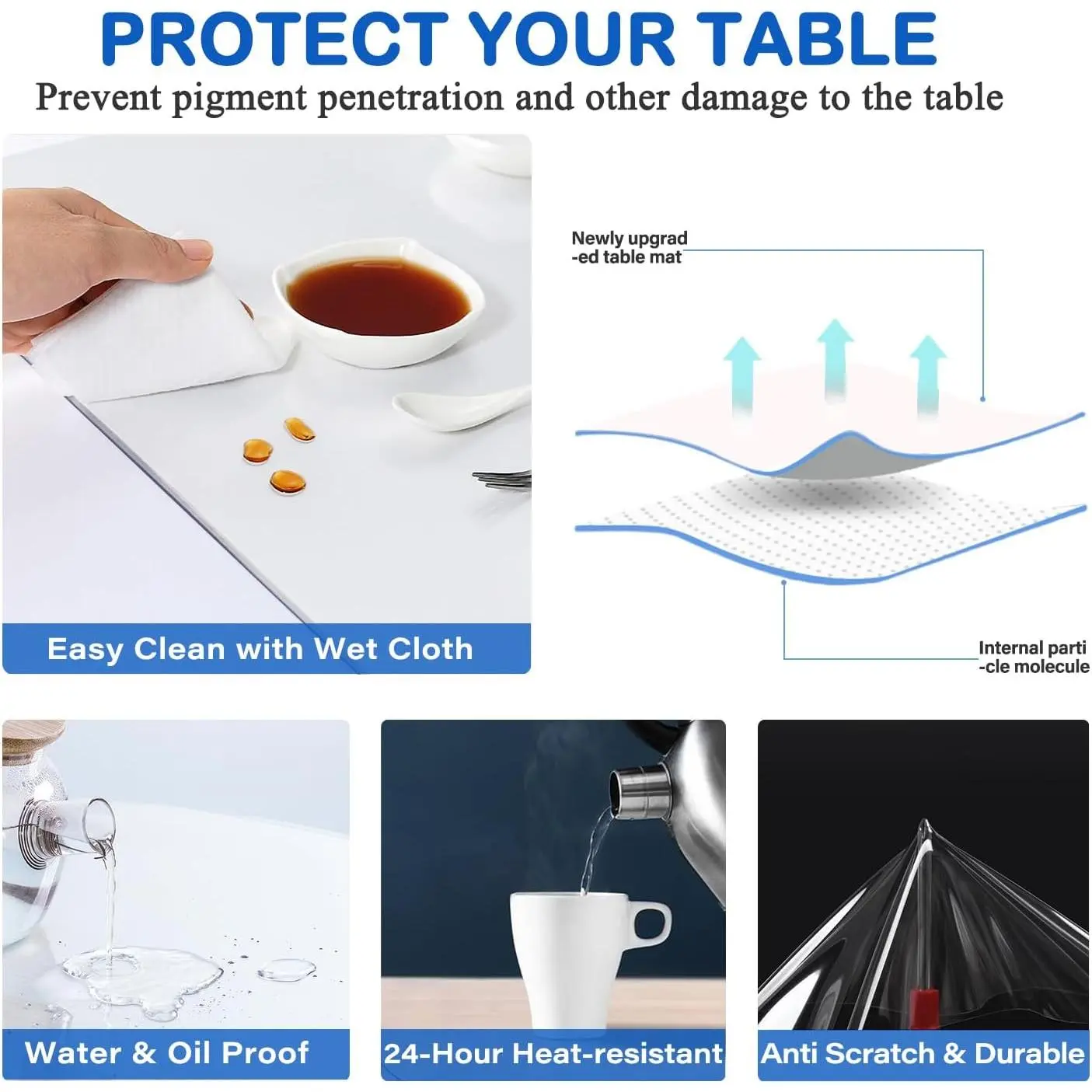 ✅[ECO-FRIENDLY MATERIAL]WanDeela New Version Clear Table Cover Protector Tablecloth is made of improved high quality Eco- friendly PVC vinyl, non-toxic and odorless, ideal for families with kids and pregnant women.Upgraded internal molecular structure, prevent pigment penetration and other damage to the clear table cover pad, water oil proof and heat resistant, wipeable, durable and foldable.Provides protection for coffee dining kitchen end picnic outdoor bedside pub office kids writing table✅[DURABLE AND EASY CLEAN]Our clear vinyl tablecloths protector is is recommended for kitchen and dining room table which has better heat resistant, maximum to 176°F/80°C, easily protect your tabletops from scratches, coffee spillage, scuffs, oil stains, heating scalds for years.It is easy to clean with a damp cloth and no need worry about the stain penetrating into the clear table protector pad.Each of our cost-effective coffee table top protector picnic tablecloth sized 16X16 INCH-2PCS✅[CUT TO FIT & CUSTOMIZED NEED]We usually cut a bit larger than actual size to avoid shrinkage, so there will be slight size differences, but not a quality problem, please rest assured to buy.If you need to cut, just use a pencil to mark the exact size, and then use sharp scissors or a paper knife and steel ruler to cut.CUSTOMIZATION: Please go to WanDeela storefront, find Have a question for WanDeela?Click Ask a question to contact us for your customization request✅[WIDE APPLICATION]WanDeela clear plastic table top protector features smooth round corner edges, will not hurt your hands, safety for babies and kids.The crystal clear tablecloth table cover protector is great as crystal acrylic kitchen table mat, dining room table top protector, kitchen table protector, changing table cover, end table cover, conference table protector, pet feeding mat, buffet table protector, end table runner cover, laptop table top protector, game changing table cover