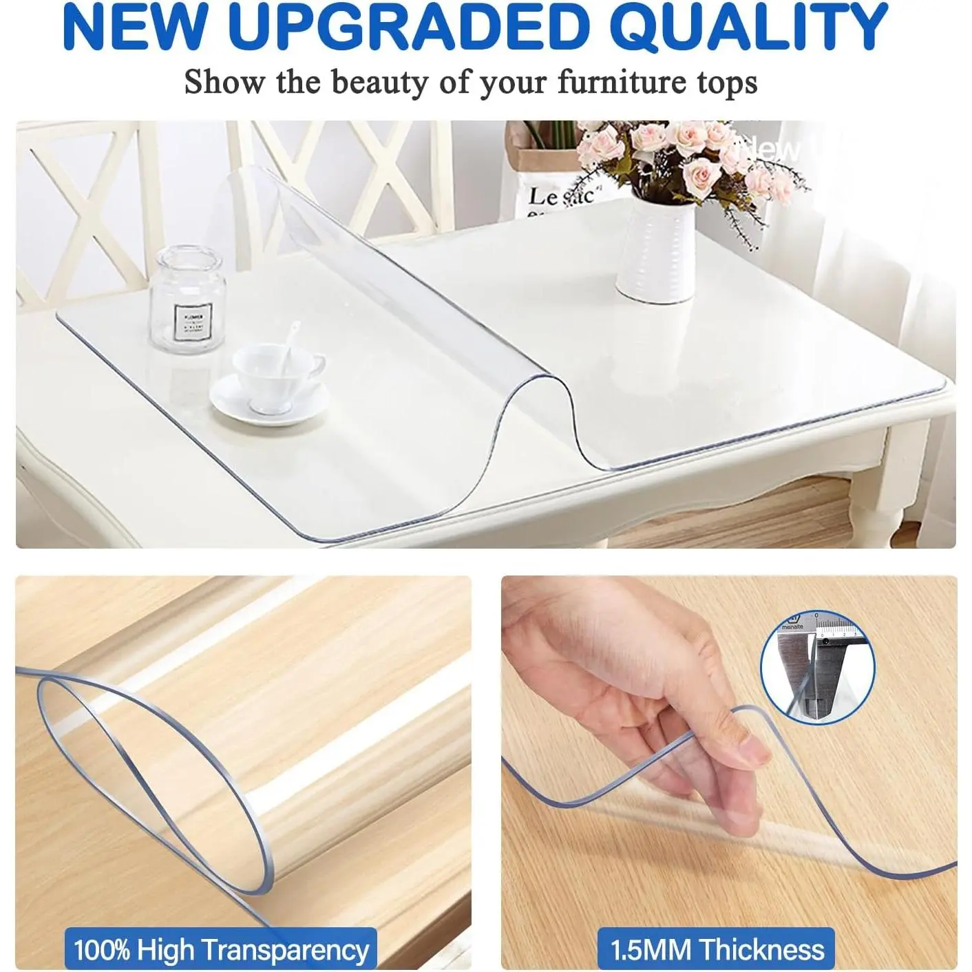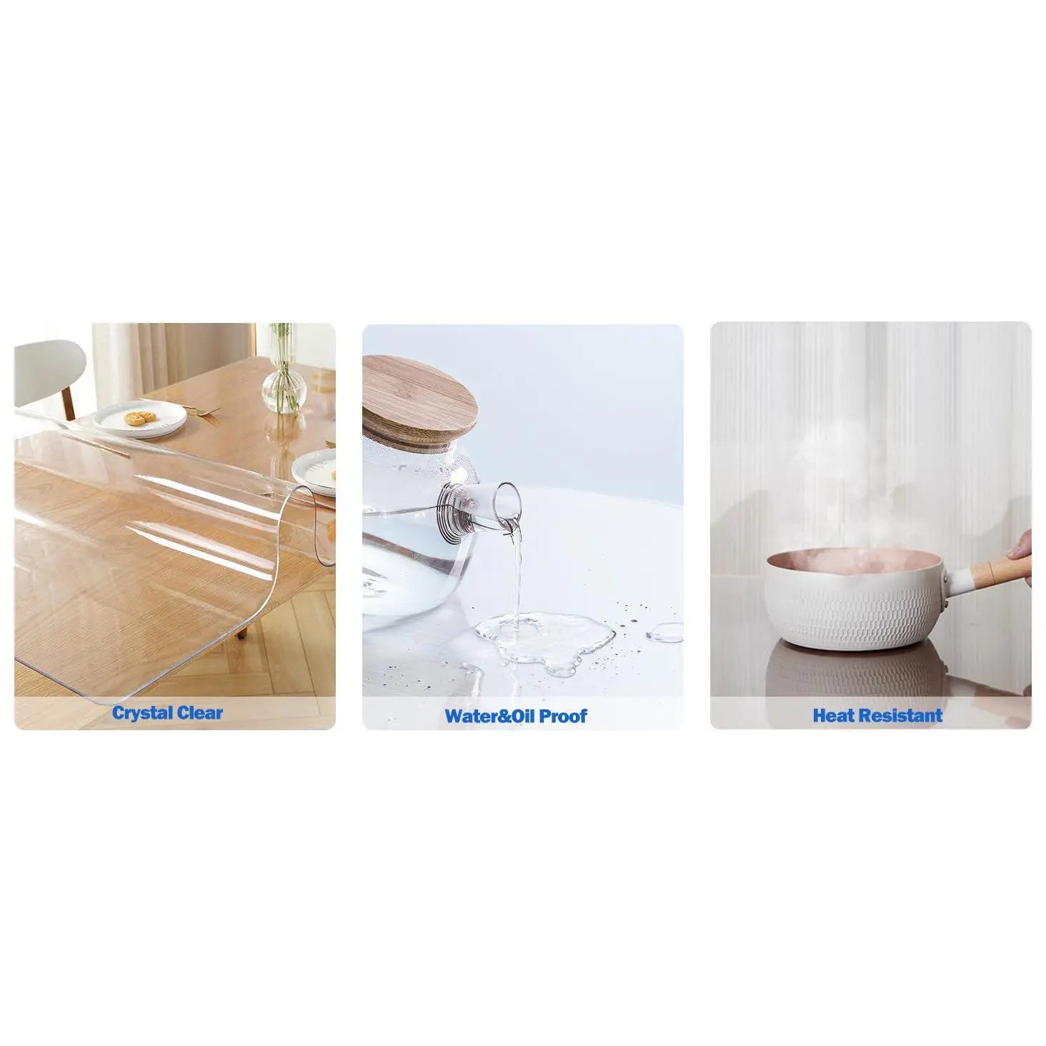 Our table covers are made of highly transparent polyvinyl chloride material with good abrasion resistance and anti-slip properties.Laying it on the tabletop effectively cleans stains, insulates from high temperatures and protects furniture surfaces from scratches, abrasions and other damages.
