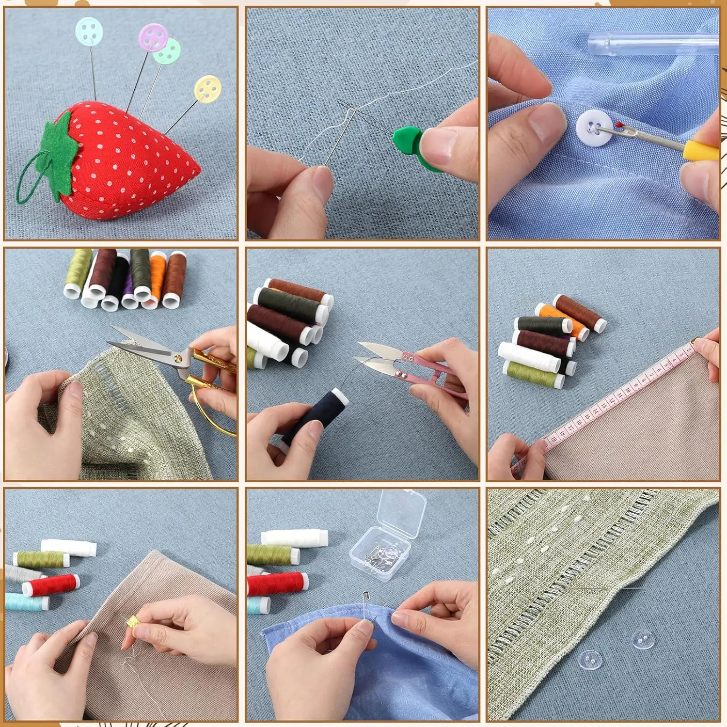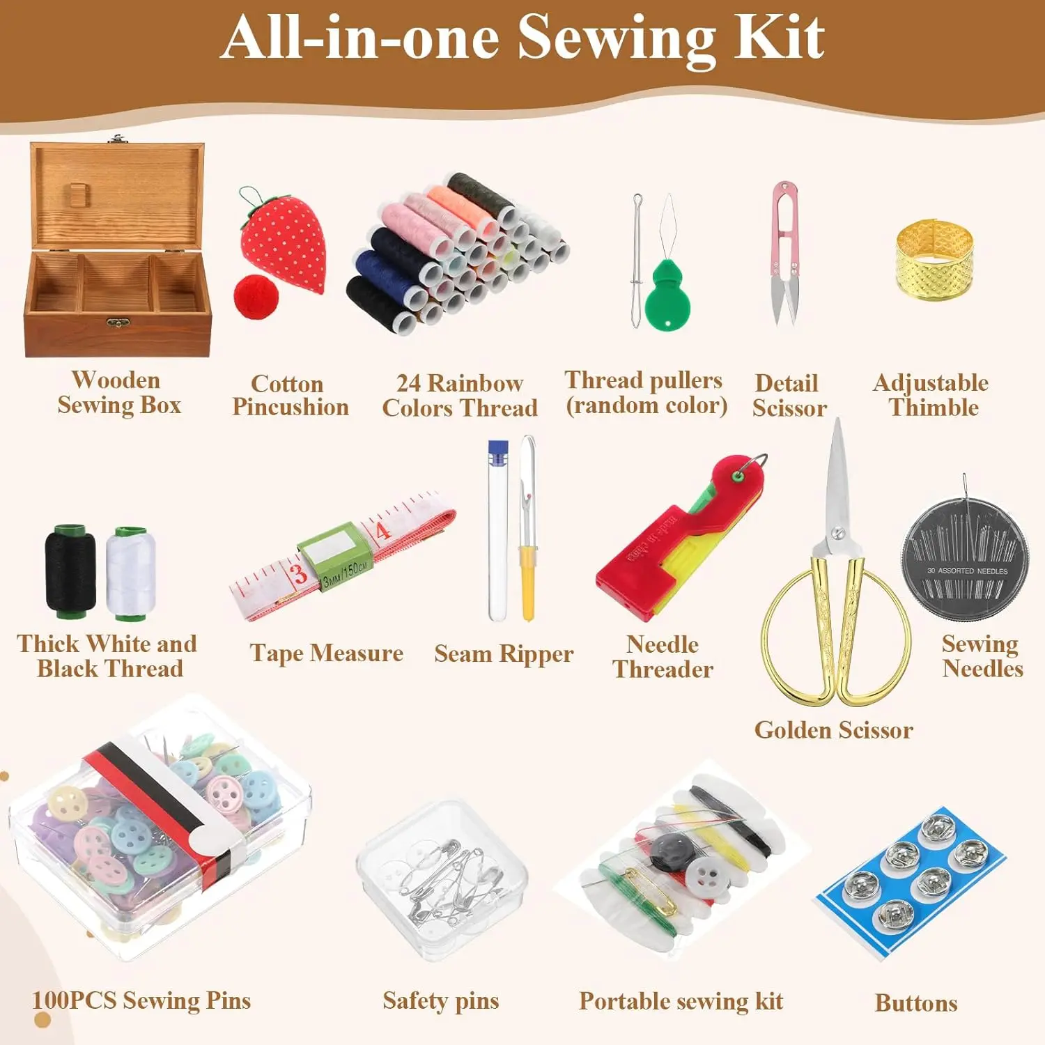 Comprehensive Tool Collection: This wooden sewing box includes a versatile golden scissor, spools waxed twine, 24 spools of sewing thread in various colors, 100 buttons, an extra thick white and black thread, an assortment of sewing needles, a pin cushion, a tape measure, sewing pins, a thimble, a detail craft scissor, a seam ripper, and needle threader toolsComplete Thread Selection: sewing kit wooden box with cute sewing accessories supplies contains 24 standard color spools plus extra-thick black and white threads for diverse projects.waxed upholstery thread included for heavy-duty applications requiring maximum durability.Organized Wooden Storage: wooden sewing kit box all components neatly arranged within a compact wooden box with designated compartments for secure storage.removable inserts allow customization while preventing tool displacement during transport or storage.Professional-Grade Components: wooden sewing box with sew kit accessories includes heavy-duty curved upholstery needles and waxed thread for demanding repairs.features multiple needle sizes and reinforced tools capable of handling various fabric types and thicknesses.Versatile Application Range: wooden hand home sewing repair tool kit suitable for clothing repairs,restoration, upholstery projects, and creative diy crafts.enables everything from simple button replacement to complex decorative stitching techniques.