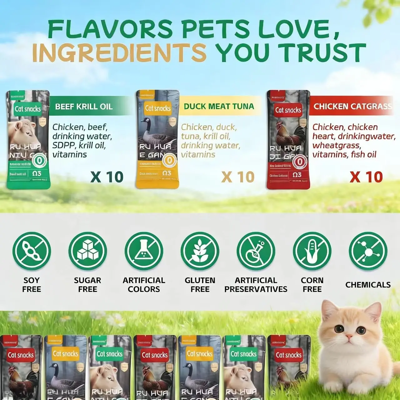 Zhuaizhuaiqi Cat Puree Treats – 3 flavors, 10 packs each, 30g per tube, no harmful ingredients, easy digestion.