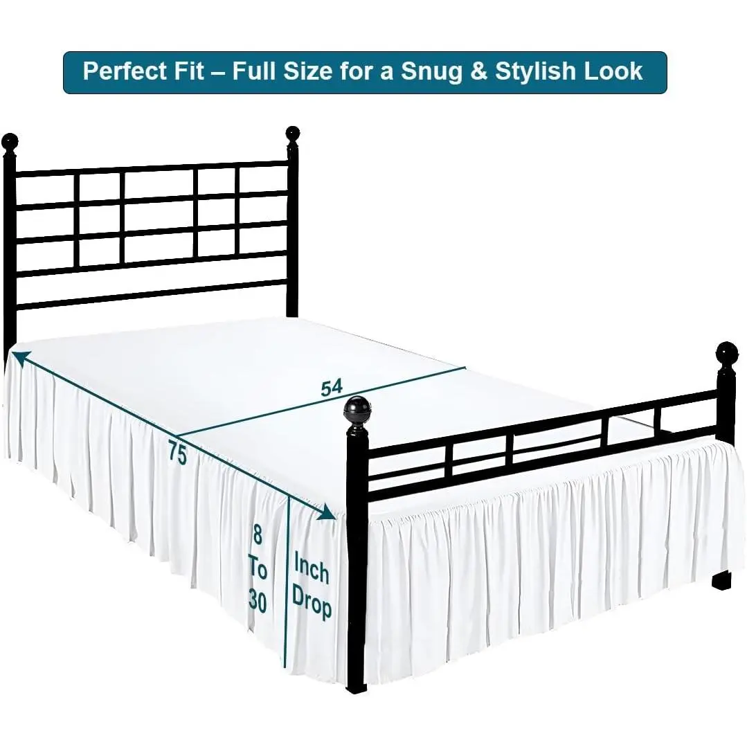 Luxurious & Durable: Made from 100% premium microfiber, this three-sided ruffle bed skirt adds a soft, elegant touch to your bedroom.Not only does it enhance the look of your bed, but it also helps protect against dust while concealing items underneath.Perfect Fit Full Size: Ruffled bed skirts are suitable for Full beds measuring 54" W x 75" L and fit up to an and fit up to an 16 Inch drop, ensuring everything under your bed stays hidden.Functional & Practical: This bed skirt offers a stylish way to cover unsightly box springs and bed frames.It also creates extra hidden storage space, helping you maintain a clean and clutter-free bedroom.Quick Bedroom Makeover: Instantly transform your bedroom with this white bed skirt.It pairs beautifully with Crescent Bedding accessories, including sheet sets, pillowcases, shams, and body pillows.Featuring split corners and a durable platform, it's easy to install-just lift your mattress, place the skirt, and let it drape perfectly around three sides of your bed.Easy Care: Our bed skirt is machine washable, wrinkle-resistant, and fade-resistant.Wash with like colors on a cold gentle cycle, tumble dry on low, and iron lightly if needed.All Sizes, Vibrant Colors: Add a splash of style to any room with our wide range of bed skirt colors-Burgundy, Chocolate, Dark Grey, Ivory, Light Blue, Light Grey, Navy Blue, Sage, Taupe, and White.Available in every size from Twin to California King for the perfect fit on any bed.
