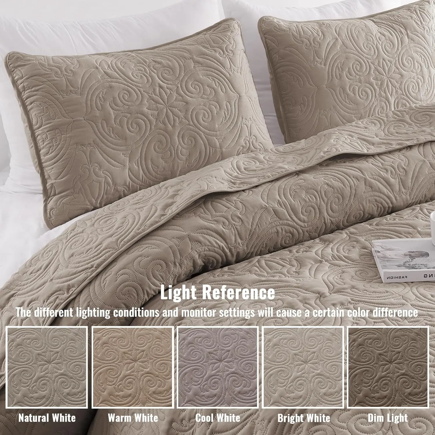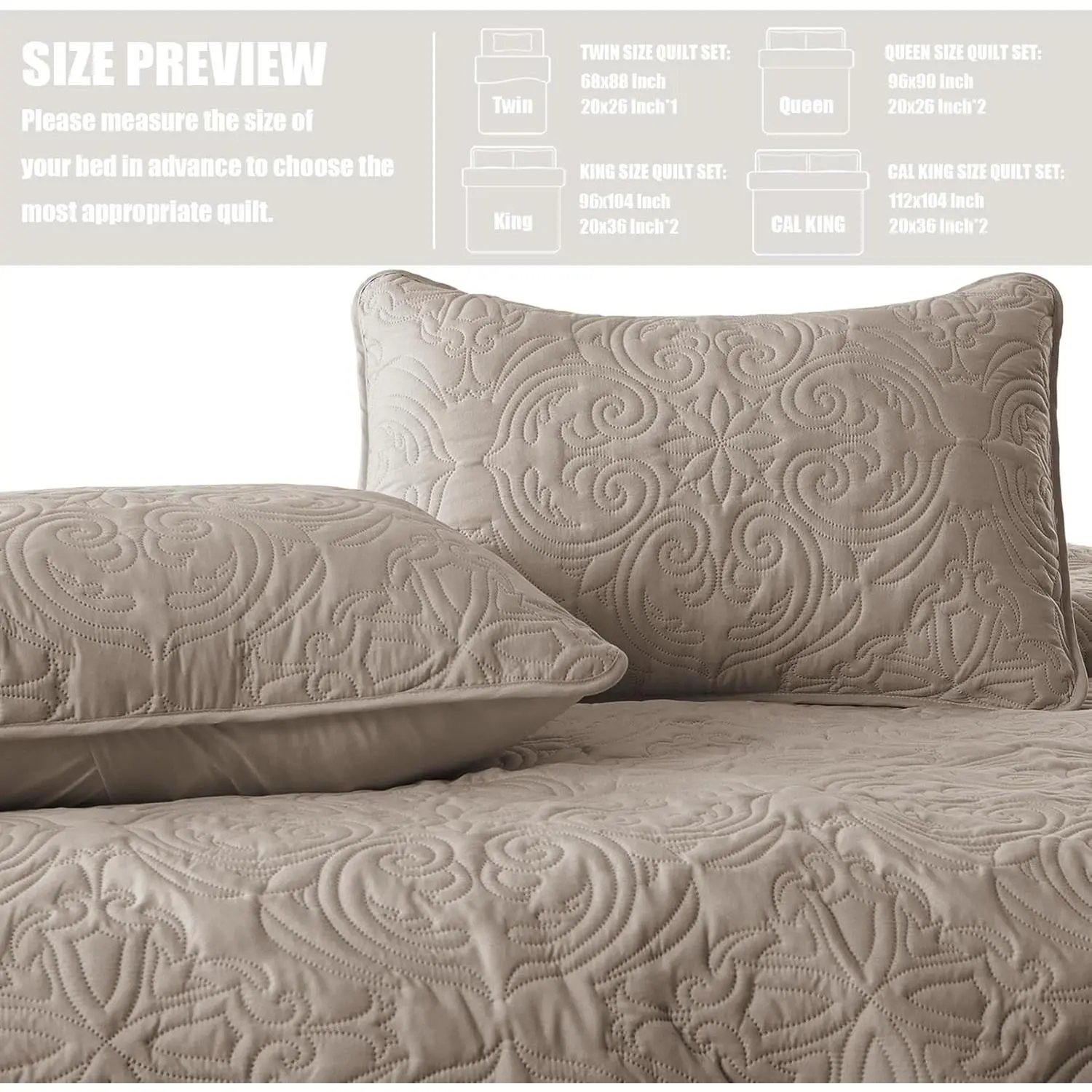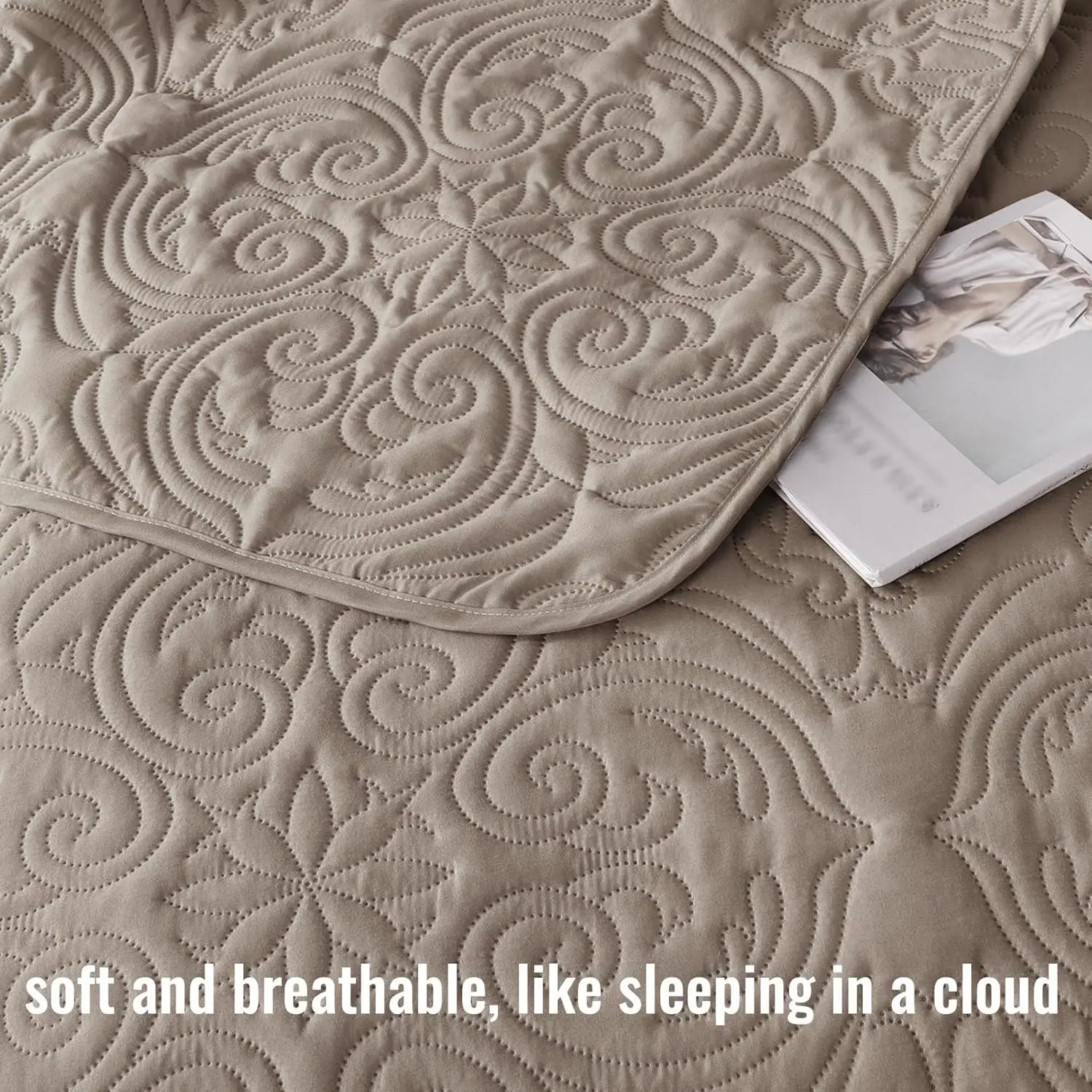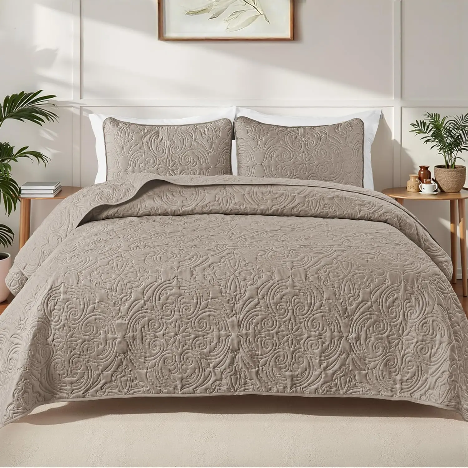 Queen Size Bedding Set with 2 Pillow Shams, Lightweight Taupe Full Queen Bedspread with Vintage Damask Pattern, Soft Bedspreads Coverlets for All