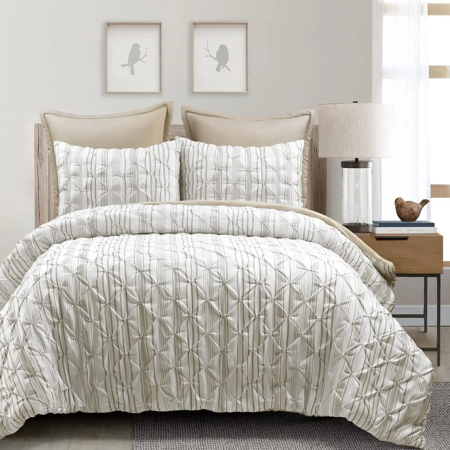 Elevate your bedroom decor with the Lush Decor Ravello Pintuck Striped Reversible Comforter Set in Neutral Stripe. This comforter set seamlessly blends traditional glam, minimalism and a cozy farmhouse style, showcasing exquisite pintuck detailing for added texture. The Neutral Stripe color complements a variety of interior designs, while the soft and durable fabric provides comfort and long-lasting quality. Indulge in a luxurious sleep every night when you wrap yourself up in this cozy comforter set and experience the ideal combination of style, comfort, and reliable durability. This product is STANDARD 100 by OEKO-TEX ® certified, which means the fabric, dyes and all components have been tested in an independent laboratory and certified against a list of more than 350 harmful substances. For your convenience, this set is safe to machine wash on the gentle cycle and tumble dry on a low setting. Use a steamer to release wrinkles. Please refer to label for full care instructions.