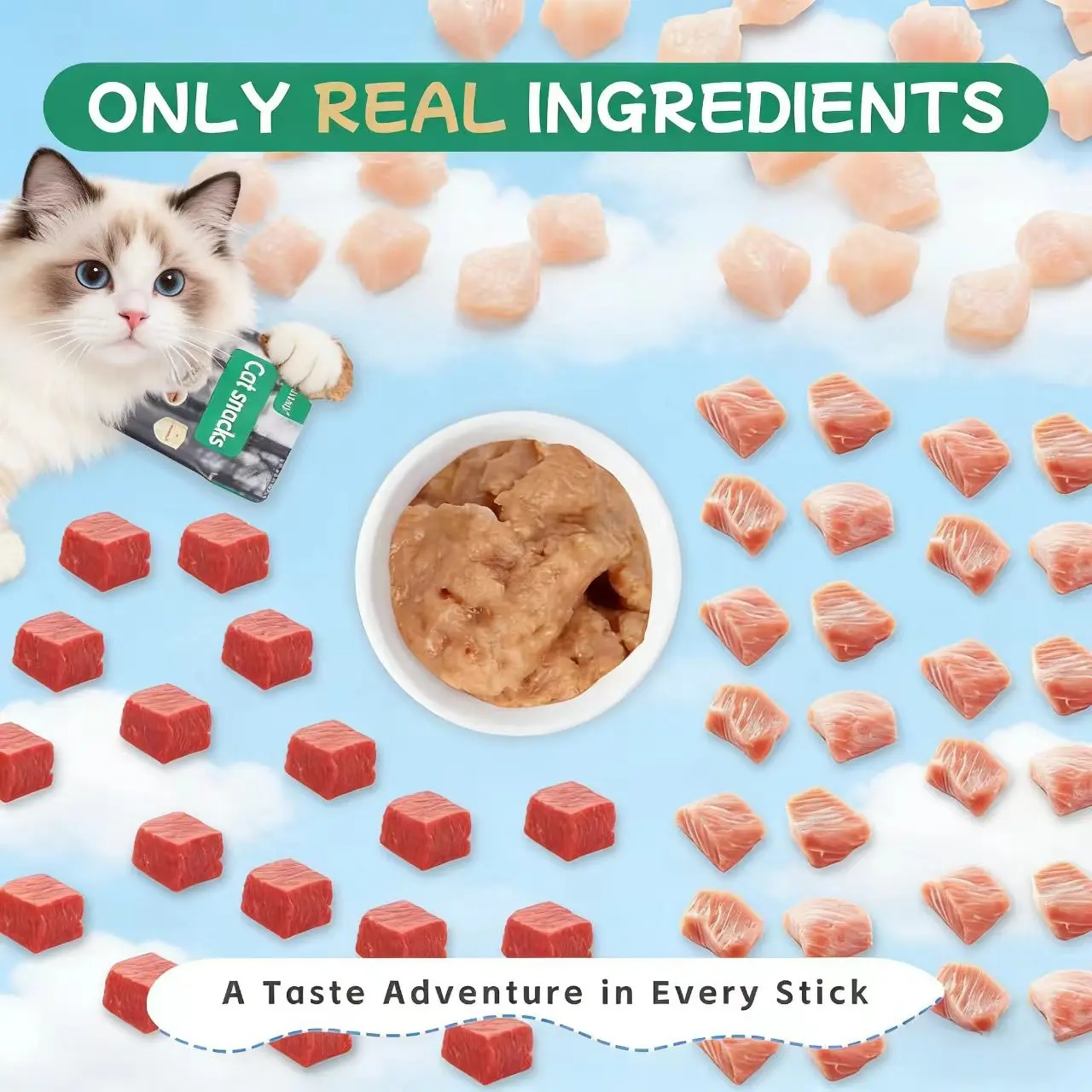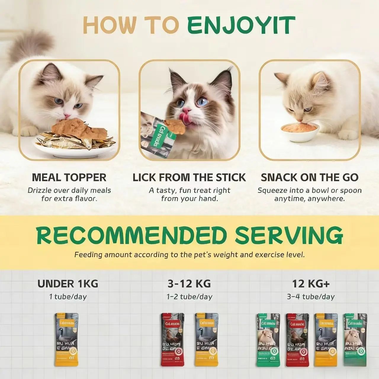 No more ignored treats! Our creamy lickable cat treats are packed with real meat flavor—chicken, tuna, or duck—your cat can’t resist.