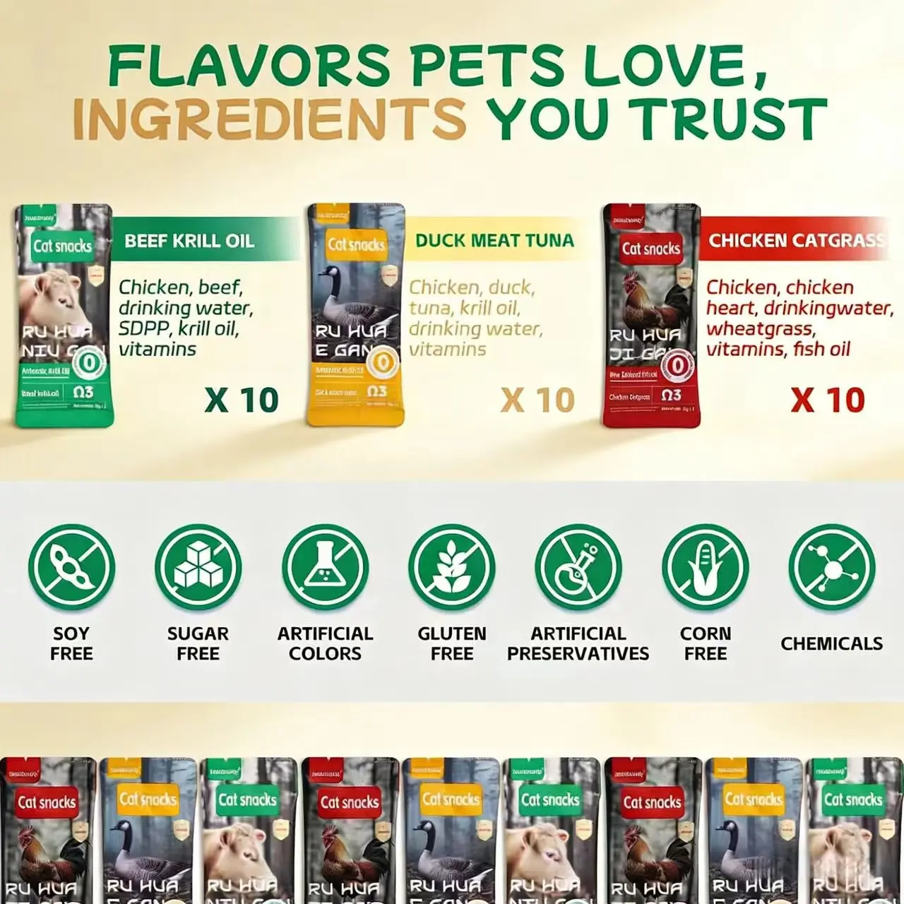 Zhuaizhuaiqi Cat Treats – Smooth lickable puree in 3 flavors, 30 packs total (30g each), gentle on digestion.