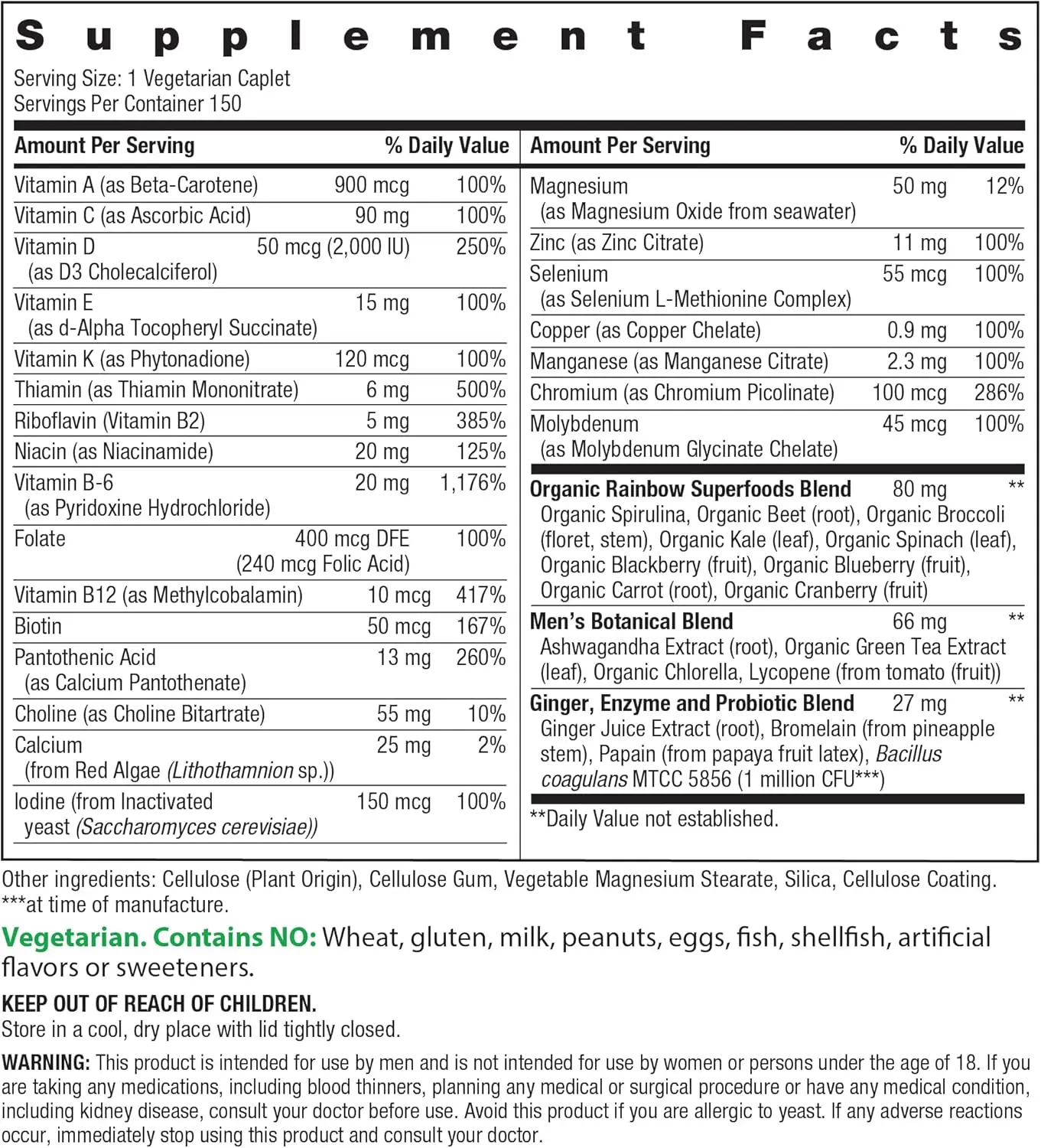 ·Men's One+ is vegetarian, certified C.L.E.A.N., certified R.A.W., and free from gluten, dairy, peanuts, eggs, fish, shellfish, and artificial flavors or sweeteners. It's your daily shield to support your overall wellness, energy, digestion, muscle health, and nerve health.*