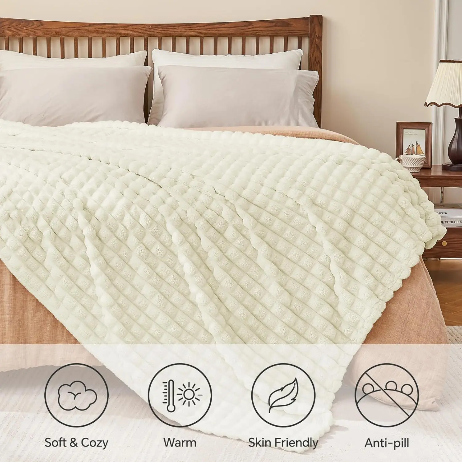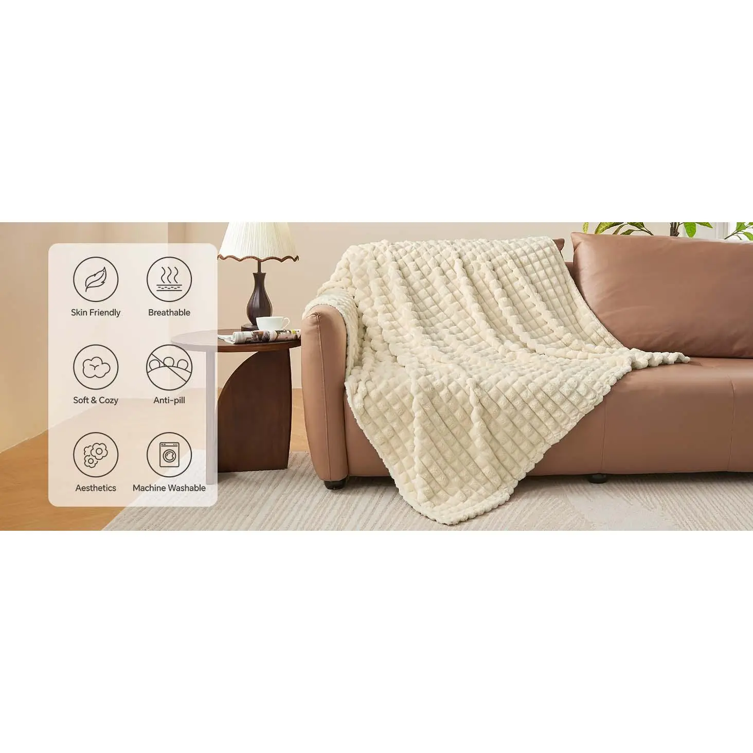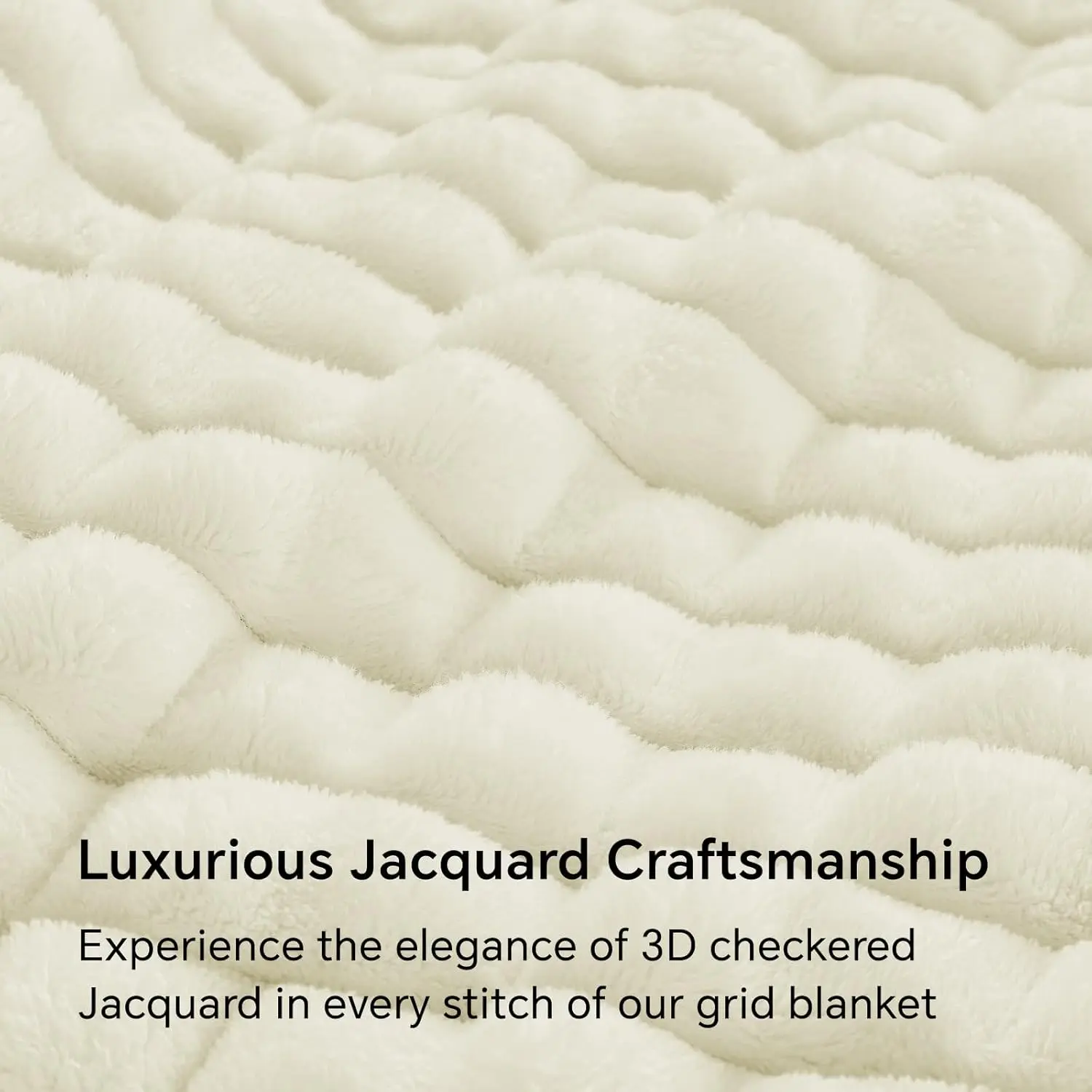 Cream Throw Blanket for Couch and Bed- Soft and Warm 3D Checkered Fuzzy Fleece Blanket, Luxurious Plush Cozy Blanket for Room, 50x60 inches