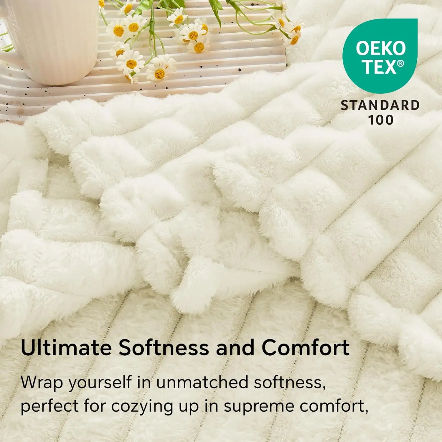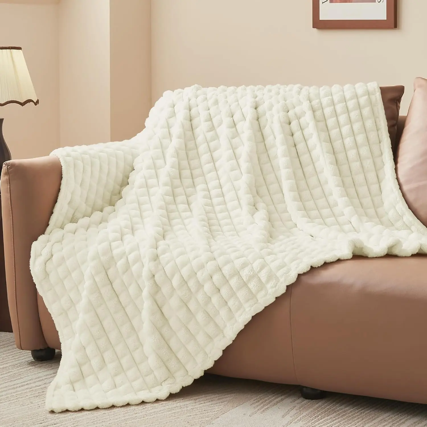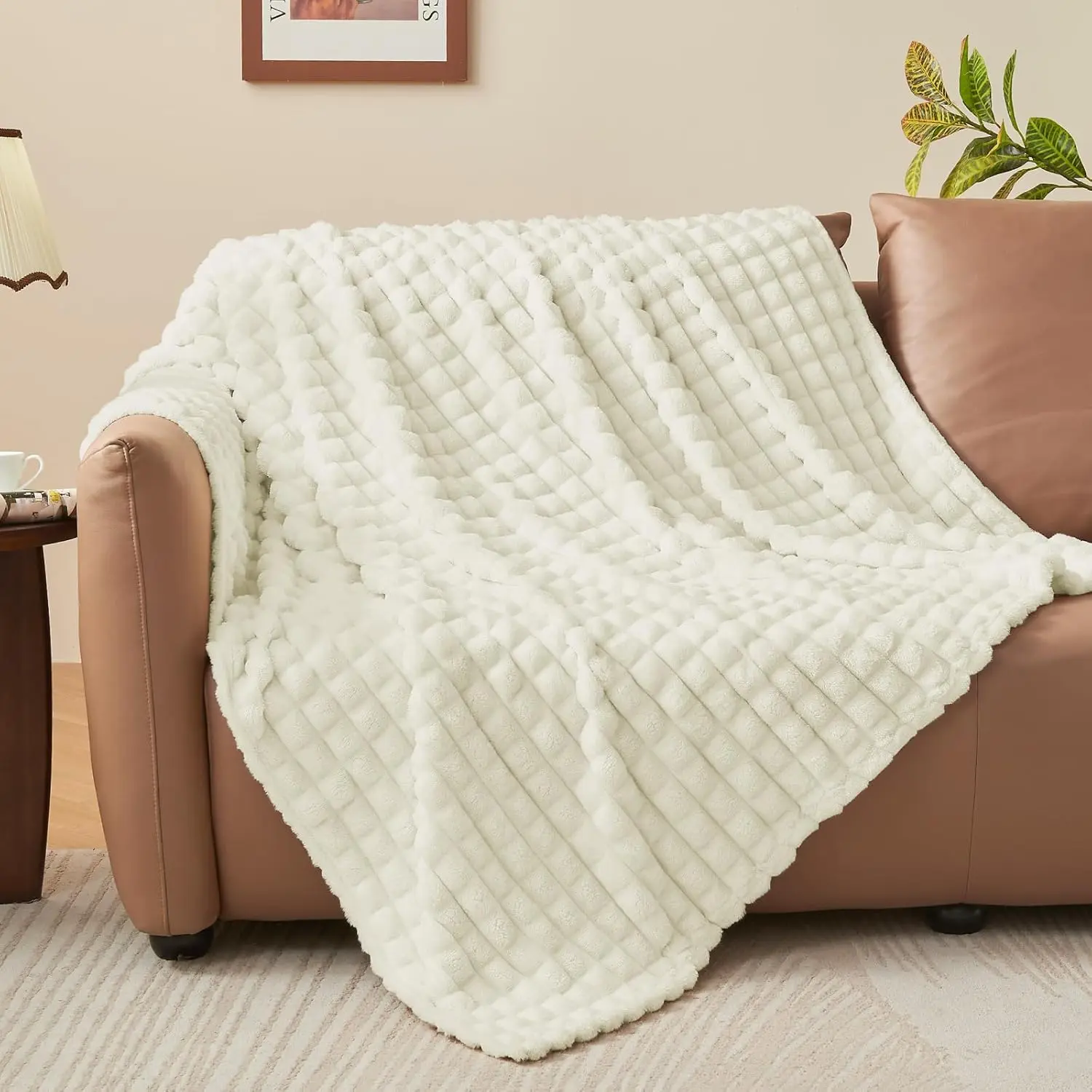 Cream Throw Blanket for Couch and Bed- Soft and Warm 3D Checkered Fuzzy Fleece Blanket, Luxurious Plush Cozy Blanket for Room, 50x60 inches
