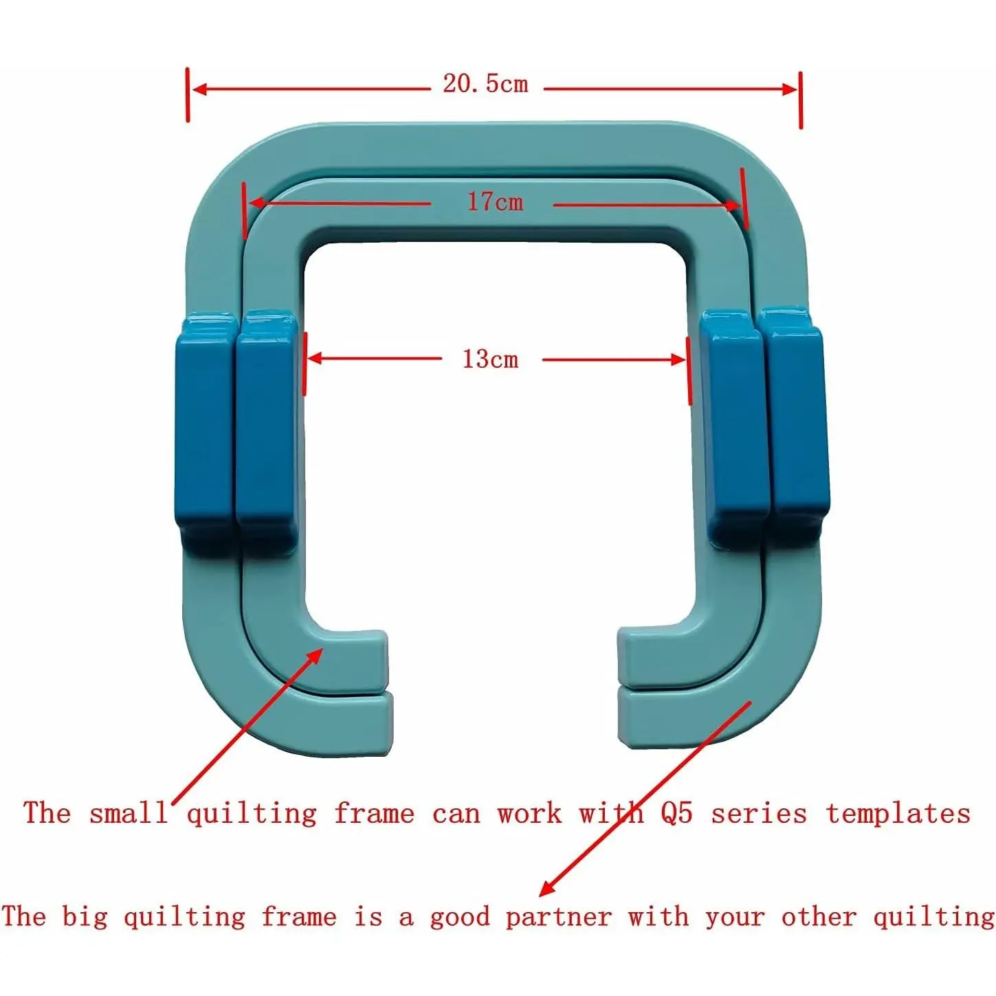 📏The small quilting frame can work with Q5 series templates, and the big quilting frame is a good partner with your other quilting template .📏the big quilting frame inside size17x17cm,outside size 20.5x20.5cm📏the small quilting frame inside size 13x13cm,outside size 17x17cm📏Only 2pcs quilting frames included.