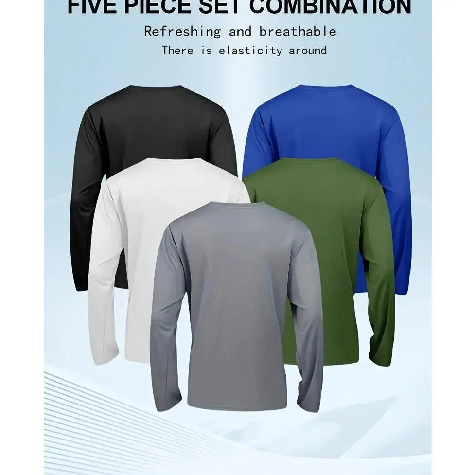5. 5 Piece Men's Quick Dry Long Sleeve Shirt - Moisturewicking, breathable polyester, crew neck, Outdoorfun,solid color casualsportswear, machine washable, moisture wicking garmentsCrew Neck T-Shirt | Stretchable Material Fathersdaygift