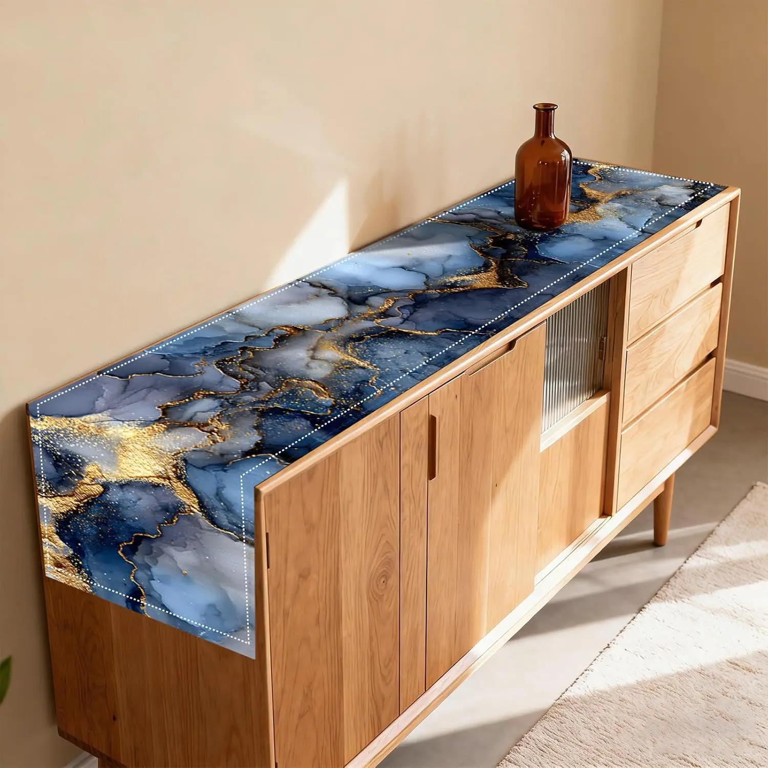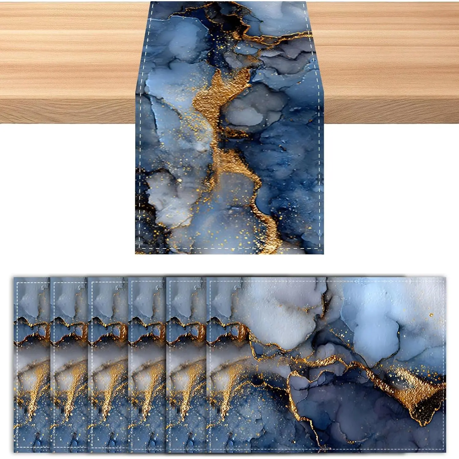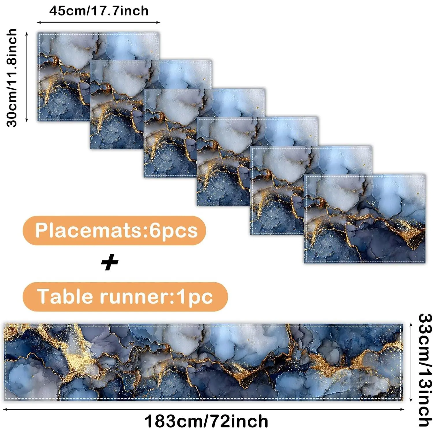 LinenYou'll receive 1 table runner and 6 square placemats (total 7 pieces in one set) in this set of 7.Made of linen-cottonTable runner: 72*13 inchPlacemats: 11.8*17.7 inchFeatures 2D printed deep blue & gold marble pattern with glossy gold accents, presenting a modern and luxurious lookSuitable for adults who pursue stylish table decorIdeal for kitchen dining, holiday dinners and evening gatheringsAdds refined touch to table layoutsThanks for choosing Nuxovilar!Our team is ready to assist you with any needs-feel free to reach out anytime!