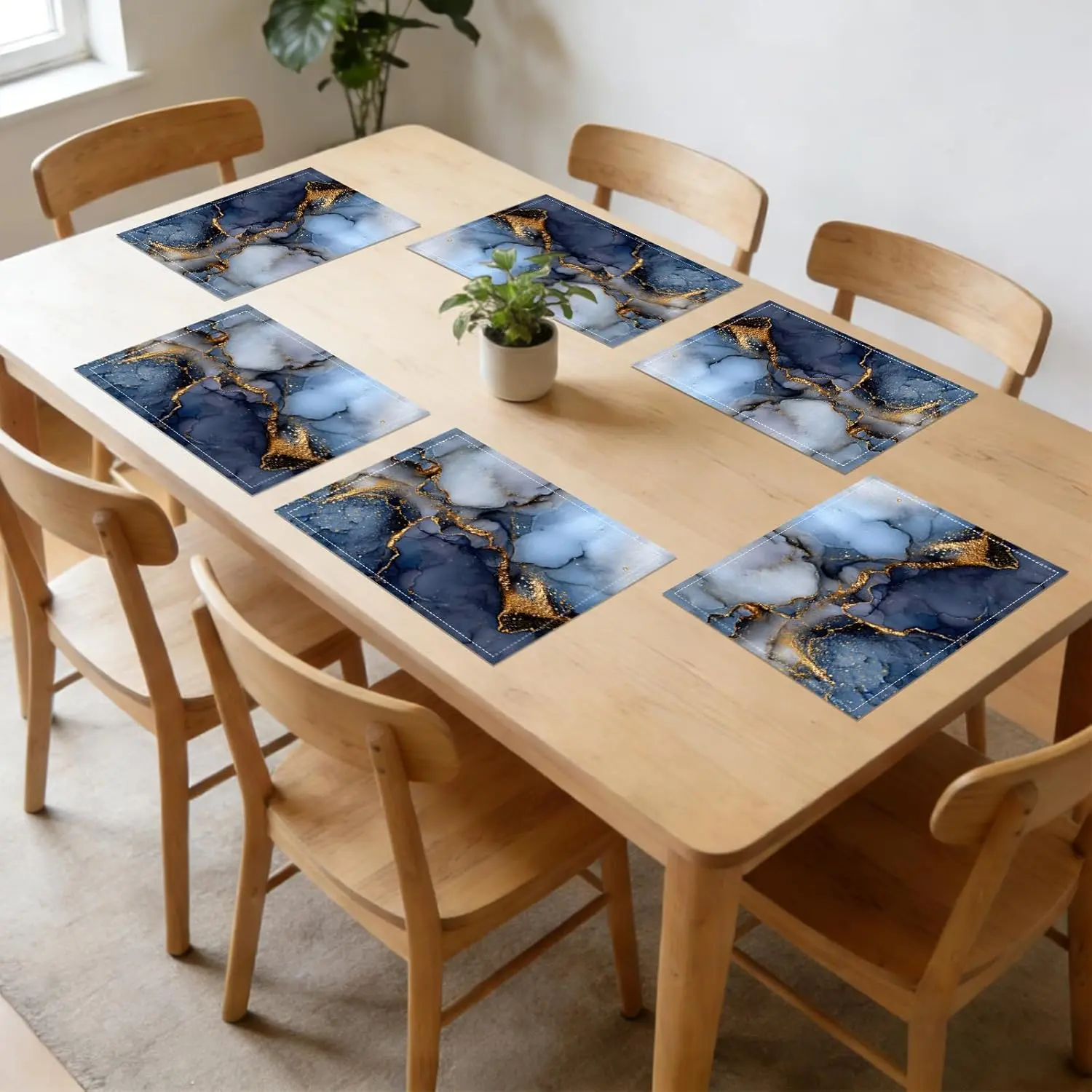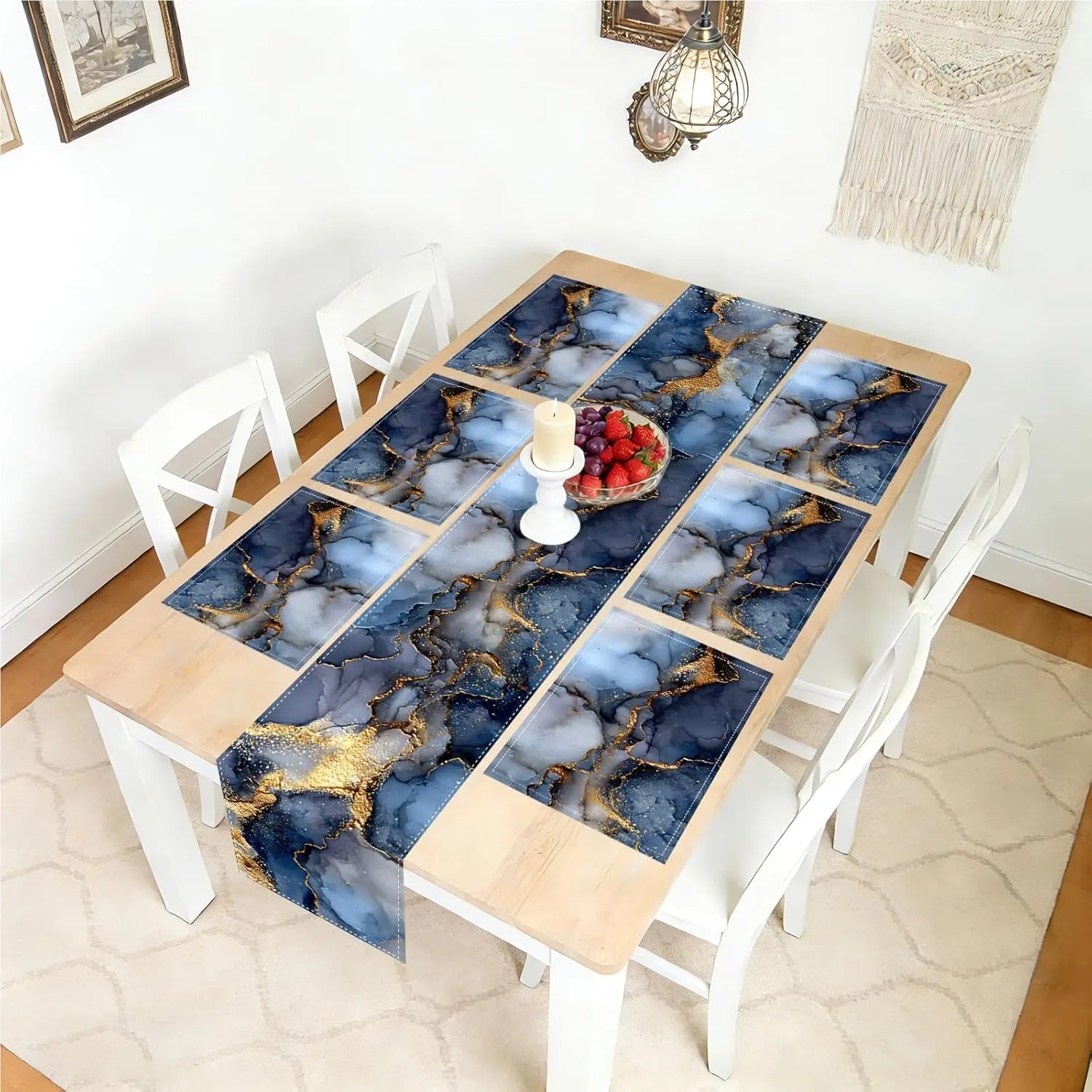 Square placemats Set of 7 and placemats Deep Blue&Gold Marble Pattern-Cotton Tablerunner(72X13inch)&6 Placemats(11.8X17.7) Table,Dining Room