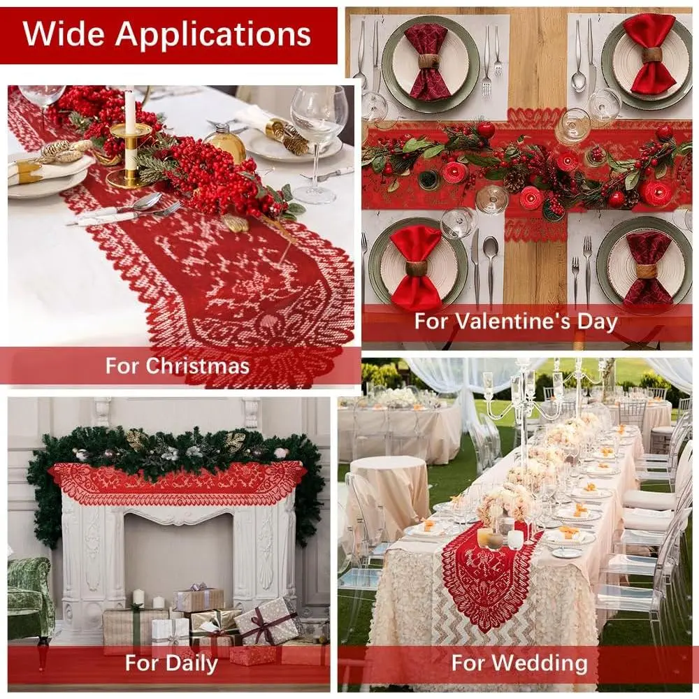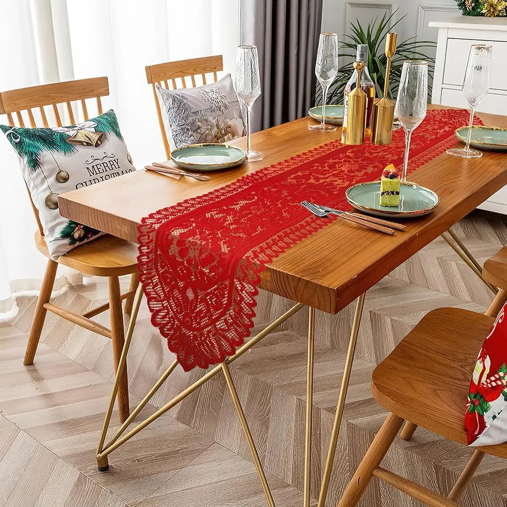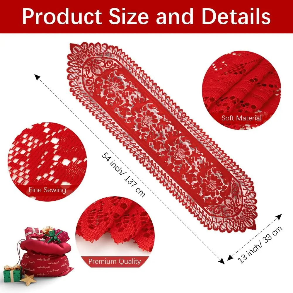 PolyesterHigh-quality Table Runner: Lace table runner is made of high quality lace fabric, soft and will not wrinkle, foldable and won't scratch the table.The coffee table runner is hand woven.The coffee table runner has delicate edges and beautiful patterns which can be used for a long timeProduct Size: The packaging comes with a 13 inch x 54 inch handmade crochet red lace floral table runner.Rectangle lace doilies is suitable for dining tables of 4-8 people and can create a strong festive atmosphere for youStylish Design: This red table runner features lace crochet craftsmanship, paired with hollowed-out floral pattern, and has a thick texture, making it a perfect addition to table decoration.Farmhouse table runner adds elegance and fashion to your home and dining table, bringing you an unforgettable Valentine's Day festive atmosphereEasy Care: Crochet cotton lace runner care is very simple, it can be washed by hand or gently circulated in cold water using a washing machine.After washing, choosing to dry flat or hanging to dry can keep the shape of the dresser scarf unchangedWide Applications: Doilies for tables can not only be placed on dining tables, bedrooms, computer tables, sofas, living rooms, desks, kitchens, coffee tables, pianos, beds, dressing tables, televisions, fireplaces.Red lace table runner can also be used on various holidays and occasions, such as Valentine's Day, Easter, weddings, dinners, baby showers, anniversaries, birthdays, indoor and outdoor parties, etc
