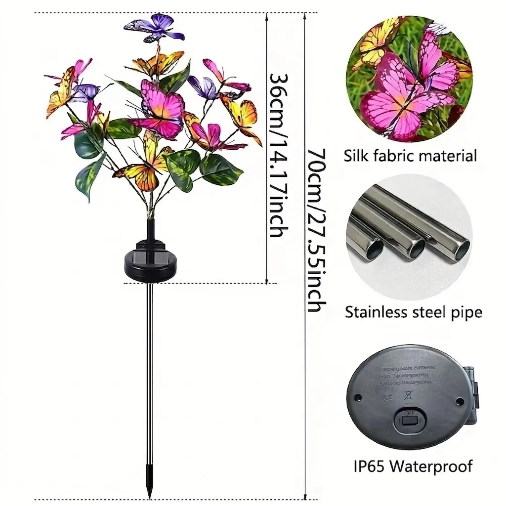 Metal pole, Plastic, LED Lights, Fabric butterflies