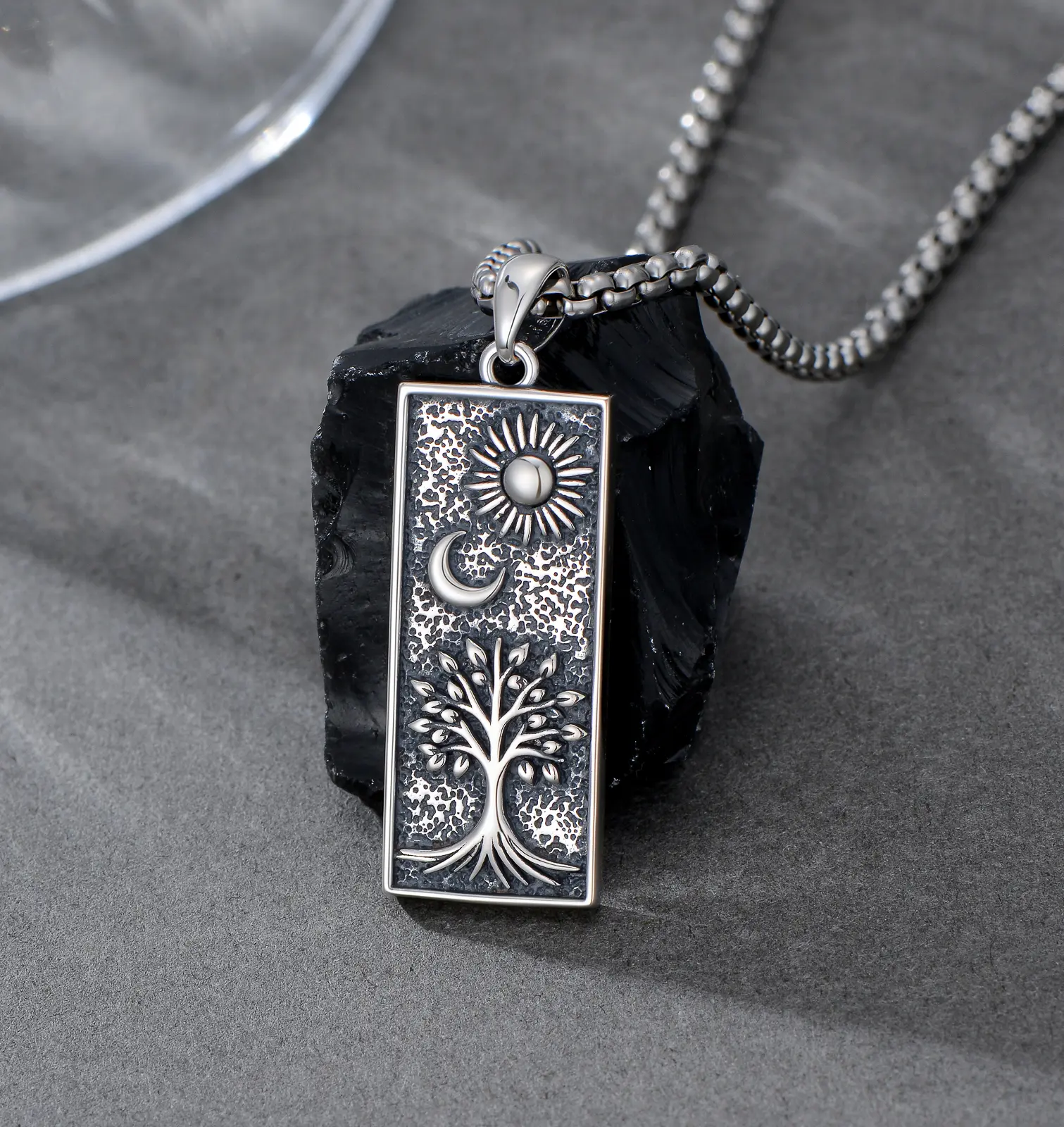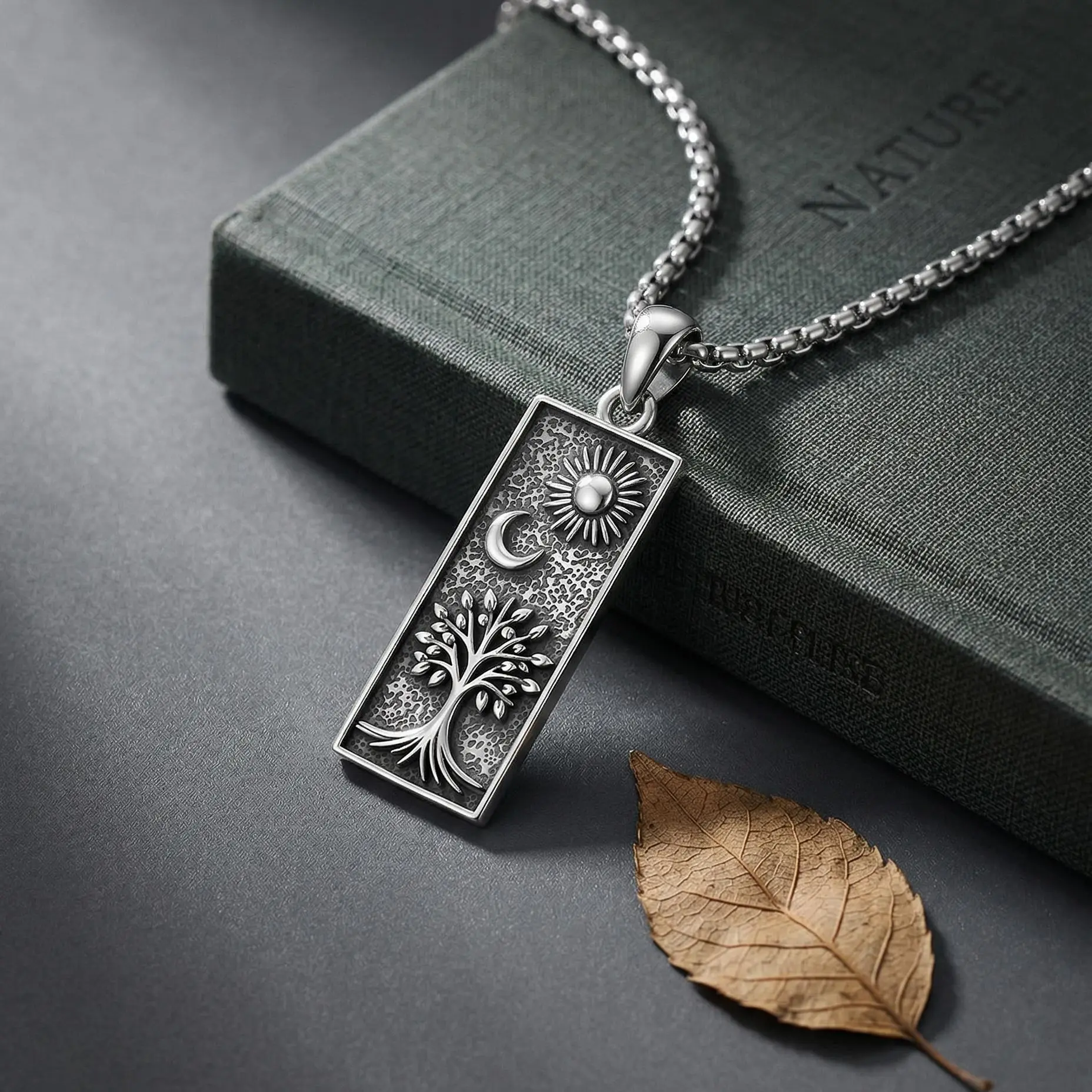 MEIDERBO Dream Chaser Sun Moon Tree of Life Necklace 925 Sterling Silver Oxidized Finish Pendant Bella Chain Stainless Steel Bead Chain 22+2 Inch