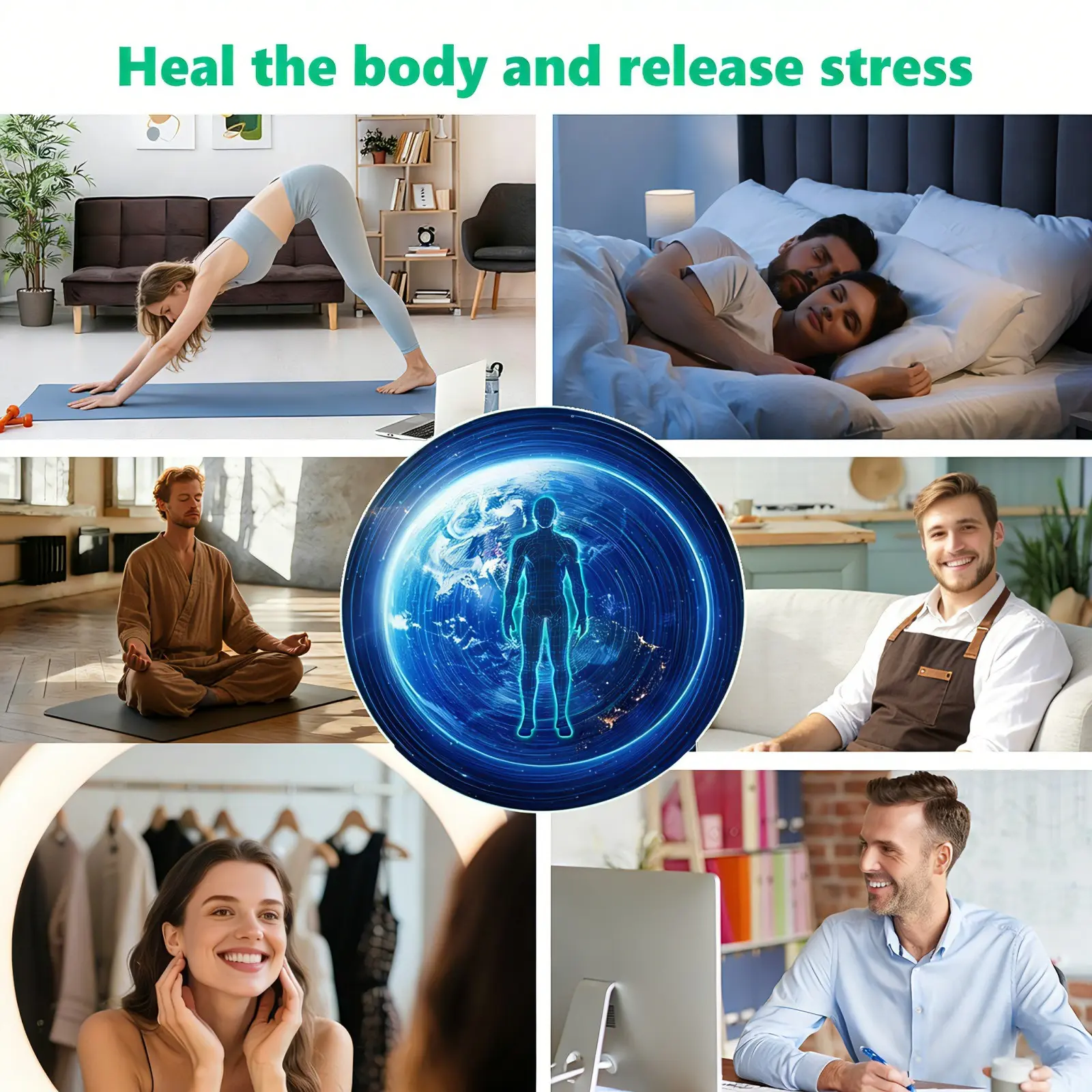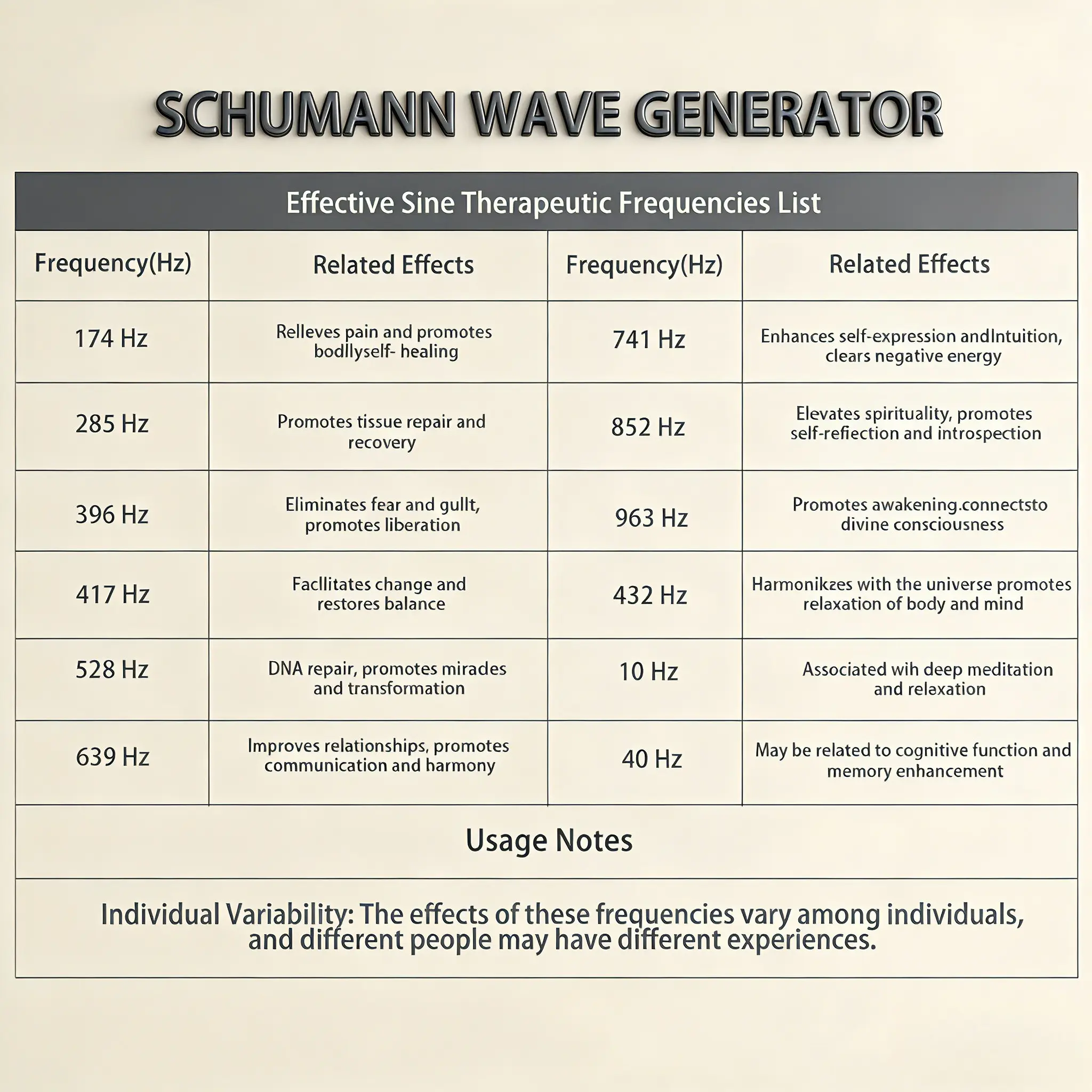 The Schumann Wave operates without producing any sound. An external speaker can be connected via a 3.5mm audio jack to listen to different frequencies. It works by improving the spatial environment, promoting relaxation, enhancing the body's perception of sound and images, improving health, increasing work efficiency, and relieving mental stress. It uses a digital circuit crystal oscillator frequency reference, resulting in higher stability and stronger anti-interference capabilities.