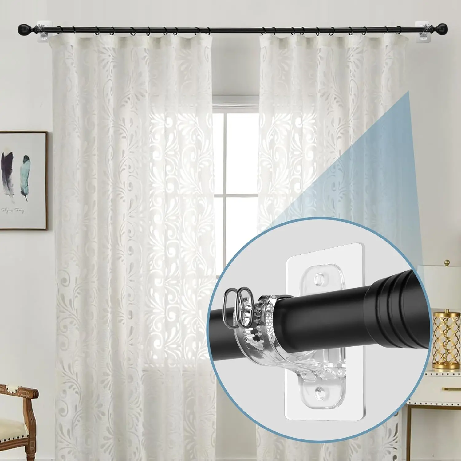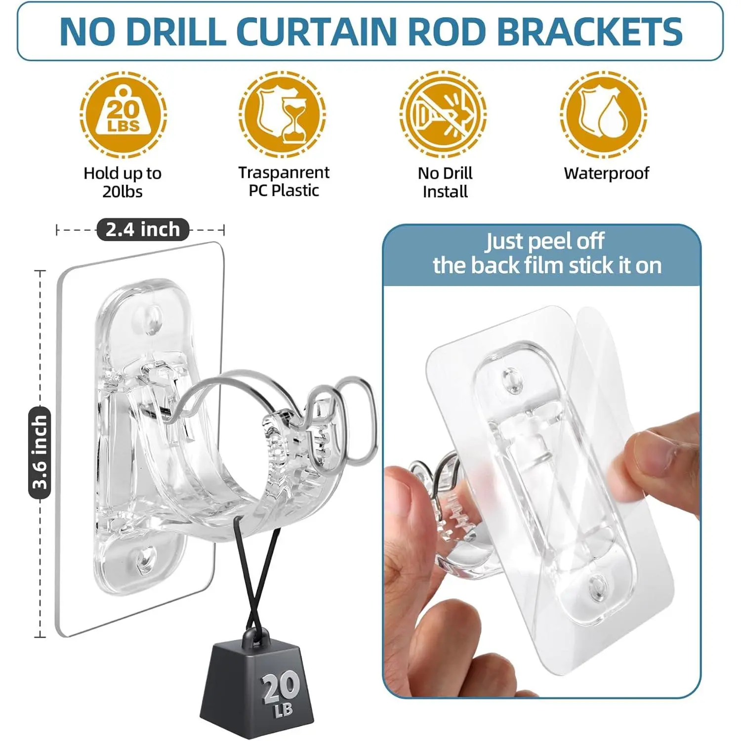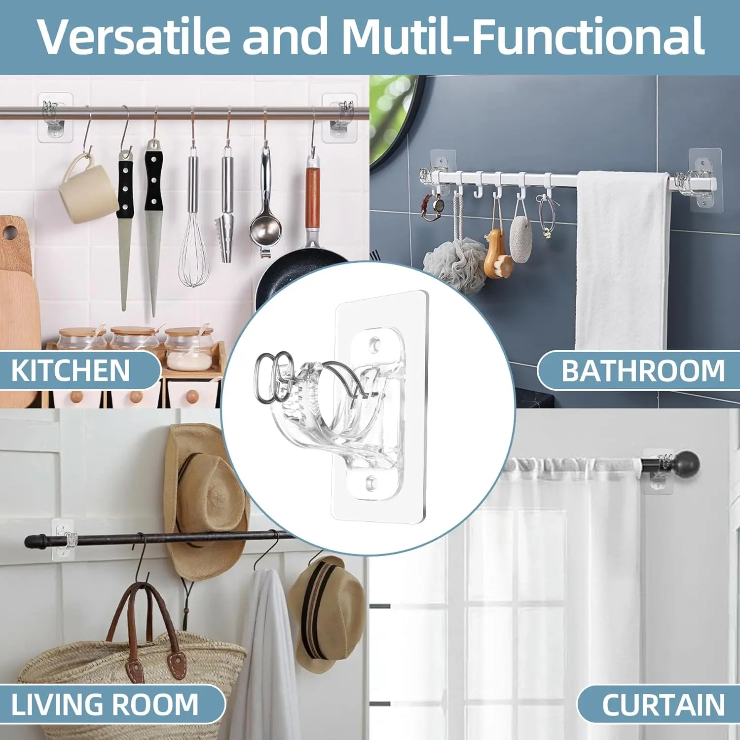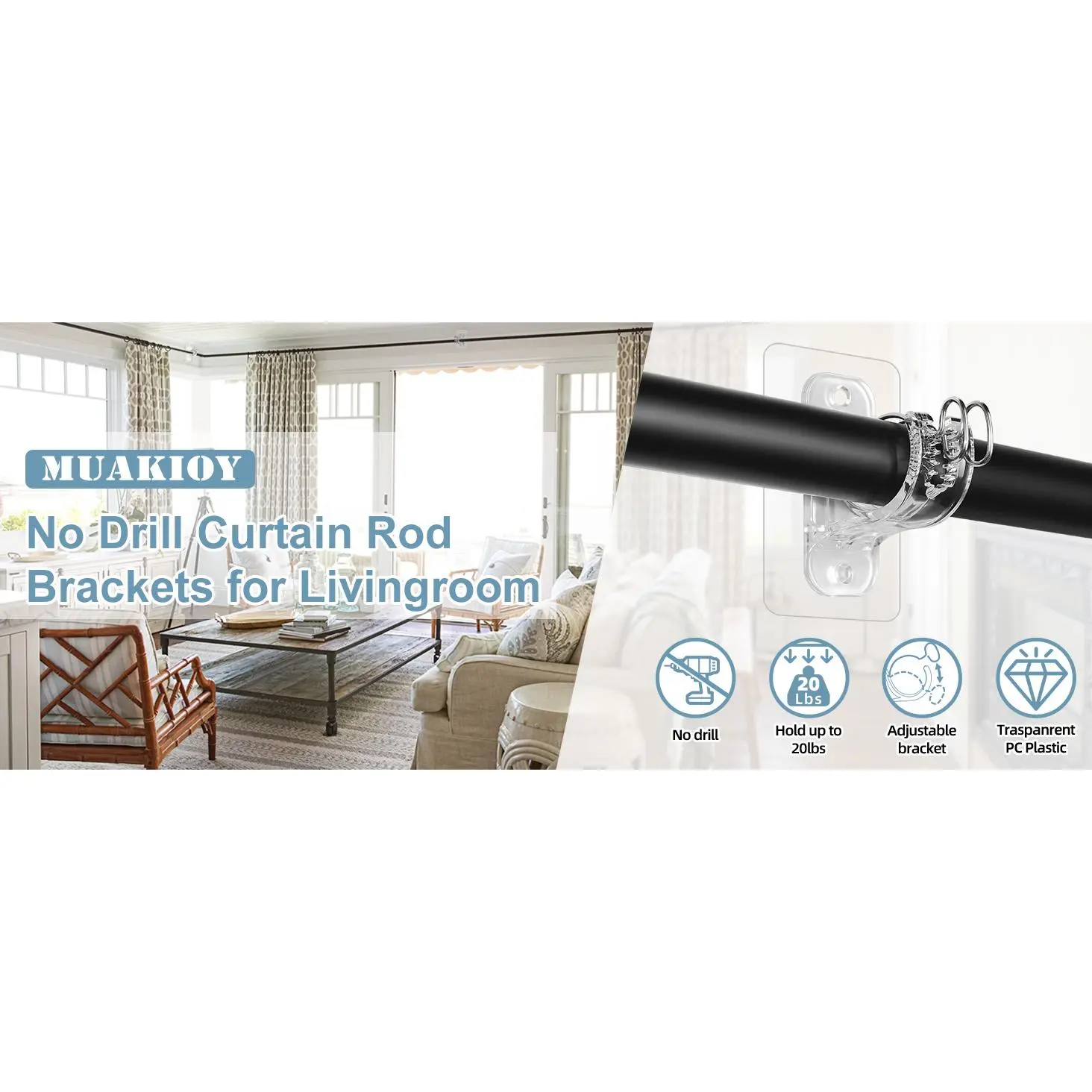 No Drilling, no screw, no nail curtain rod holders - Damage-free heavy duty quick hang curtain brackets - Leaves zero damage or residue on walls!Strong Adhesion Hold up to 20 Lbs: MUAKIOY curtain rod holders no drilling crafted from premium transparent PET plastics and engineered to maintain clarityno screw hook with strong adhesive tapes can hold up to 20lbs, suitable for various smooth surfacesCurtain Hooks for Drapes 0.5'' - 1.7''Dia: Curtain rod brackets for wall are adjustable and easy to stick in place for the curtain rods in dia 0.5 to 1.7 inches, convenient and easy to use, no need to worry about the brackets slipping offDamage-Free Installation: Easy curtain rod brackets no drill require no drills, nails, or tools, making them a breeze to installJust peel and stick the adhesive back onto the smooth surface (such as home glass, mirrors, ceramic tiles, marble, stainless steel, etc)Versatile and Multi-Purpose: Adhesive hooks for curtain rods are fit for any space, including your bathroom, bedroom, living room, apartment window, office or outdoor curtains on patio.Curtain rod hooks no drill also ideal for rental homes where drilling holes isn't an alternative options, allowing renters to easily hang temporary curtains8-Pack MUAKIOY Brackets for All Your Needs: No hold curtain rod hooks for closets, cabinets, hangers, kitchen and that require a fixed rod, strong enough for regular usagePlease note: Use a hair dryer to heat the no drill curtain rod brackets for a few seconds, and they will leave no residue when removed.Should you have any questions, feel-free to reach out