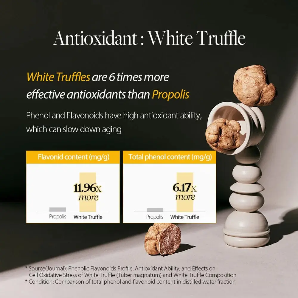 1. Premium White Truffles carefully extracted from Piedmont, Italy, infused with Tocopherol(vitamin E) make d'Alba's signature ingredient Trufferol. Full of antioxidants, white truffles are 6 times more effective than well-known propolis *source: Phenolic Flavonoids Profile and Antioxidant Ability, and Effects on Cell Oxidative Stress of White Truffle (Tuber magnatum) and White Truffle Composition *condition: Comparison of total phenol content by distilled water fraction