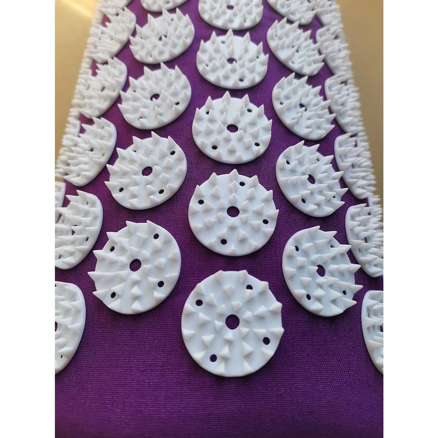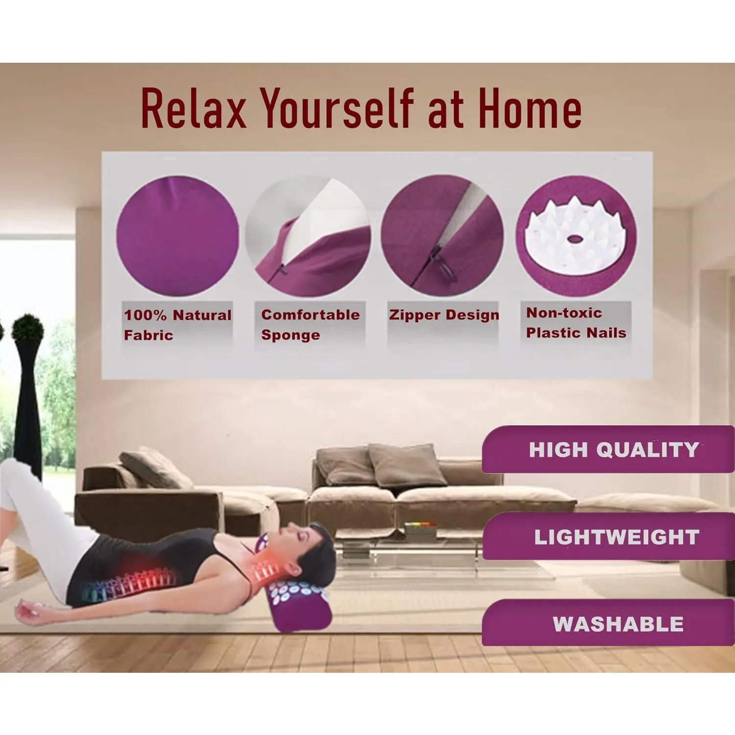 PREMIUM MATERIAL: The acupressure pillow has thousands of non-toxic plastic nails which sti-mulate acupressure points throughout the body without puncturing skin.The pillow has 1782 acupressure nails.Natural fabric and comfortable sponge.RELIEF TENSION & STRESS: The sharpness of the plastic nails improve circulation, relieve pain, increase energy level, activates the body system, bringing one into very deep relaxation, promotes all-round better health and well-being.LIGHTWEIGHT & ZIPPER DESIGN: Pillow size: 14.5" x 6" x 4"(H).Acupuncture pillow is lightweight and portable for easy storage and travel, about 8.5 oz.There is zipper on the back side, you can remove the cover and sponge easily.NOTE: HAND WASHED, Do not wash or dry by machine, as this may damage the acupressure nails buttons.WHOLE BODY USED: Used it under the neck, head, lower or upper back, feet or arm, etc.It can relieve stress, headache, tiredness, tension, neck back pain, muscle aches.It is designed for optimum coverage, whether for the whole body or for just one section.HOW to USE: Simply put it on a chair, bed or floor.You can lie down or stand on it with or without clothes.Every single day, you can use it in a short time, or 10 to 20 minutes or as long as you like without side effects.Let us know while any issues or requirement.