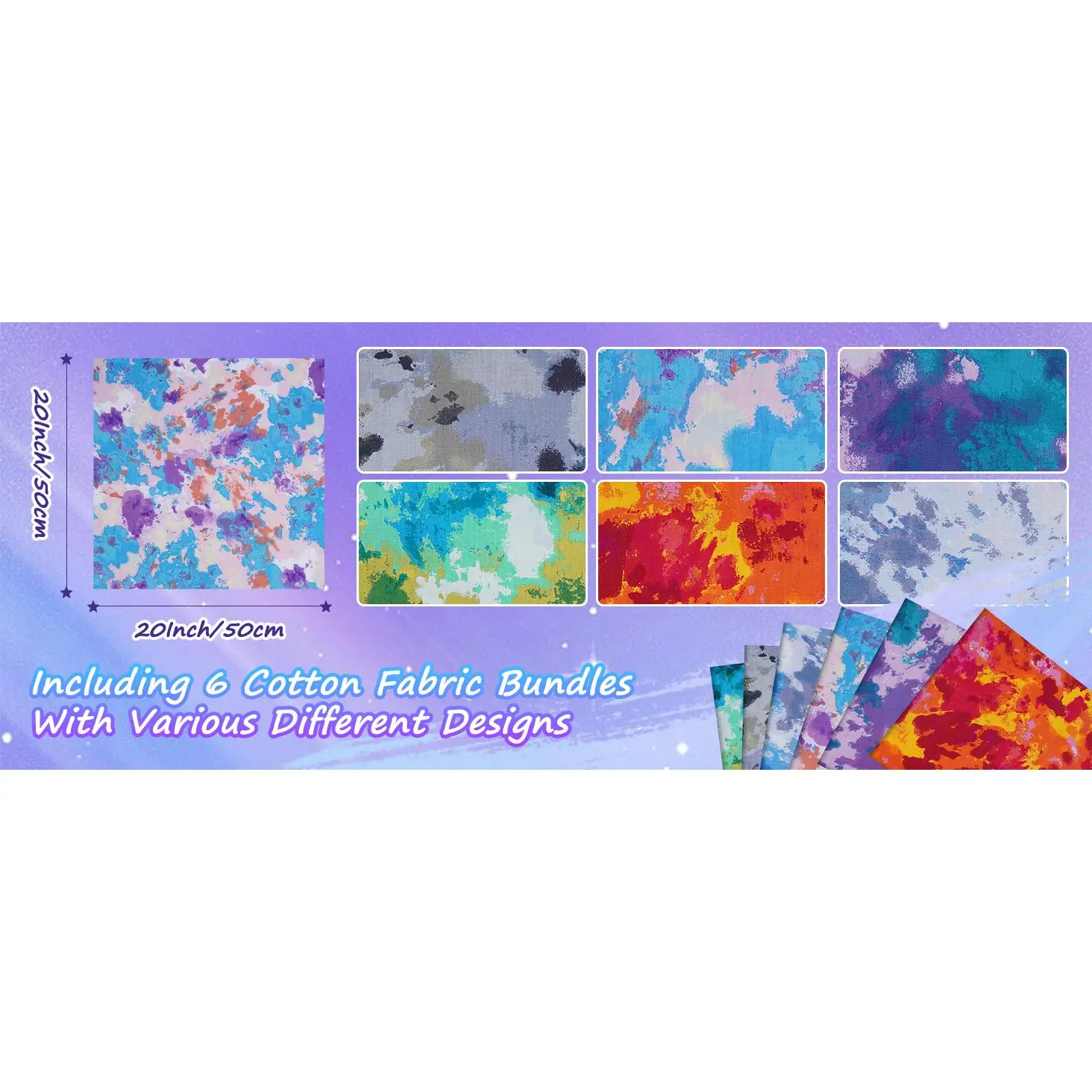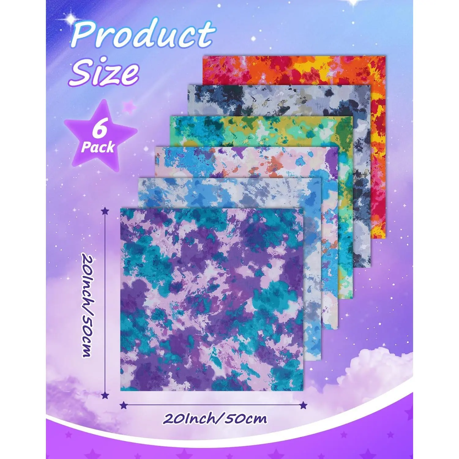 Unique Tie-Dye Style: This set includes 6 cotton fabric squares (20x20in / 50x50cm) with bold tie-dye patterns, making them the perfect fabric for sewing colorful quilts, bags, or fat quarter bundles with a modern artistic twistVibrant and Eye-Catching: Each cut features rich tones and layered textures that make fat quarters fabric projects stand out.Ideal for patchwork, home décor, or accessories that need a creative pop, these versatile pieces blend easily with quilting squares and fabric bundlesVersatile Mix-and-Match Options: The artistic tie-dye look coordinates effortlessly with solids and prints.Pair with fat quarters, fat quarter bundle sets, or classic fabric quarters for a custom look, or layer with fat quarters fabric bundles for unique patchwork texturesPremium Cotton Quality: Crafted from soft, durable 100% cotton quilting fabric, these squares are smooth, breathable, and easy to handle.Perfect for precise piecing with cotton fabric for quilting, patterned fabric, or building fabric fat quarters bundlesCreative Freedom for All Quilters: Whether you're assembling quilt squares, experimenting with quilting kits, or refreshing your stash of cotton fabric fat quarters, these pieces fit perfectly into any quilt kit, quilt fabric bundles, or sewing fabric collectionNote: Due to manual cutting, there may be a slight deviation in size