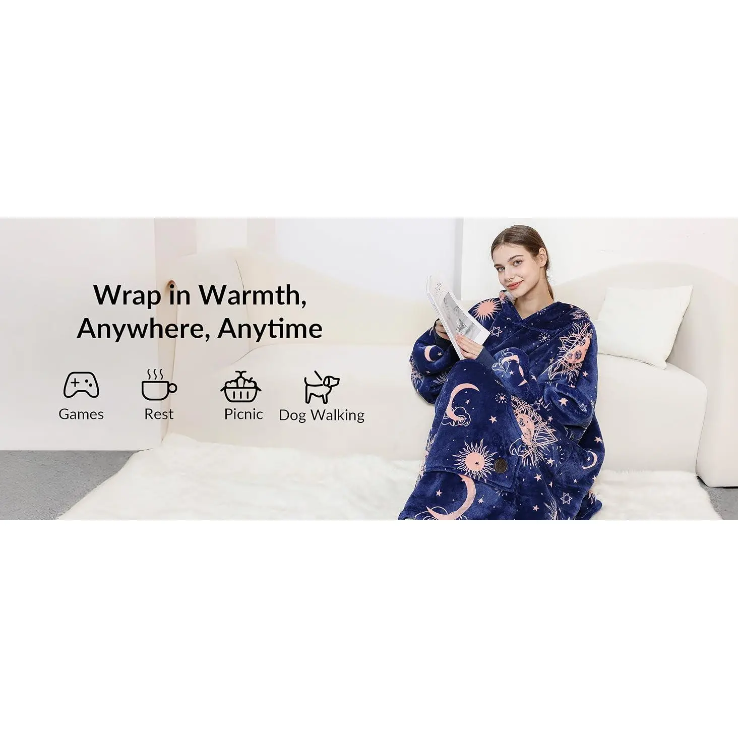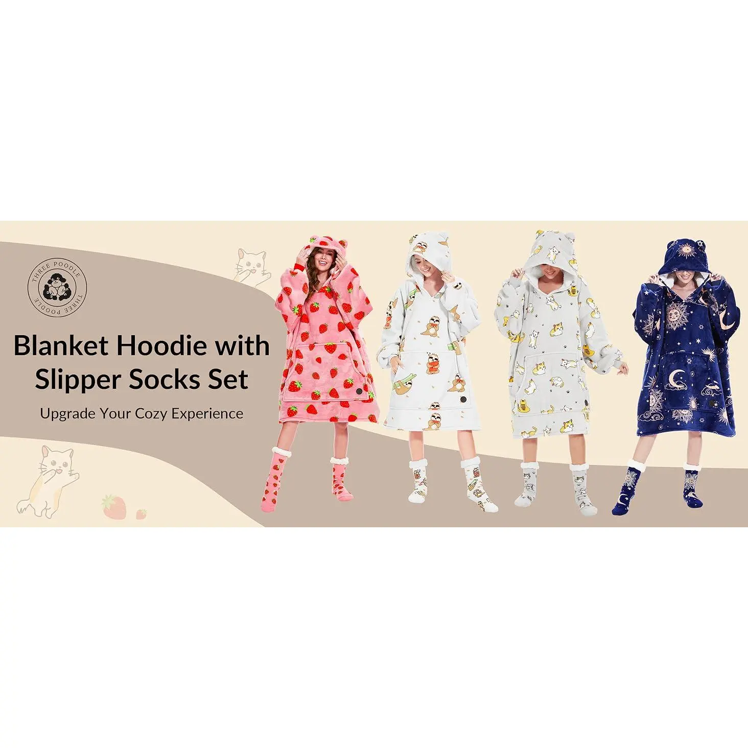 All-in-One Comfort: Immerse yourself in the ultimate relaxation with this all-in-one comfort set.It seamlessly combines a plush blanket hoodie with a pair of slipper socks.Whether you're lounging on the couch or braving the cold, this set ensures your body and feet stay warm and comfortable in style.Luxurious Comfort: THREE POODLE wearable hoodie blanket features a soft and cozy Sherpa lining on the inside and a lightweight plush microfleece exterior, soft and skin-friendly.One Size Fits All: The oversized blanket sweatshirt is perfect for people of most shapes and sizes, providing exceptional mobility.The heel-less socks are versatile, fitting comfortably for women, men, and kids with no size restrictions.Slipper Socks with Grips: These fuzzy socks come with non-slip rubber that offers a reliable grip, preventing any accidental slips on smooth surfaces.Perfect Gift for Your Loved Ones: THREE POODLE Sherpa hoodie blanket with fuzzy socks is an ideal present for family, friends, and coworkers on special occasions. Ideal for birthdays, anniversaries, Mother's Day, Valentine's Day, Thanksgiving, and Christmas, it delivers boundless warmth and affection.