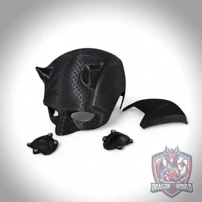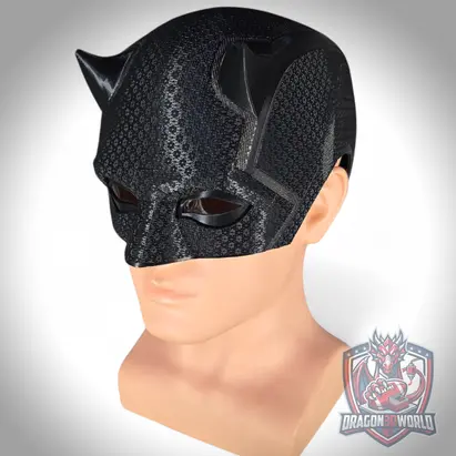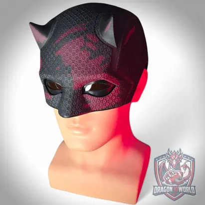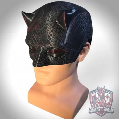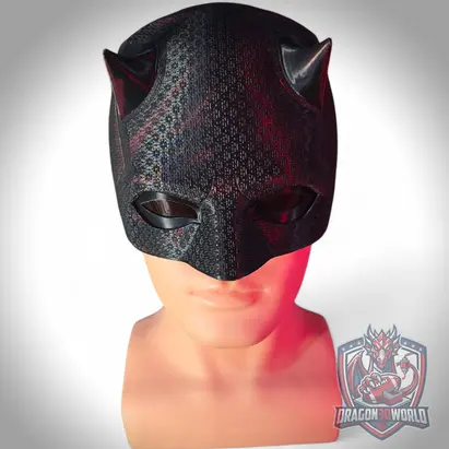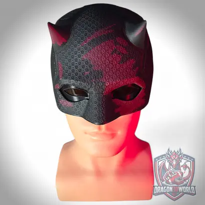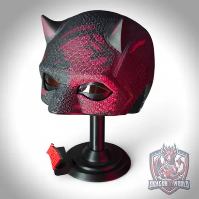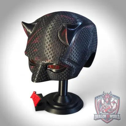 Daredevil Born Again Season 2 inspired wearable black cowl mask for cosplay and display. 3D printed replica with textured finish, available in Black Clear, Red Details, and Red Details V2. Choose with stand or without stand. Includes 1 eye set. Ideal for collectors, cosplay, and shelf display.