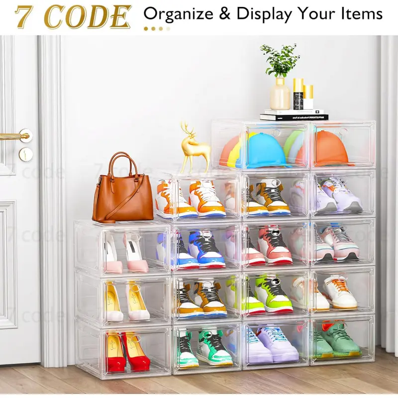 Thickened Clear Shoe Storage Organizer with Magnetic Door, Sturdy Stackable Shoe Boxes for Closet, Collapsible Space-Saving Shoe Rack for Sneakers & Boots, Plastic Shoe Cabinet Box Set, 6 Pack, White