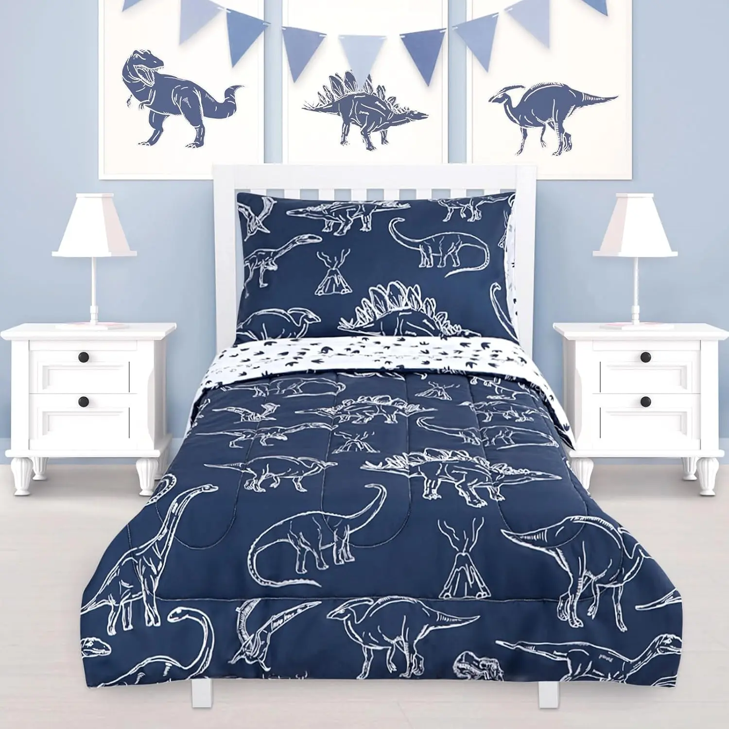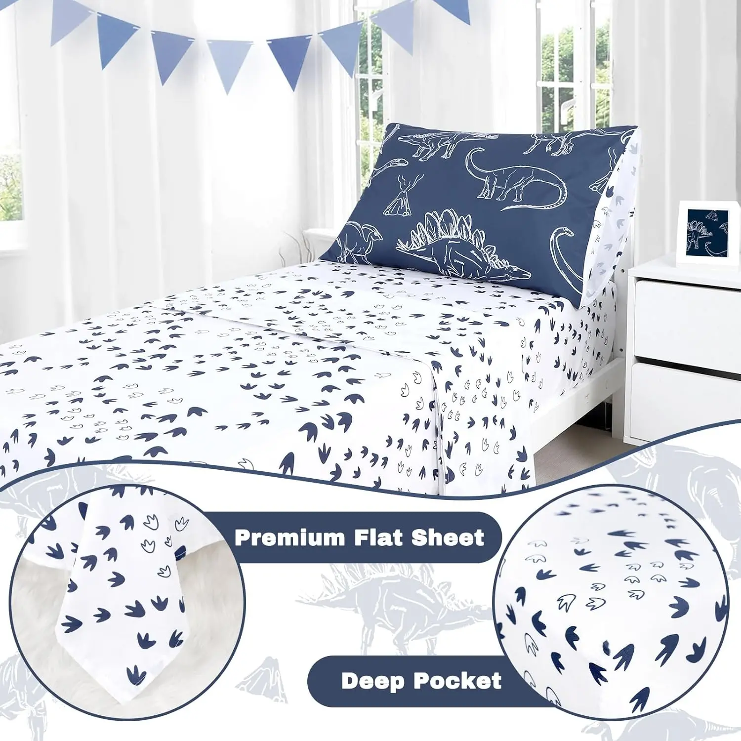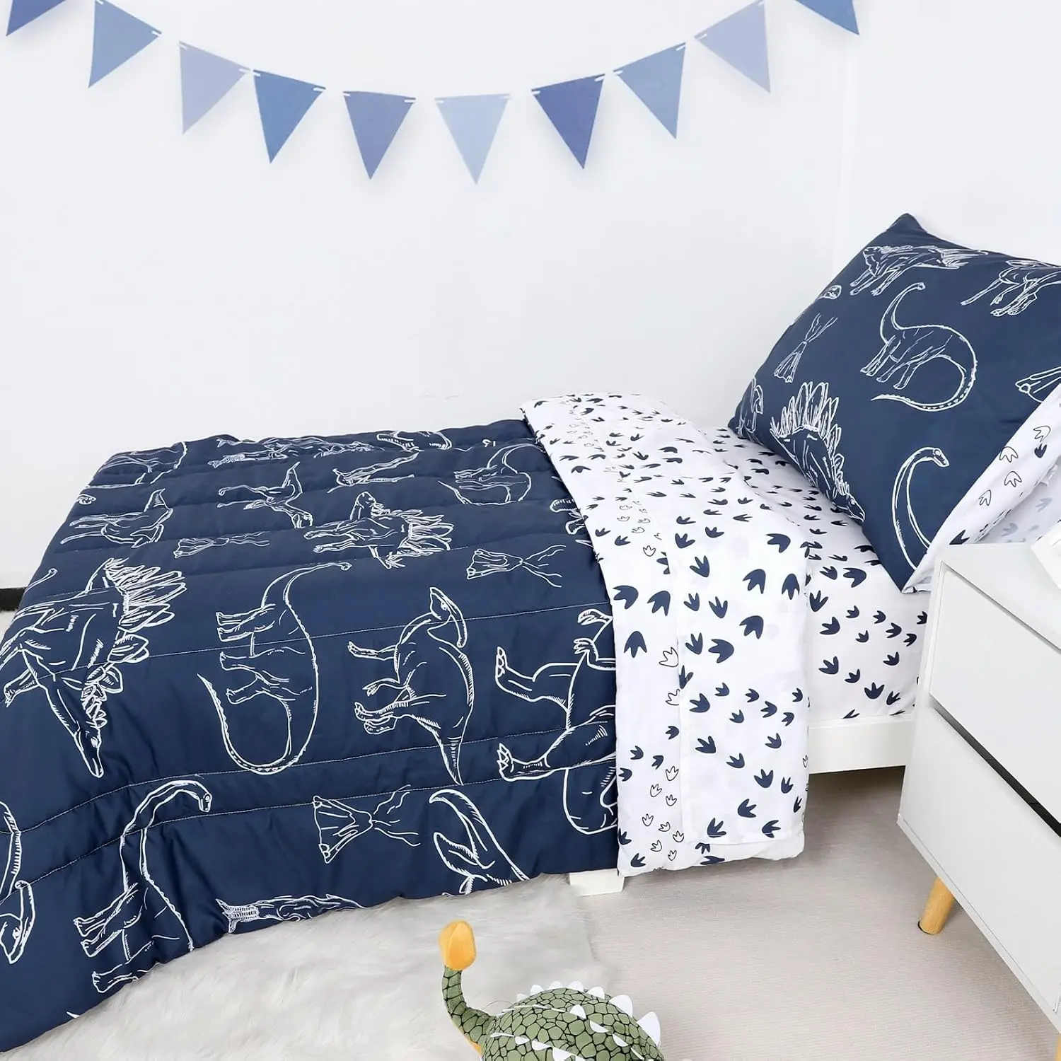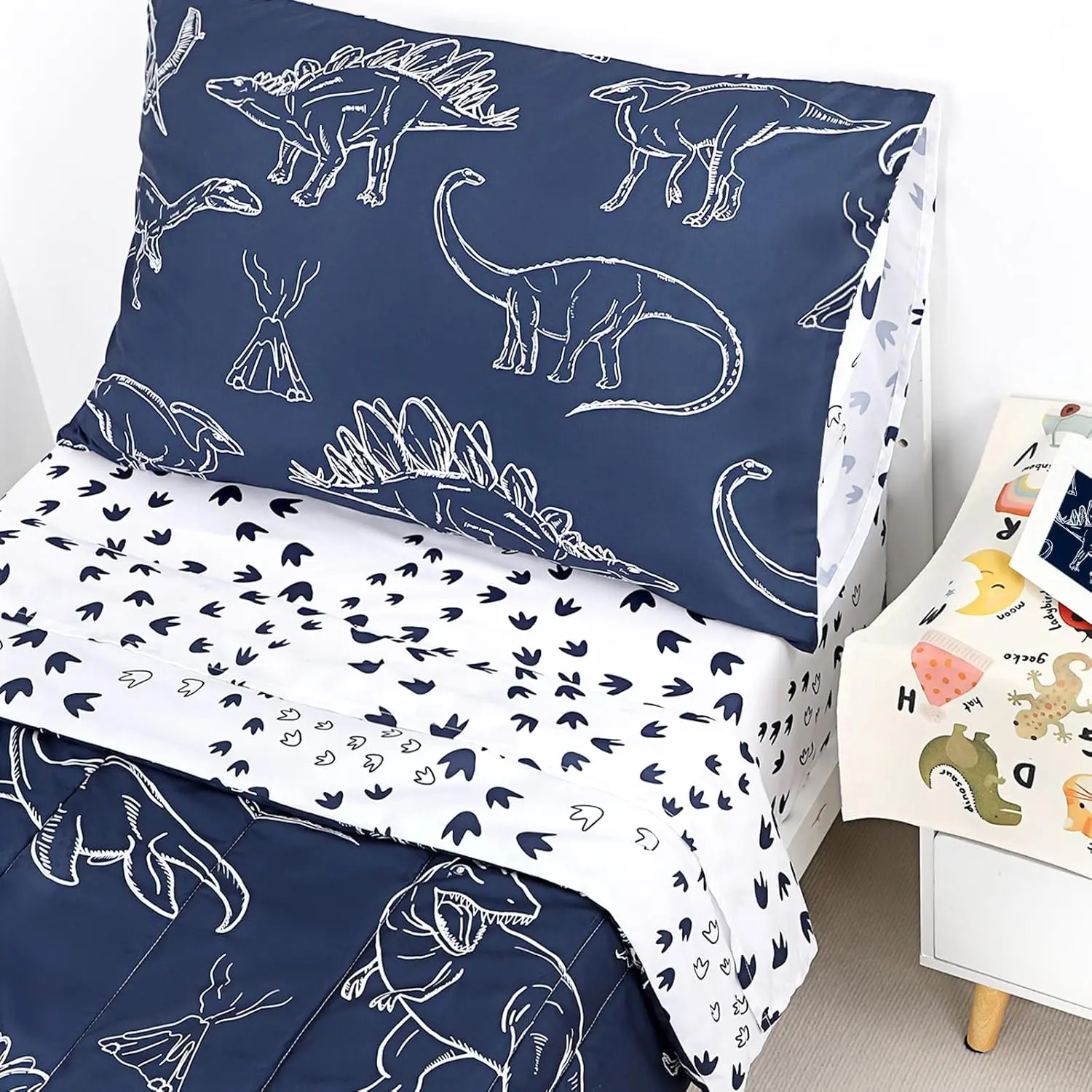 PolyesterWhat You Get: All pieces perfectly fit a standard crib mattress and toddler bed, NOT suitable for twin size.You will get 4 pieces toddler bedding set that includes, 1 reversible comforter 42" x 57", 1 fitted sheet 28" x 52" x 8'', 1 flat top sheet 45" x 60", 1 pillowcase 20" x 30".Not included the pillow.Soft as Cloud: You will be amazed by the softness and comfort of our toddler bedding, which is made of carefully selected polyester fabric with good breathability and warmth, gentle to your baby's skin, skin friendly and lightweight, like sleeping on the cloud.Give your little one a cozy sleep whole the night.Cute Dinosaur Theme: The comforter has a cute design that features adorable dinosaurs on a navy background, which will make it perfect for baby boys who love animals and fully attract your baby to go to bed early.The dinosaur bedding set will blast them into sweet dreams, and it makes an addition to the nursery decor.Good choice for the birthday gift or festival gift!Easy Care and Made to Last: Recommend machine washing separately on a gentle cycle in cold water.Tumble dry on low heat when needed.No bleach and no Dry Clean.The toddler sheets do not fade, wrinkle, shrink even with many washes.Good Sleep: As we all know, good sleep is important for a baby's growth and development, our dino toddler bedding set with skin friendly fabric and excellent workshop provides your children with warm and comfortable sleep.Complete the look of your baby's nursery with the dinosaur toddler bedding set.