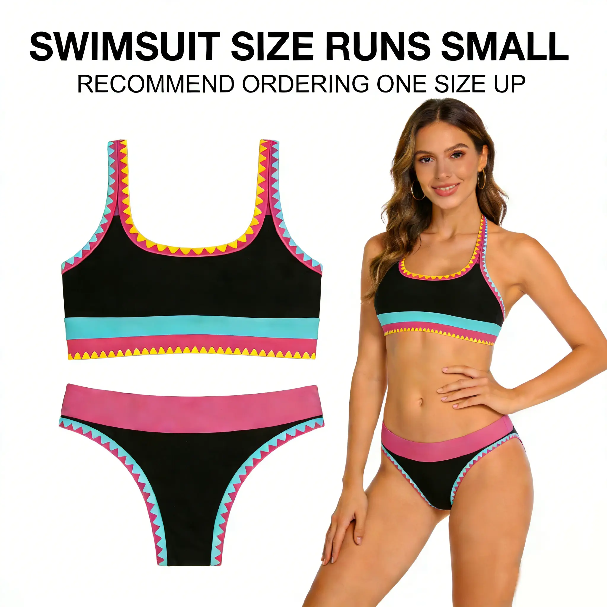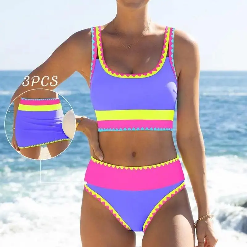 2026 Women Three-Piece Bikini Set Beach Ball & Kayak Print High Waisted Adjustable Wide Straps Fluorescent Sporty Swimwear UV400 Protection For Summer Beach