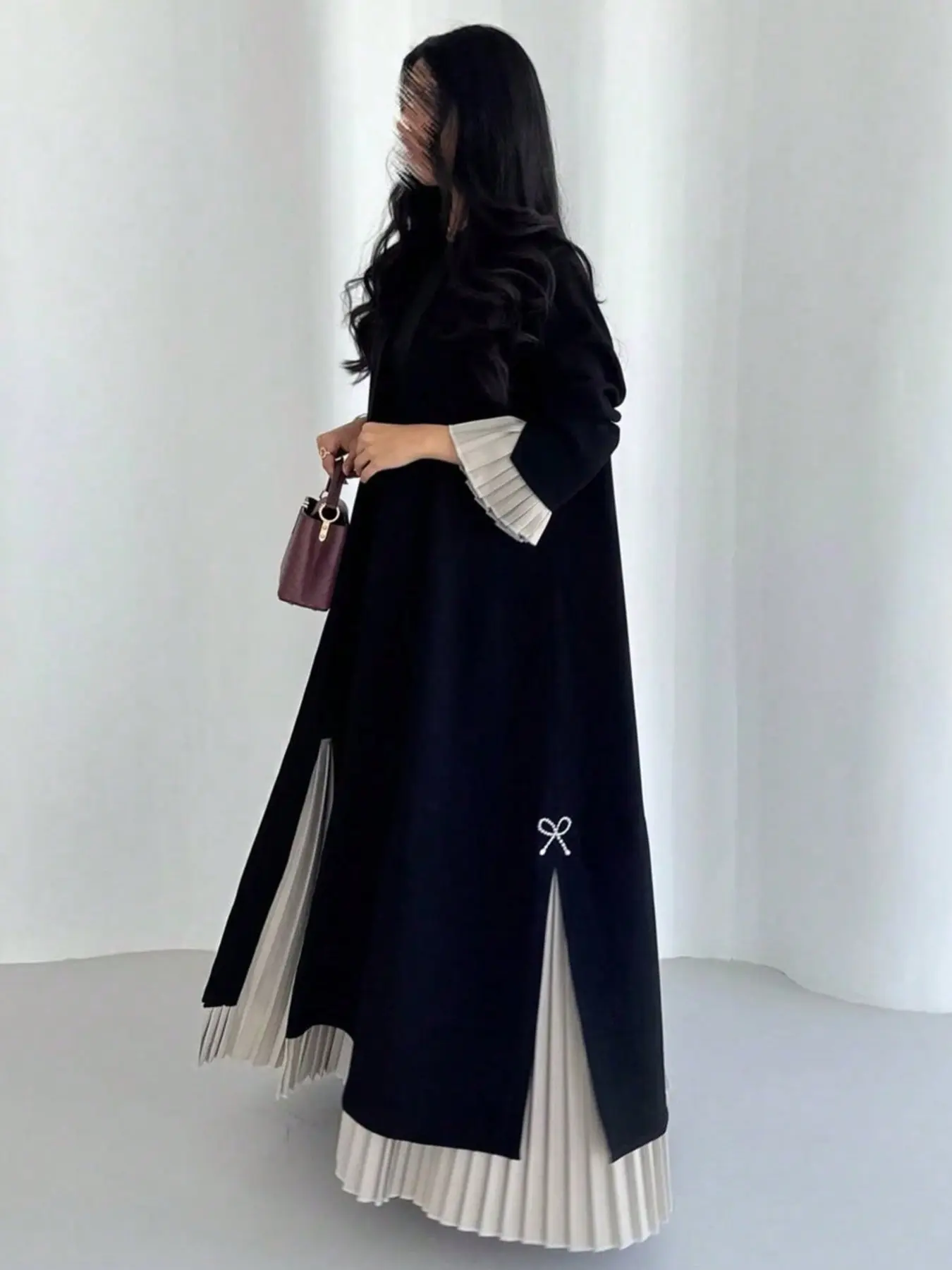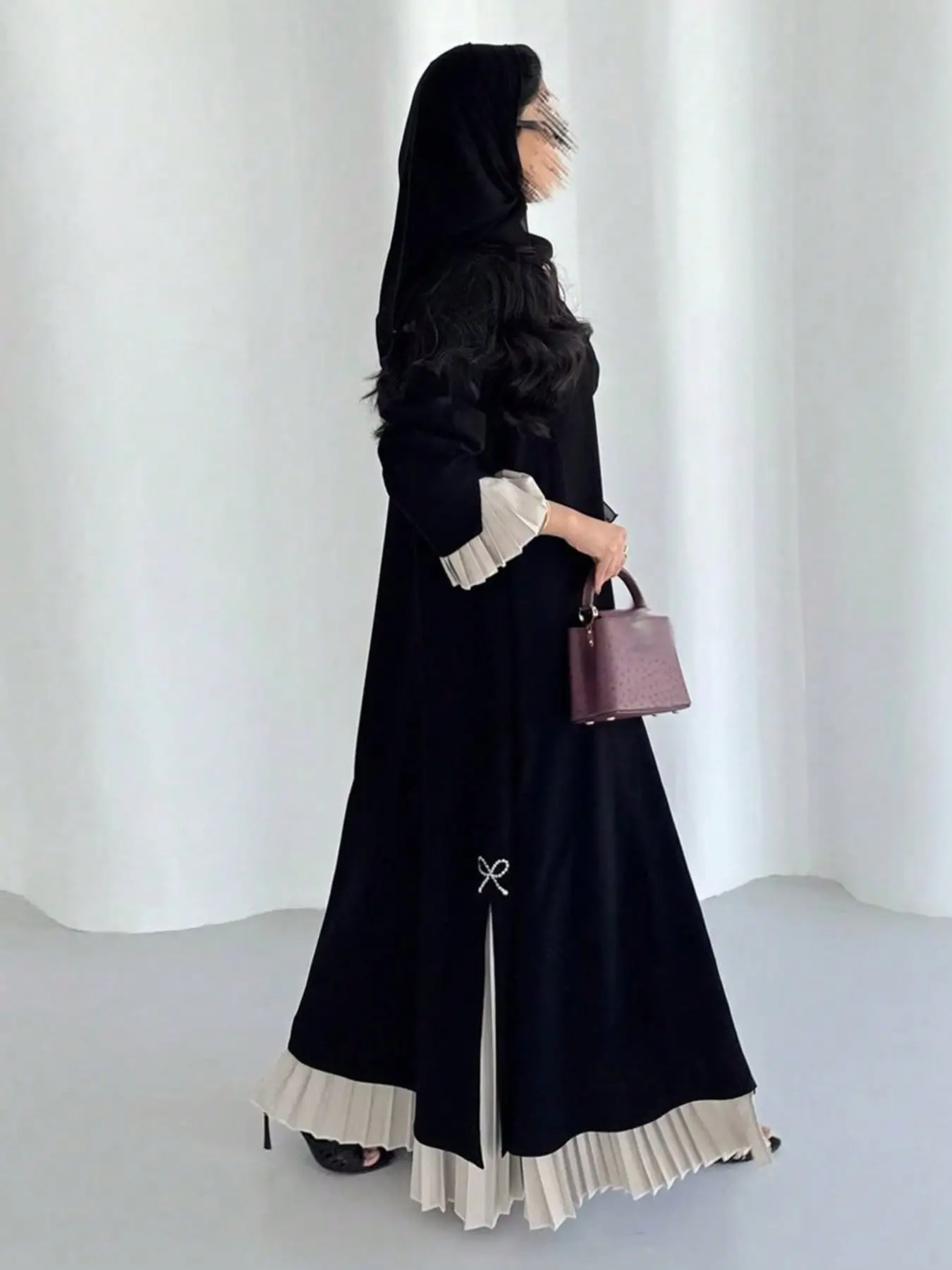 Commute Party Pleated Patchwork Abaya, Pearl Bow Loose Fit Long Outer Robe, Muslim Luxury Women's Clothing, All Seasons