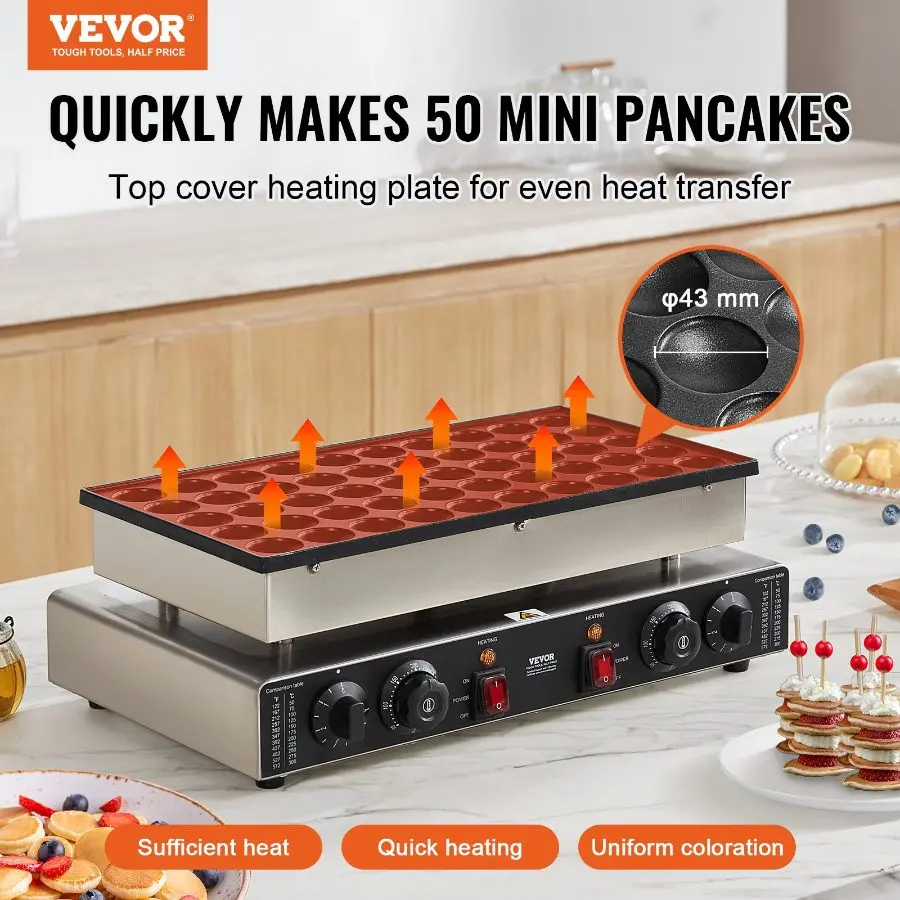VEVOR Mini Dutch Pancake Maker, 50PCS 43mm Diameter Dorayaki Baker Machine, 1700W Commercial Electric Poffertjes Grill, Non-stick Stainless Steel, Dual Temp Time Control, for Home Kitchen RestaurantProfessional Dorayaki Baker MachineQuick ProductionExcellent QualityEasy to OperateDIY Various DessertsEasy to cleanType: 50P, Color: Silver, Item Model Number: PC-50, Product Weight: 21 lbs/ 9.4kg, Product Dimensions: 21x12x7 inch/ 526x300x180mm, Main Material: Stainless Steel