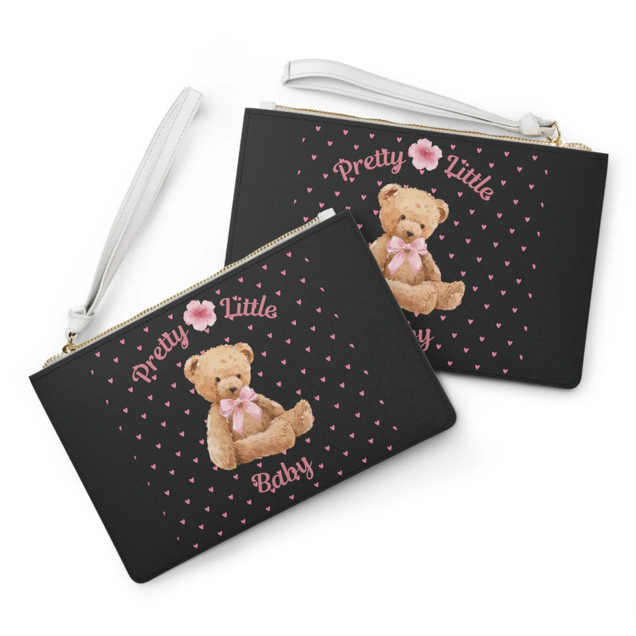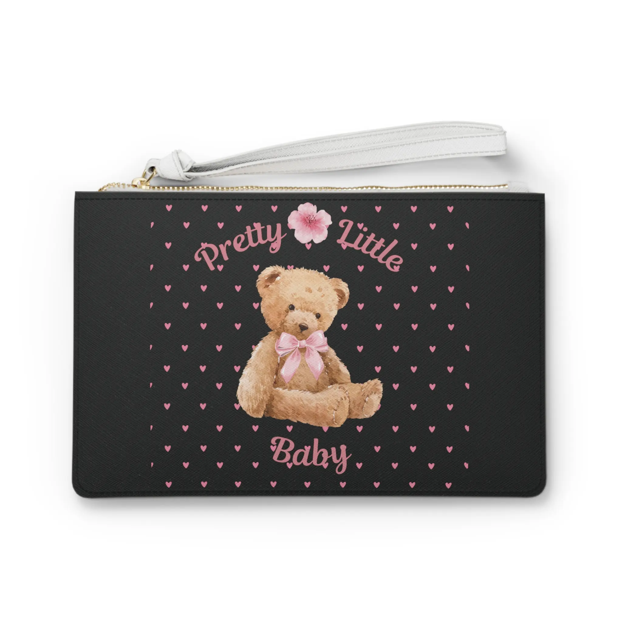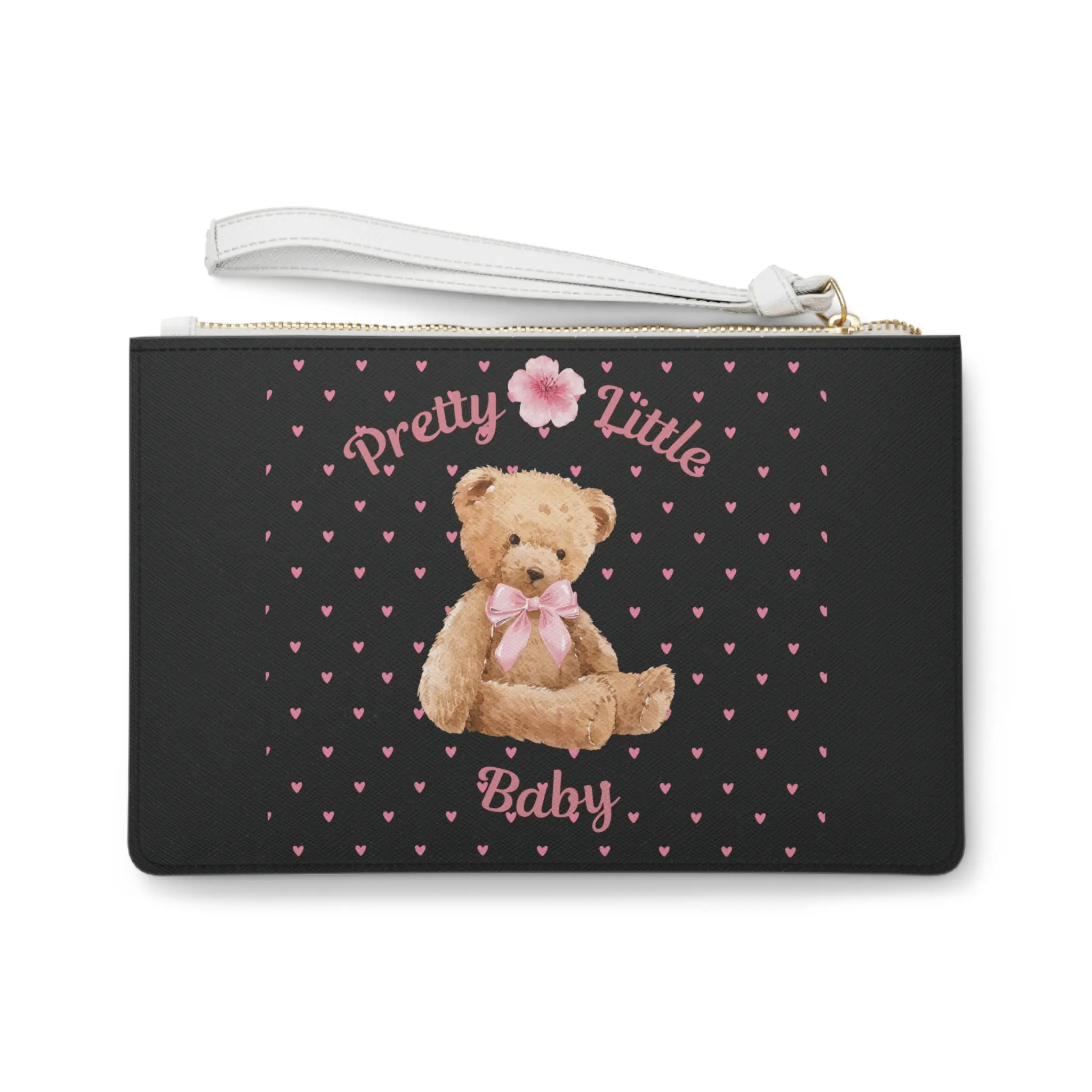 Soft, nostalgic, and just a little bit playful — this clutch brings childhood comfort into grown-up moments. A plush teddy sits at the center of a field of tiny pink hearts, framed by the gentle script, “Pretty Little Baby.” The saffiano-textured faux leather keeps the look refined while the gold-toned zipper and white wrist strap add a bright, modern touch. Inside, two compartments and a small pocket help tame small essentials so you can move through baby showers, casual brunches, or everyday errands with a sweet, sentimental accent.