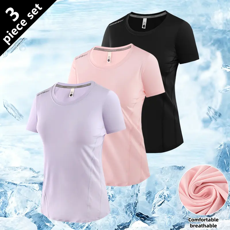 This ice-feel quick-dry sports T-shirt is perfect for women. It features breathable short sleeves and multiple color options. The ice-oxygen cooling fabric provides a built-in cooling effect, keeping you refreshed. Ideal for both static and dynamic movements, the high stretch seamless cut ensures zero restriction.