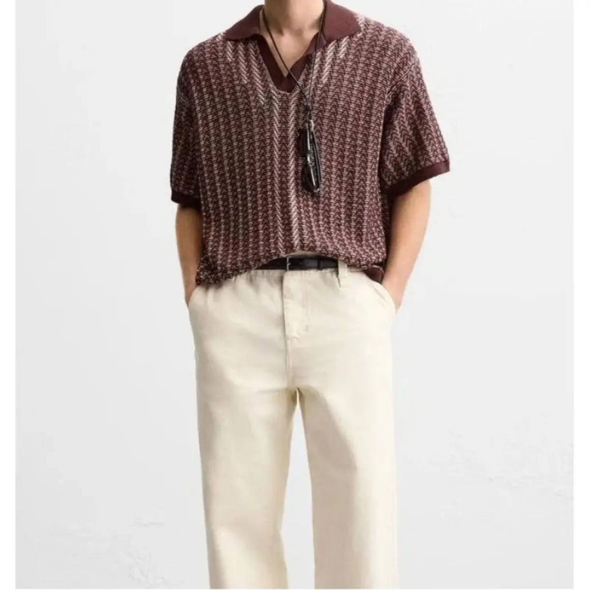 This men's brown chevron knit polo shirt features a unique chevron textured pattern, short sleeves, and a relaxed loose fit for ultimate retro casual comfort, paired with a contrast collar design that adds a stylish focal point and enhances the overall vintage aesthetic, crafted from soft and breathable knitted fabric to ensure lightweight comfort and breathability during warm weather, making it perfect for daily outings, casual gatherings, weekend trips, and relaxed everyday wear, while its versatile design easily matches with jeans, casual pants, chinos, and shorts to create a timeless, textured, and effortlessly fashionable look with a distinct retro charm.Material: High-quality