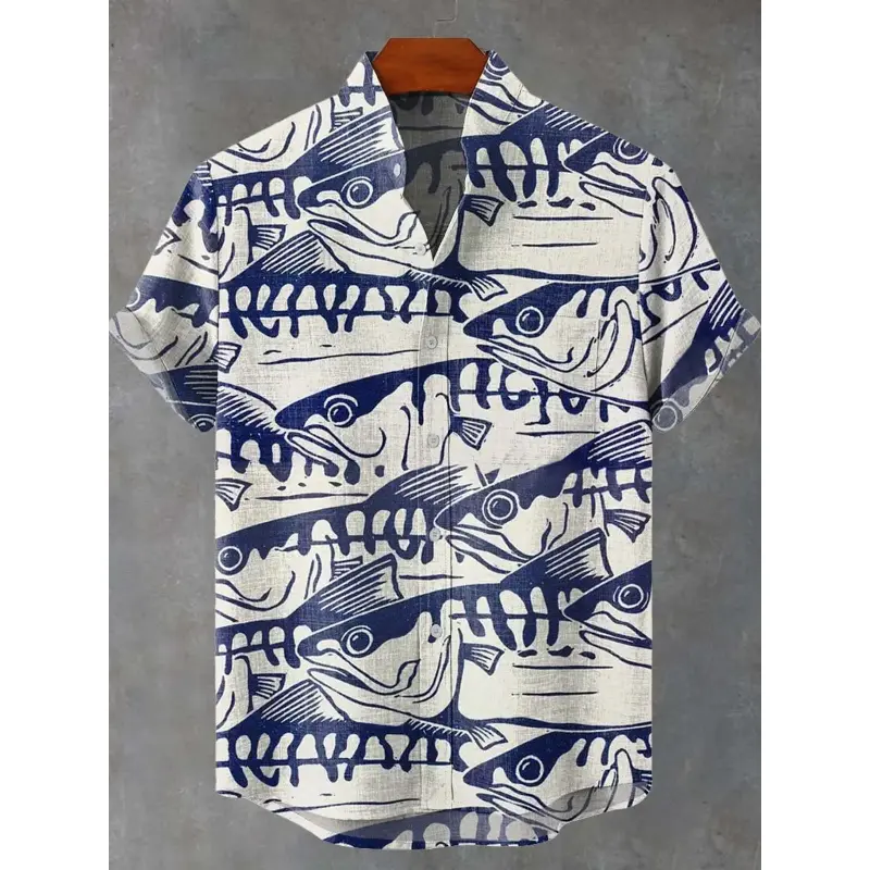 This men's short sleeve summer shirt is a brand-new collection designed especially for fishing enthusiasts, featuring eye-catching fish print patterns that highlight a distinctive outdoor fashion style. Made of soft and breathable linen fabric, it delivers excellent comfort and moisture absorption, keeping you cool and relaxed during long hours of outdoor fishing or summer casual wear. With a loose and lightweight cut, it offers great freedom of movement and a laid-back vacation vibe, perfect for fishing trips, outdoor activities, beach outings and daily leisure. This stylish and practical top easily pairs with casual shorts, linen pants or beach trousers, creating a comfortable, personalized and trendy summer look.Material: High-quality