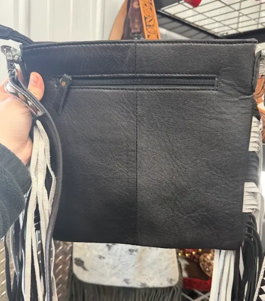 Genuine cowhide and hand tooled/painted leather crossbody bag with checkered fringe design and tooled strap
